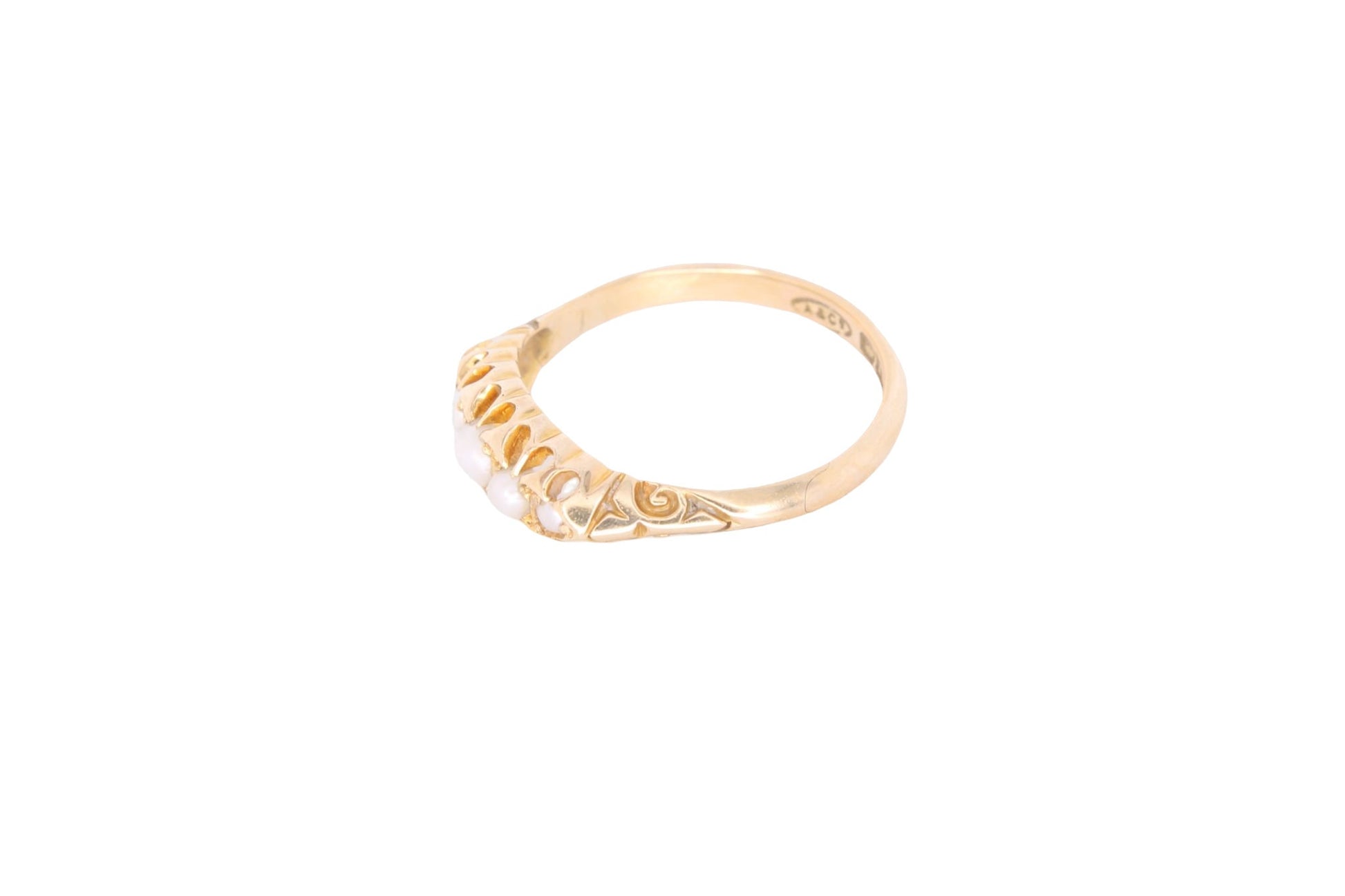 A pretty antique Edwardian 18ct gold pearl ring. The ring is in lovely condition and features 5 graduated pearls. The head of the ring is nicely detailed, making the pearls really stand out.