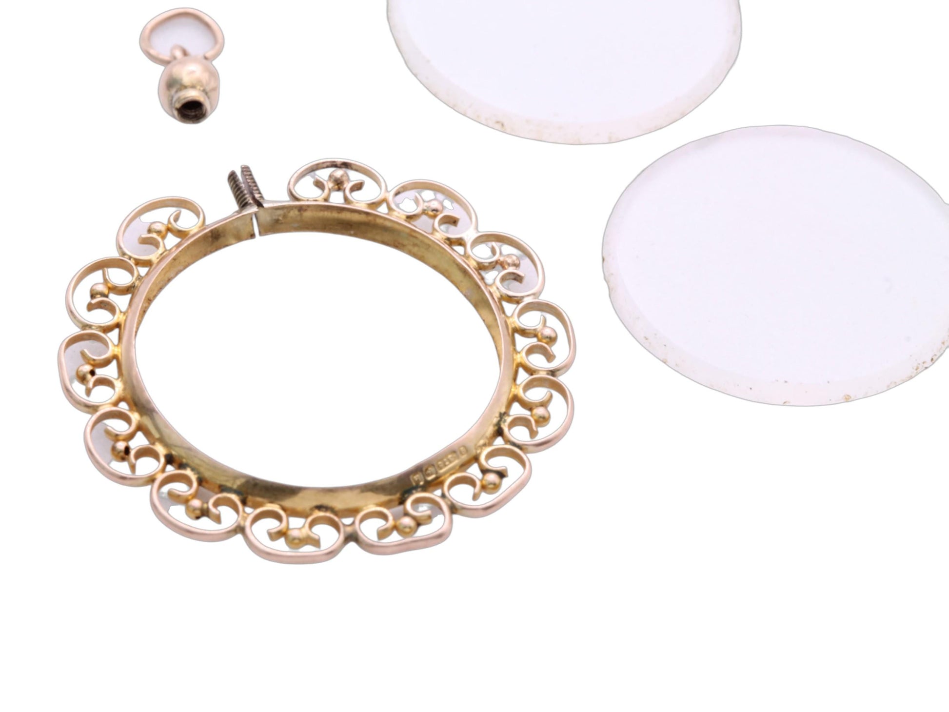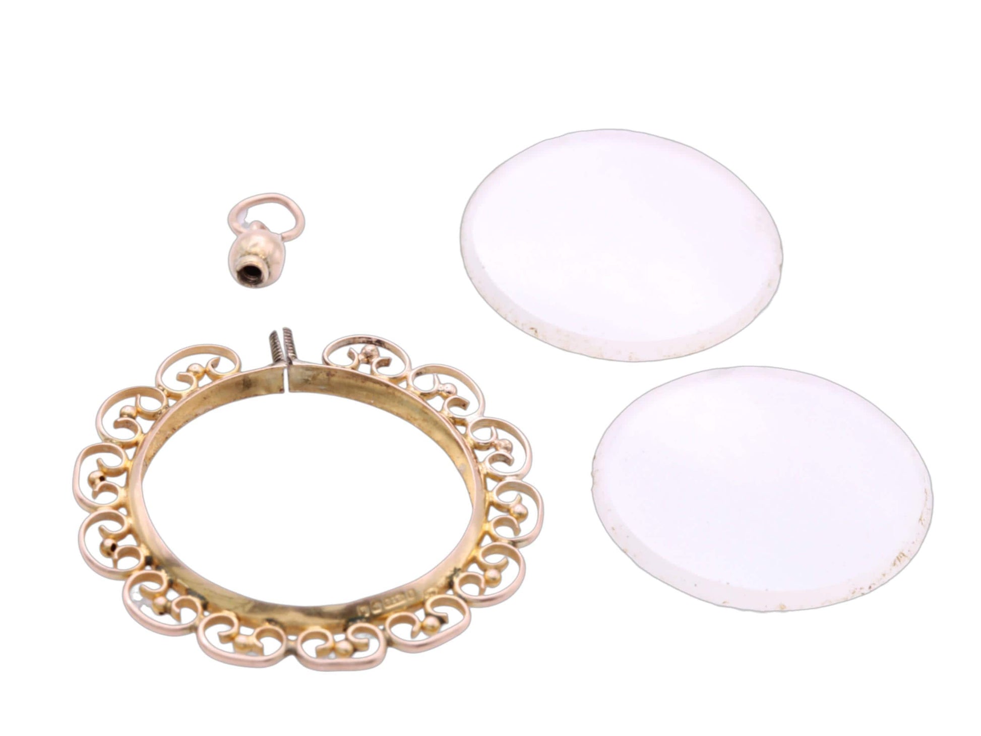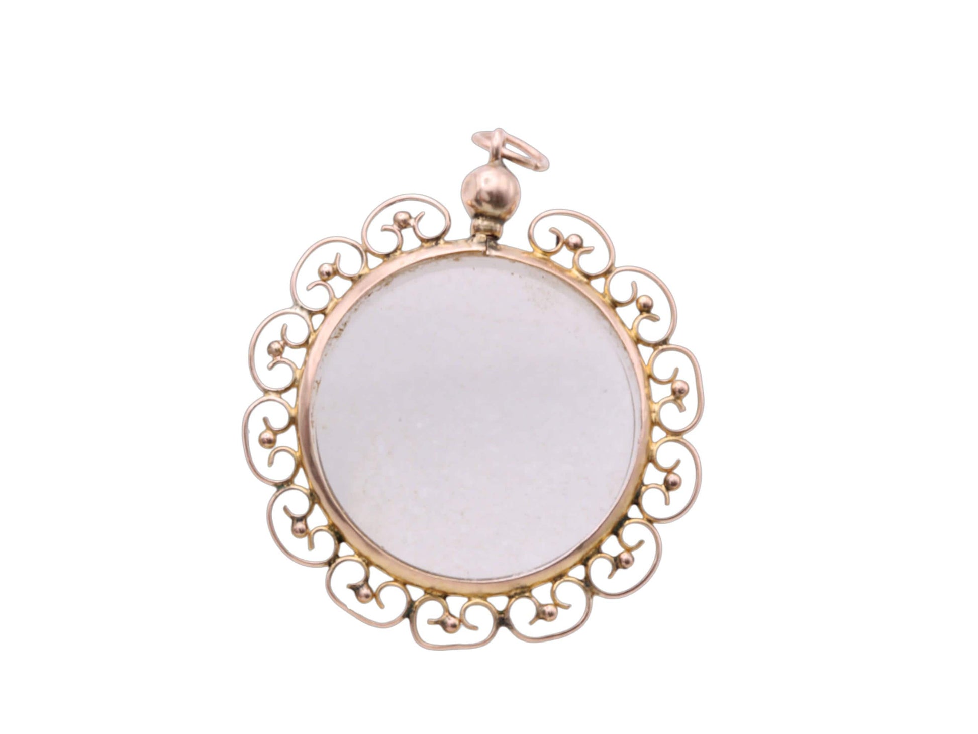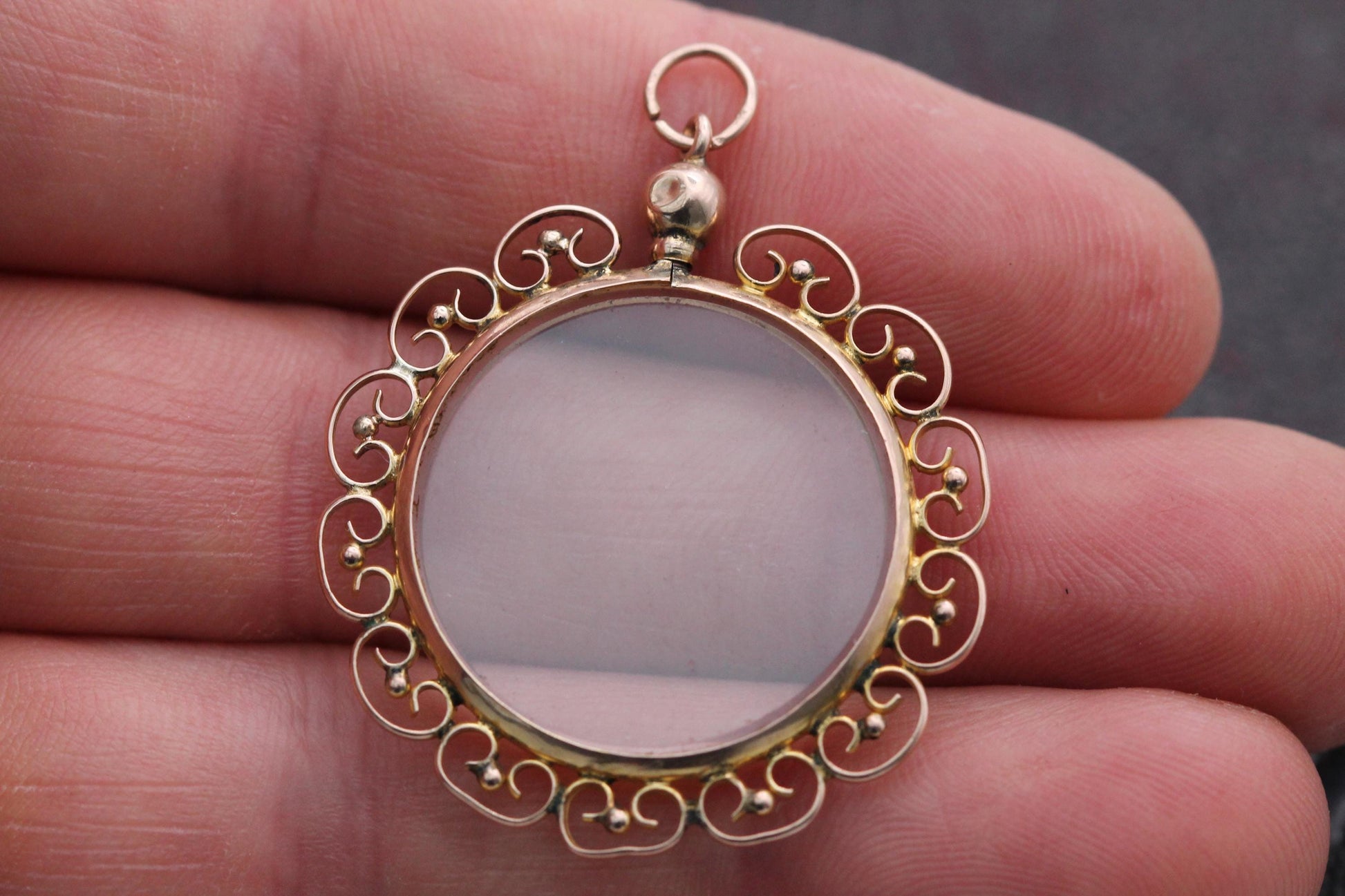An antique Edwardian 9ct gold glass locket, beautifully crafted with two clear glass panels framed by an intricate gold mount. The top section gently unscrews, allowing the mount to separate so the glass panels can be removed — a thoughtful design that once held a cherished photograph or keepsake close to the heart.