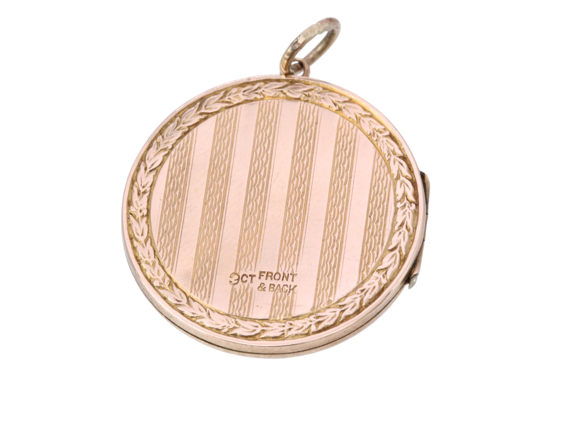 Marked '9ct gold back & front'. Both panels are made of 9ct (9ct front and back) however other parts of the locket will be a base metal.