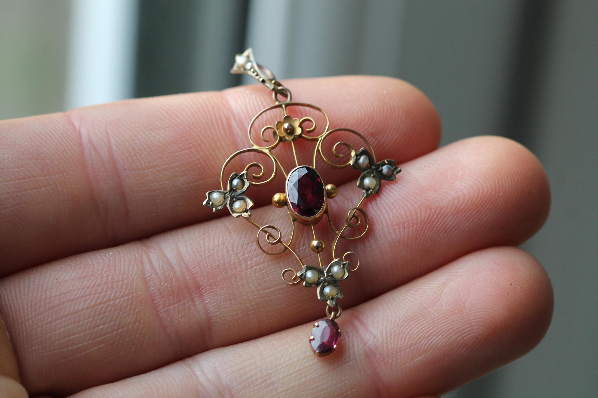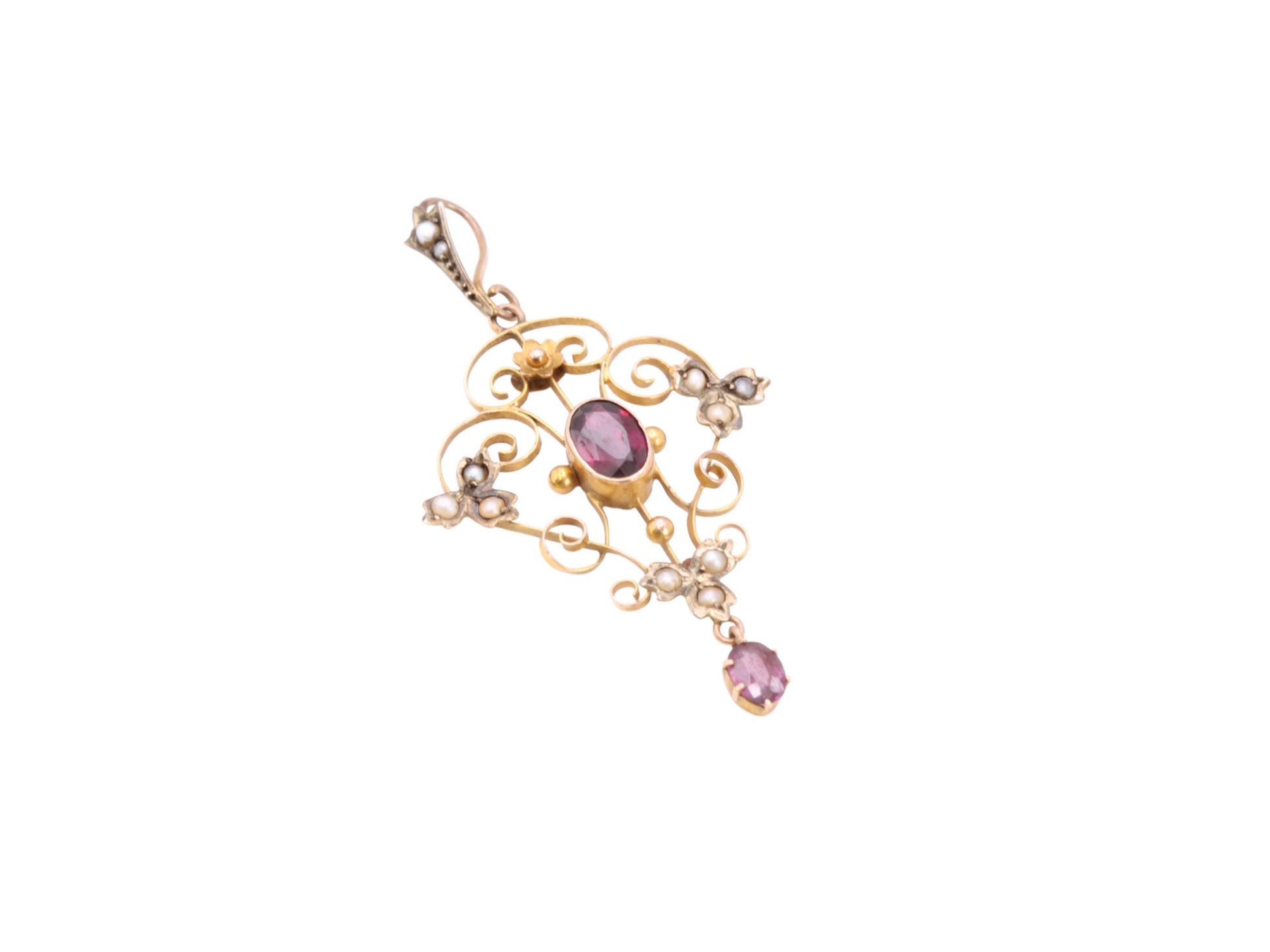 A beautiful Edwardian Art Nouveau pendant crafted in 9ct gold, displaying the flowing, organic lines so characteristic of the era. The openwork frame is delicately shaped with graceful scrolls and centred with a rich, deep-red garnet in an oval cut, complemented by a further garnet drop that adds elegant movement. Clusters of lustrous seed pearls sit at each side and along the base, softening the design and enhancing its romantic feel. A tiny gold flower sits proudly at the top, completing the piece with charming detail.