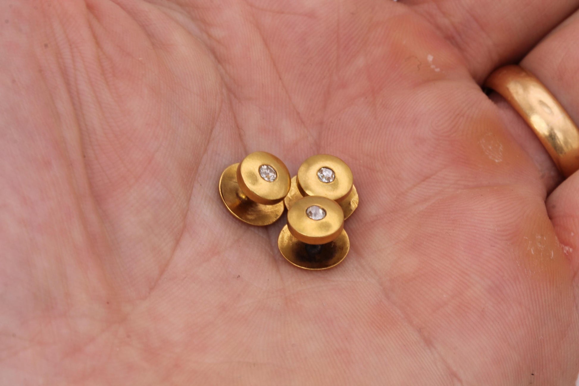 A French antique set of three shirt studs in 18ct gold, dating to c.1890. Each stud is centred with a sparkling old mine-cut diamond measuring approximately 0.03ct, adding a subtle yet refined brilliance. Crafted in rich yellow gold, the studs are stamped with the French eagle head hallmark for 18ct gold. Offered in lovely condition, this elegant set is a fine example of late 19th-century French craftsmanship and would make a distinguished addition to any collection.