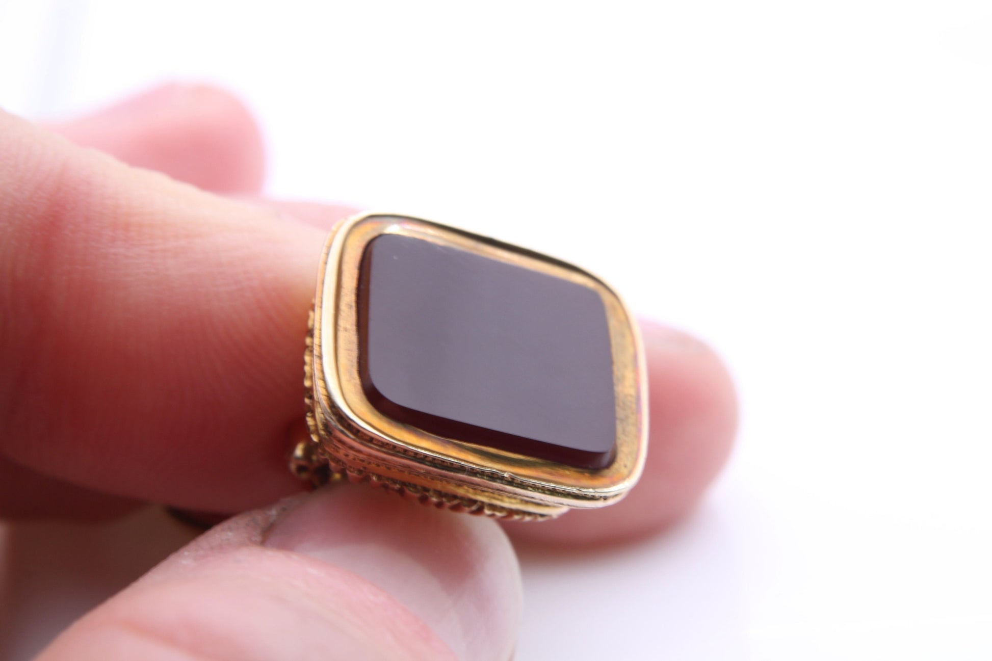 The fob has a pretty dark red carnelian which is set to the base. The detailing and craftsmanship which this piece portrays is exquisite.
