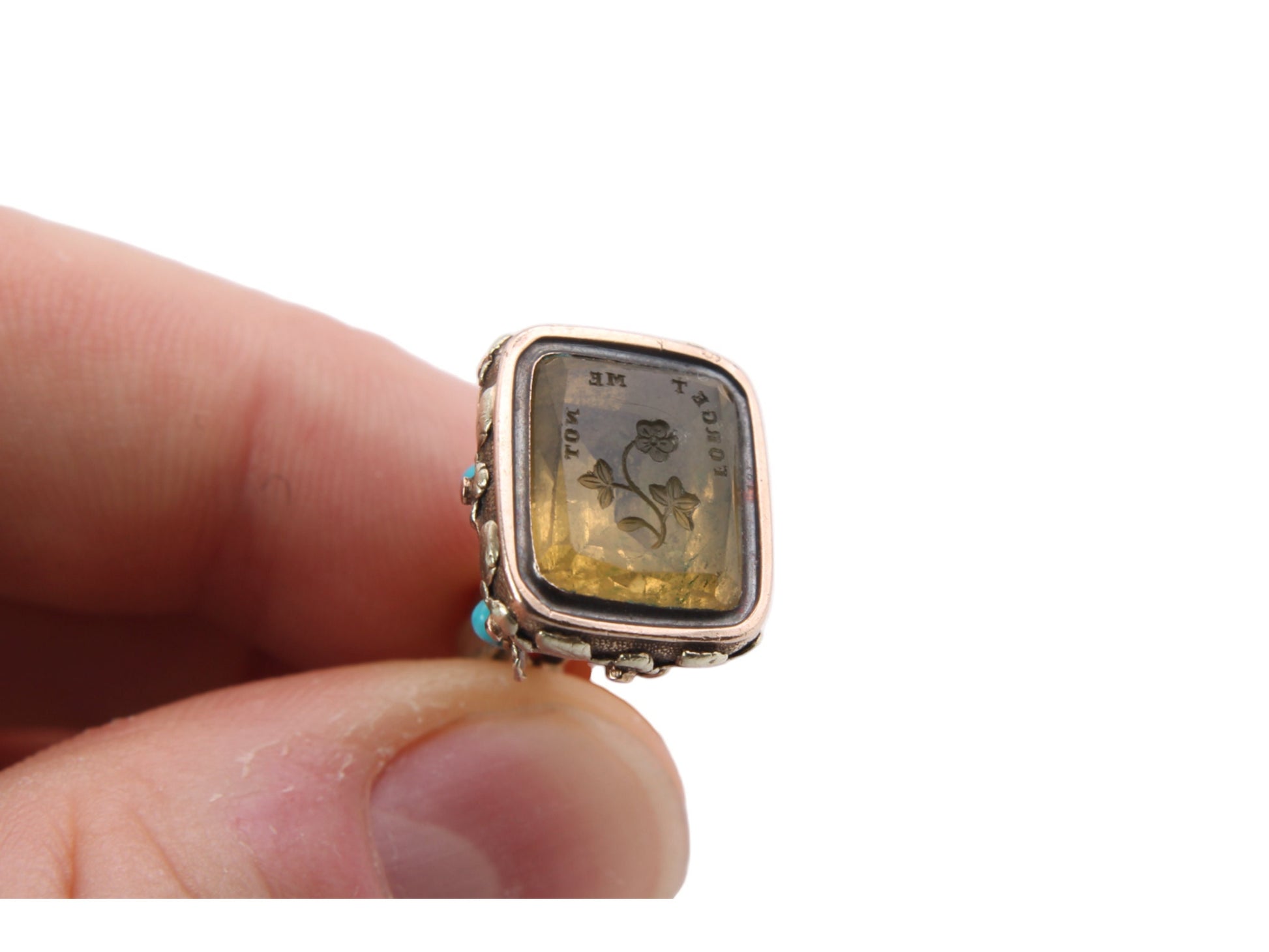 The base features a citrine, which has a stunning carved forget me not flower with the words 'Forget Me Not' arcing around it. A very sweet antique which has so much meaningingful character and charm.