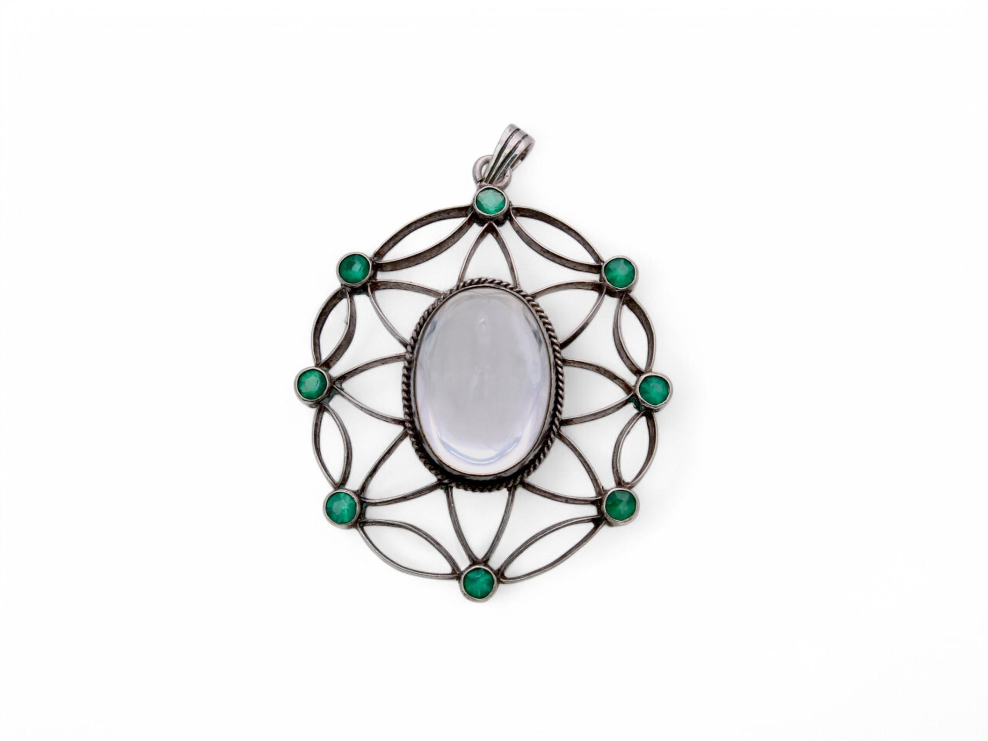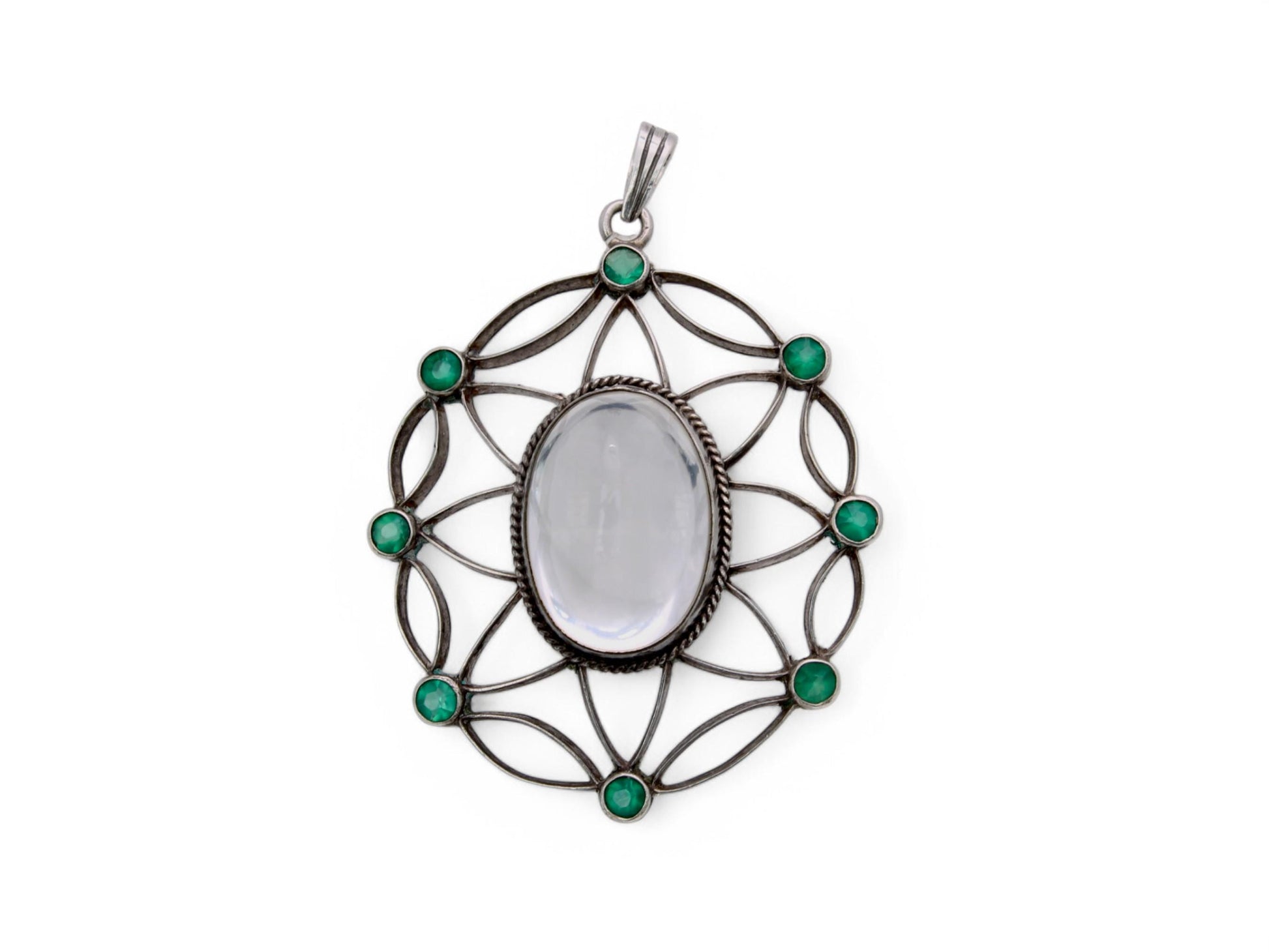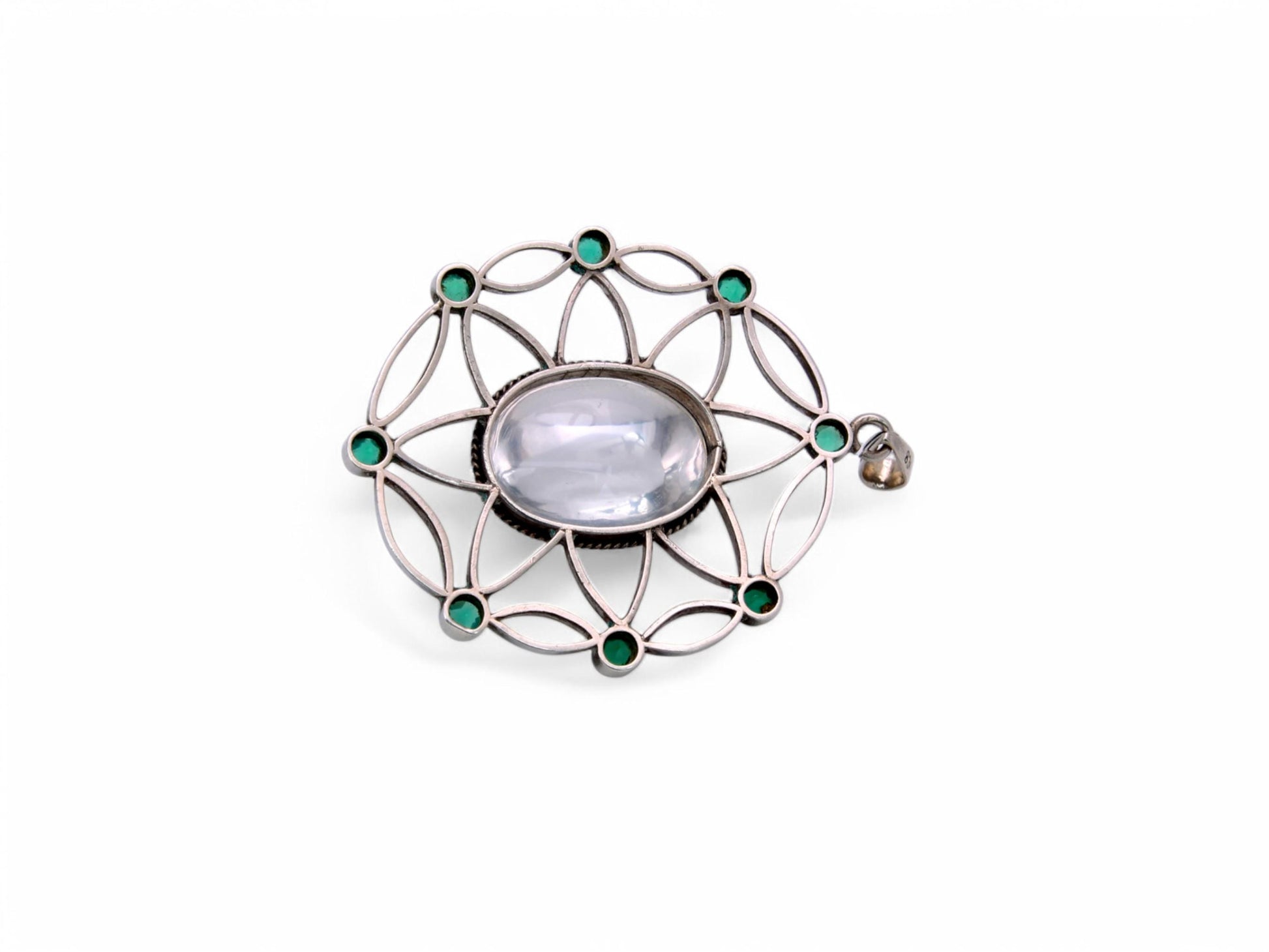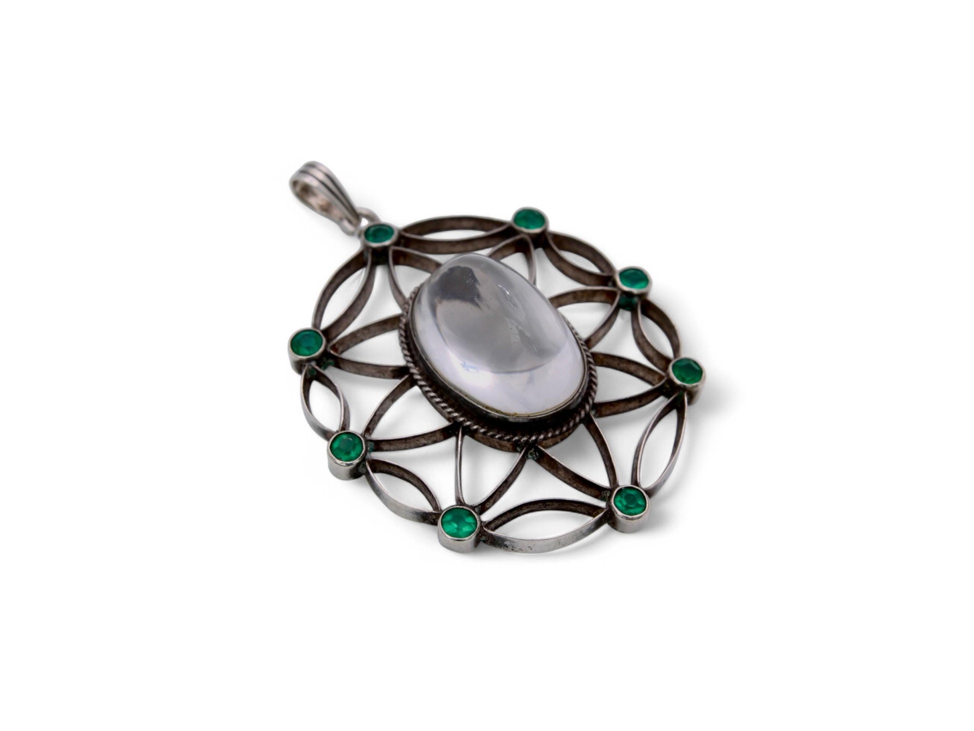 This exquisite antique Scandinavian pendant, crafted from 830 silver, dates to circa 1900. At its center sits a stunning domed milky rock crystal, beautifully catching the light with its natural translucence. Surrounding it are vibrant green paste stones, expertly set to enhance the pendant's elegance and charm.