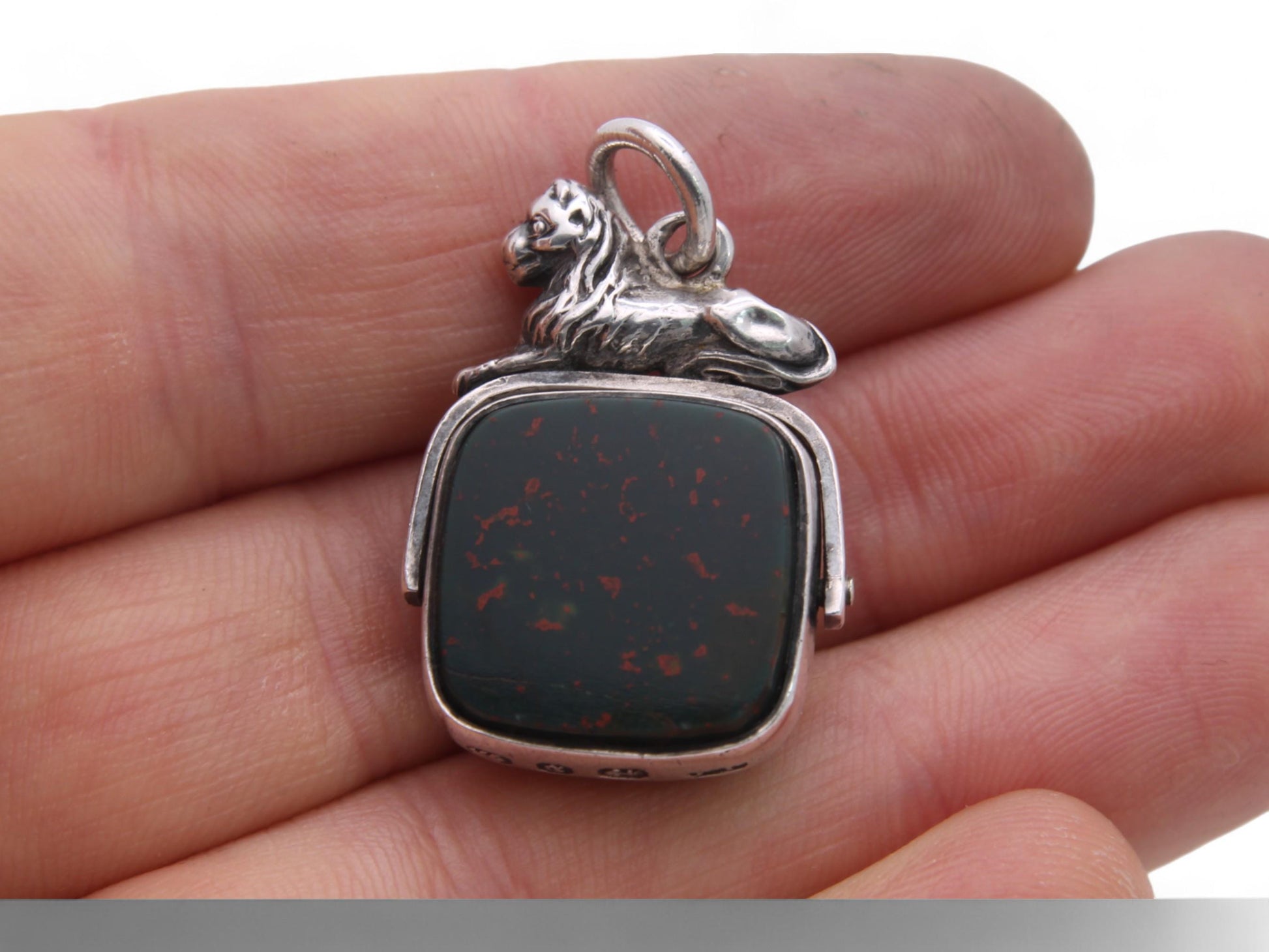 This exquisite piece features a noble lion mount atop the pendant, symbolizing strength and courage. It features two stunning gemstones: a deep, rich bloodstone on one side and a warm, earthy carnelian on the other, offering versatility and timeless elegance.