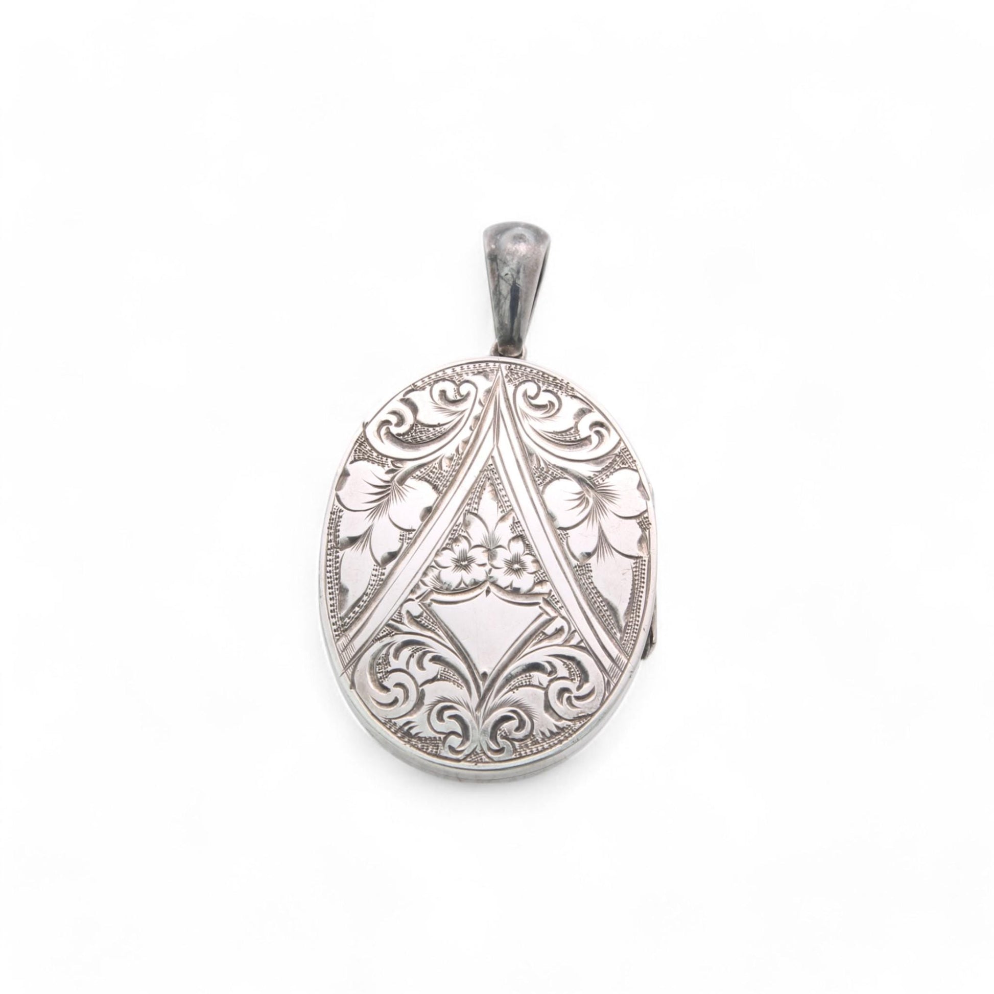 The front of the locket showcases these elegant initials, while the back is beautifully chased with intricate floral detailing, including delicate forget-me-not flowers, symbolizing remembrance and enduring affection. The craftsmanship of this piece reflects the intricate artistry and sentimentality of the period. Perfect for those who appreciate antique jewellery with a deep, personal meaning, this locket provides a meaningful way to carry cherished memories close to the heart.