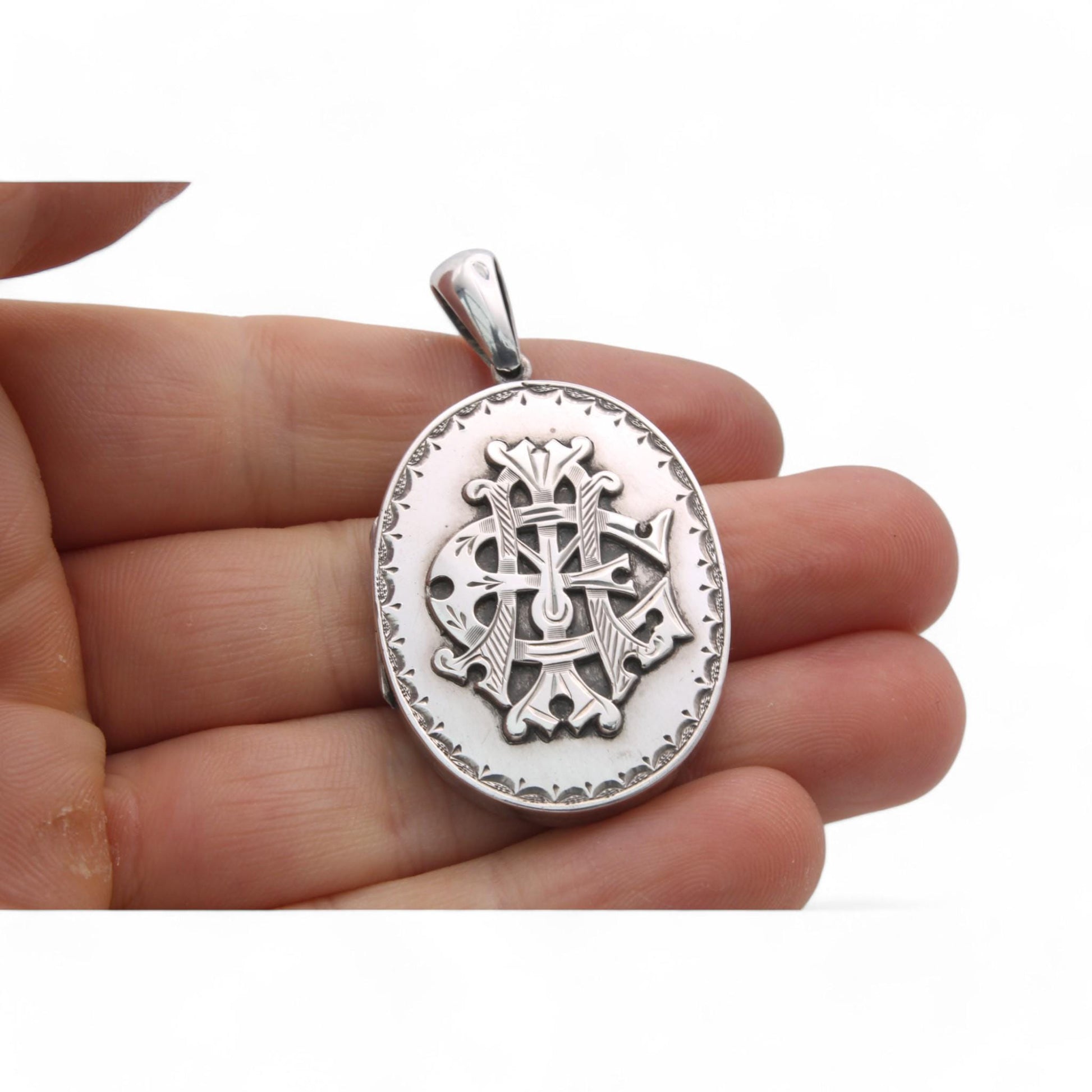 This exquisite antique sterling silver locket, dating back to the Victorian era, features the intertwined initials "AEI," symbolizing "Amity, Eternity, and Infinity." These meaningful words represent enduring friendship, eternal love, and timeless connection, making this locket a sentimental piece rich with history.