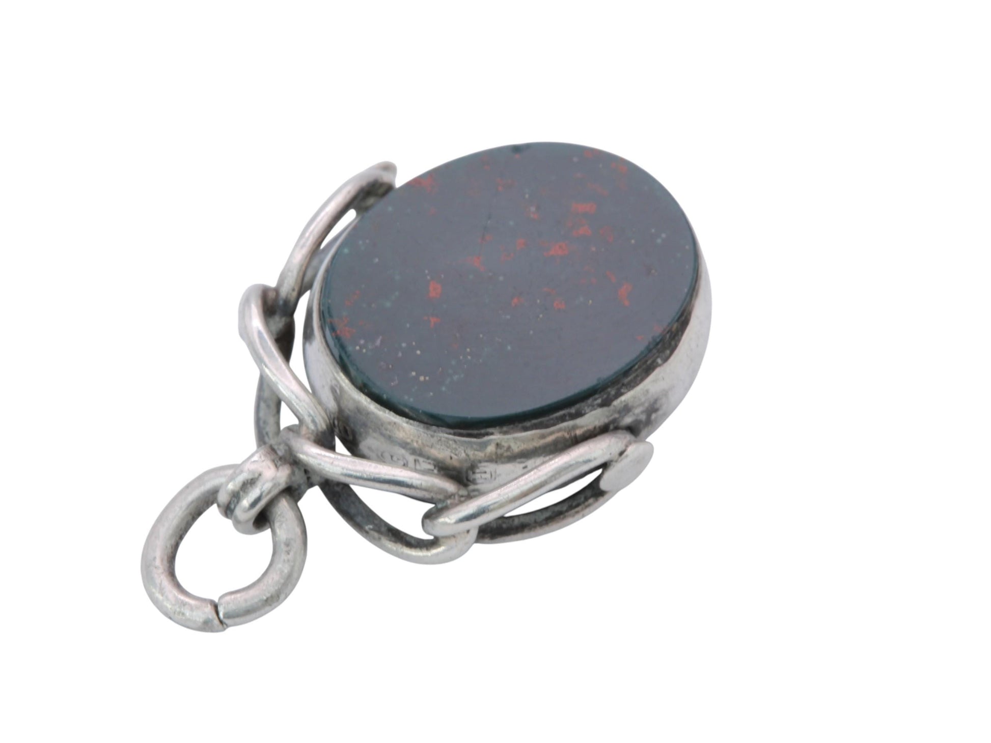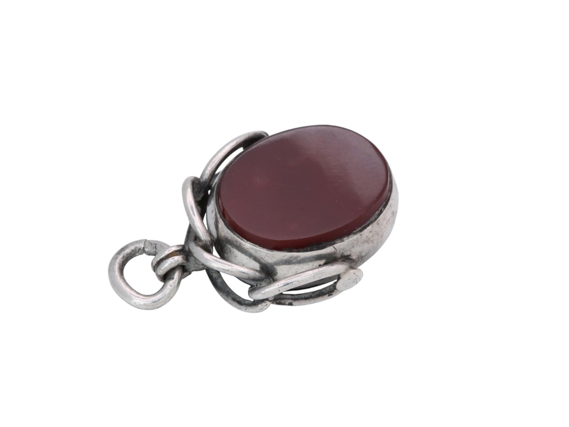 A fabulous antique sterling silver spinner pendant, set with a deep bloodstone on one side and a rich carnelian on the reverse. The double-sided design allows the fob to turn freely within its frame, a feature both tactile and elegant, much admired during the Victorian era.