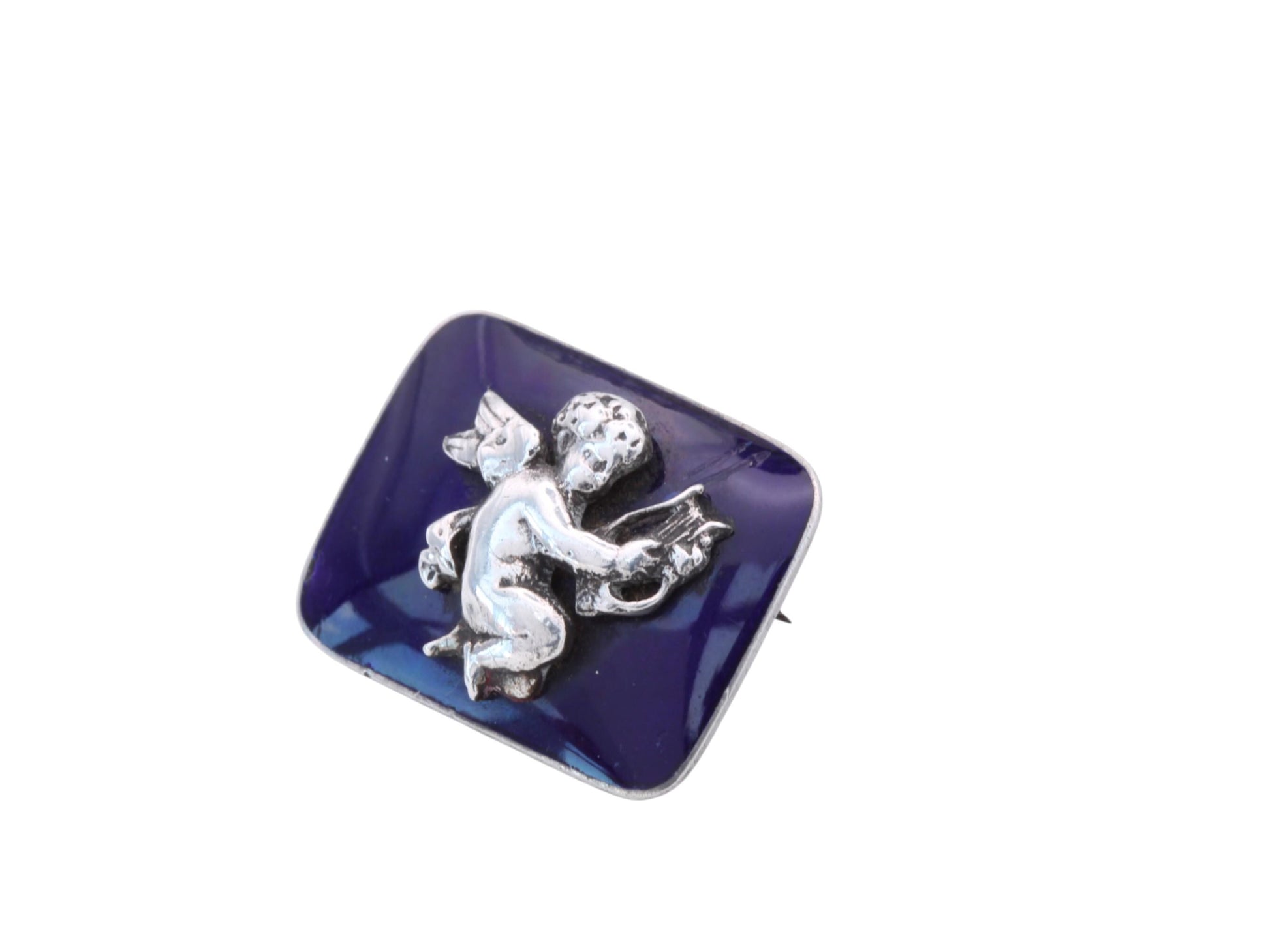 An antique sterling silver brooch adorned with soft blue enamel to the front and a beautifully detailed applied silver cherub holding a small harp. The enamel has survived wonderfully with only a few light surface marks, none missing — remarkable for its age.