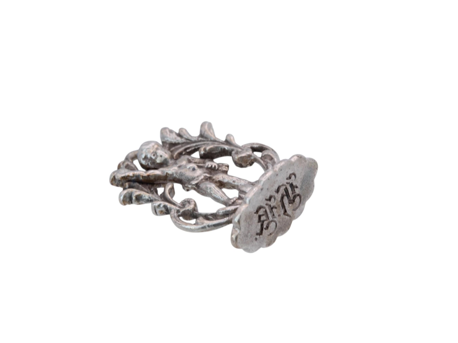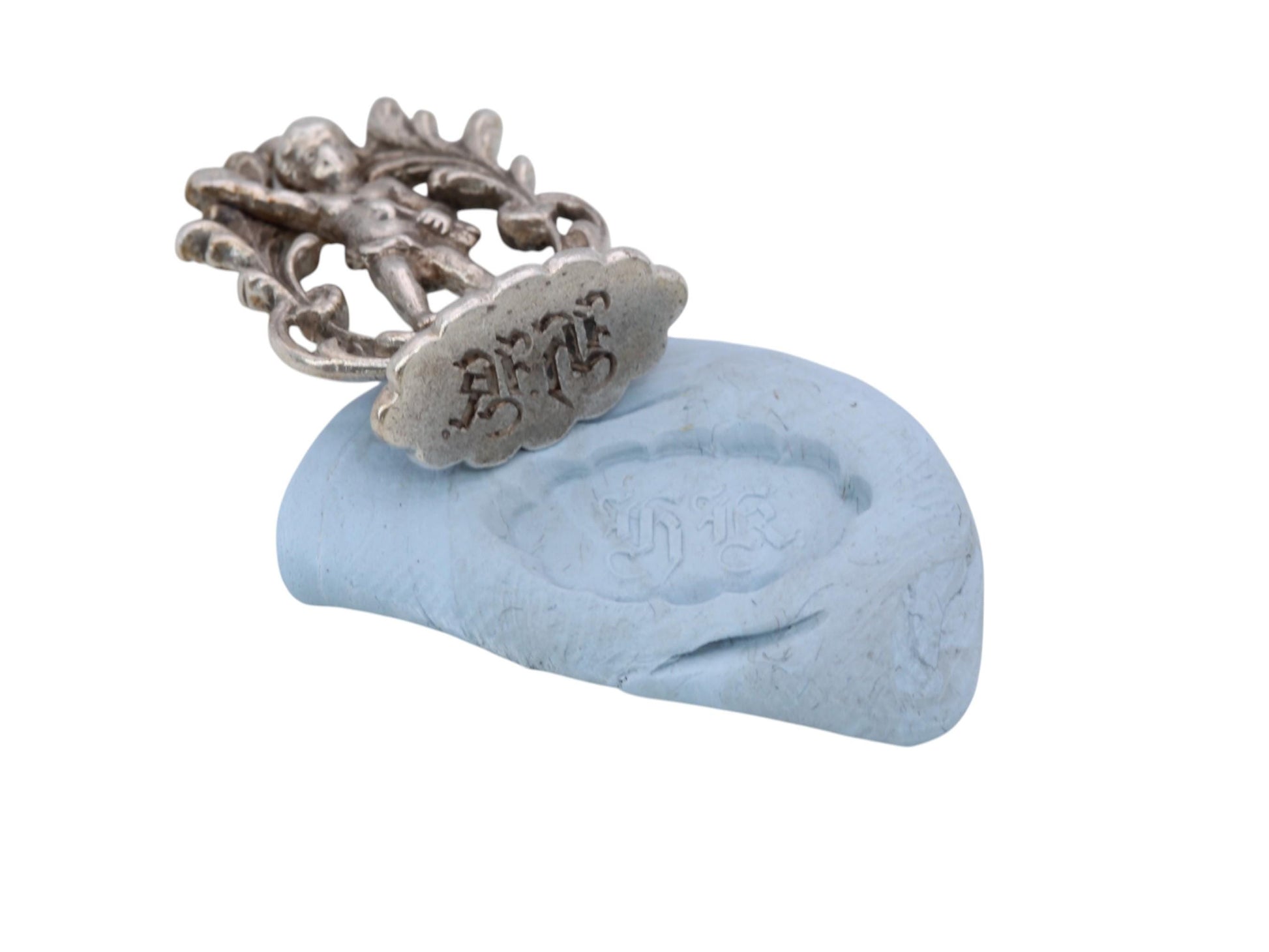 A superb and highly sculptural antique sterling silver pendant, dating to the late Victorian period. The piece is cast in an expressive three-dimensional form, depicting Cupid in a triumphant pose, holding an arrow and a laurel branch. This striking figural element is masterfully framed within an intricate, detailed acanthus leaves. The entire motif is mounted on a substantial base. The underside of the base is definitively engraved with Gothic style initials, a characteristic of period personalization.