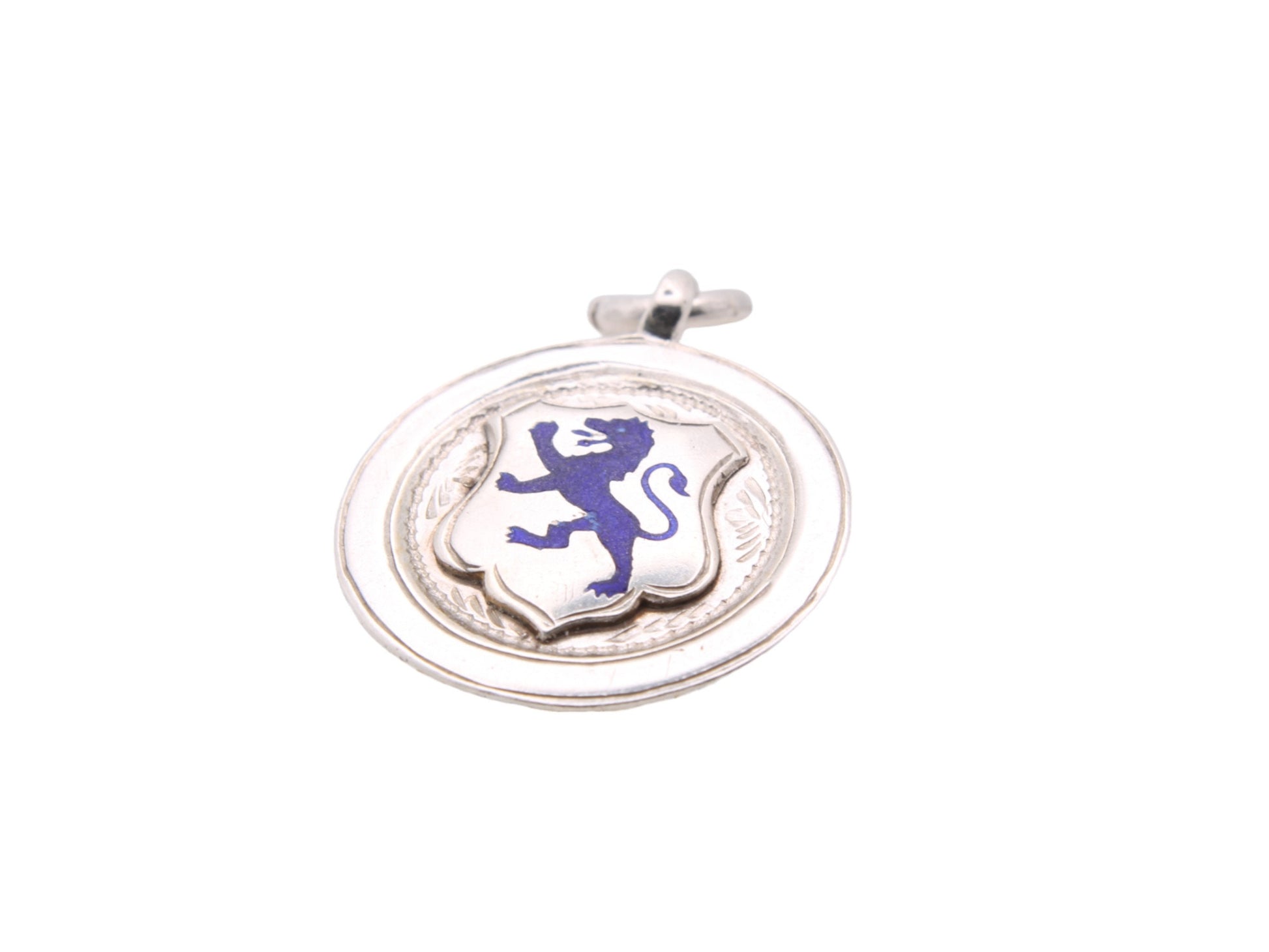 A majestic antique sterling silver pendant featuring a lion rampant, expertly crafted with vibrant blue enamelling. This exquisite piece of jewellery embodies strength and bravery, making it a perfect symbol of power and courage.