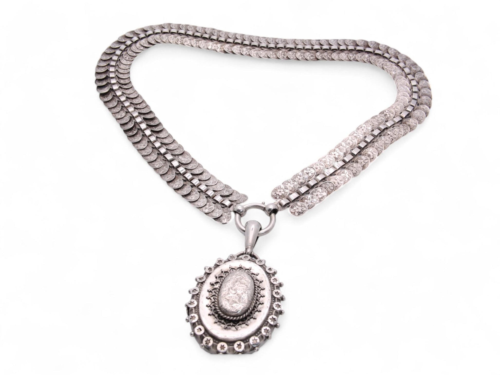 Antique Sterling Silver Forget Me Not Collar Necklace And Locket, 17.75"