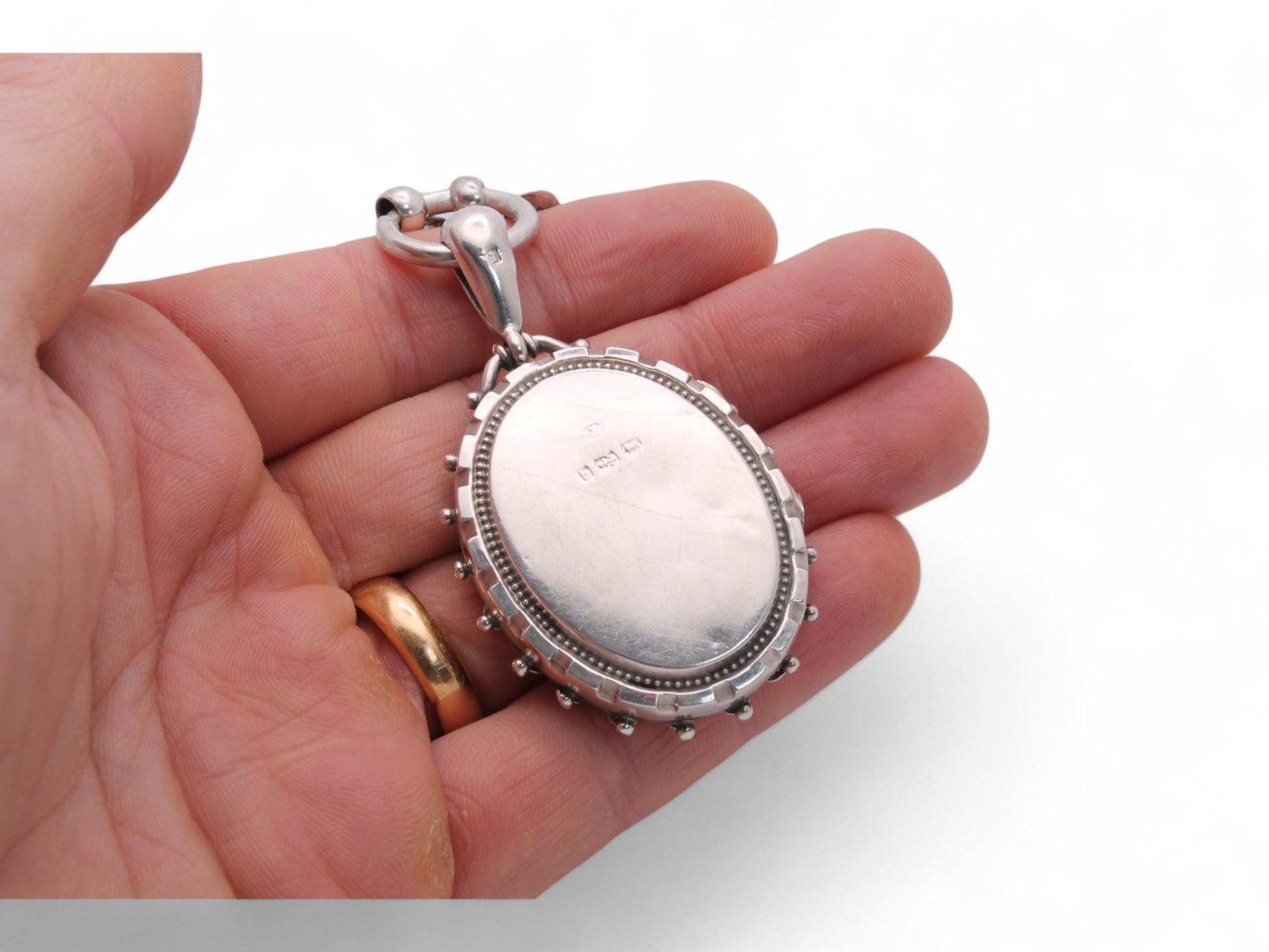 This captivating antique sterling silver collar necklace offers an elegant blend of craftsmanship and beauty. Each link of the chain is adorned with intricately chased Forget-Me-Not flowers, creating a delicate and romantic design. The necklace is secured with a large silver bolt clasp, ensuring both durability and ease of wear, while also securing the stunning locket.