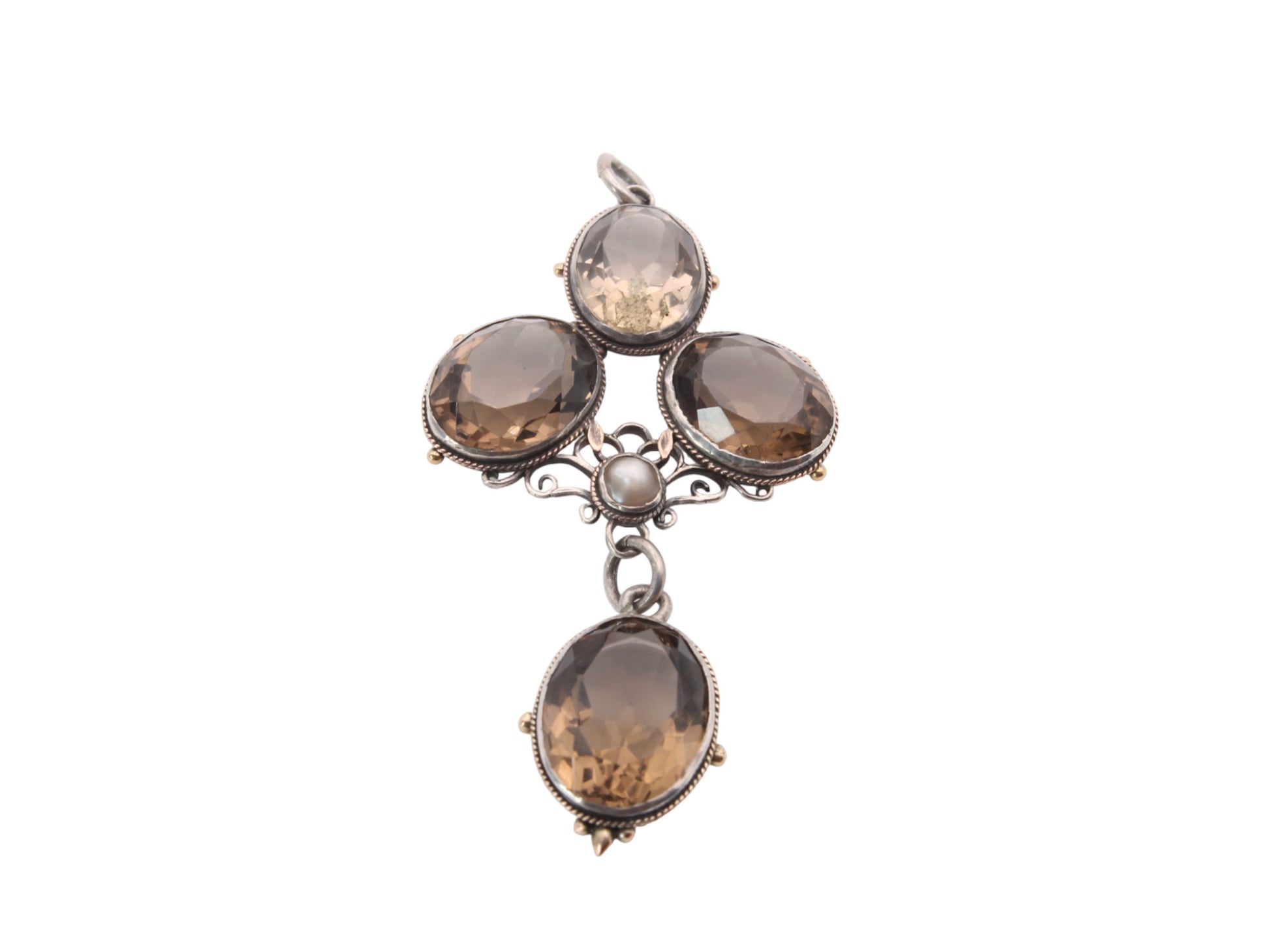 The center features a captivating seed pearl, nestled amidst the citrines, creating a harmonious balance of textures and tones. The sterling silver setting, meticulously crafted, provides the perfect backdrop for this vintage charm that resonates with the grandeur of the Victorian era.