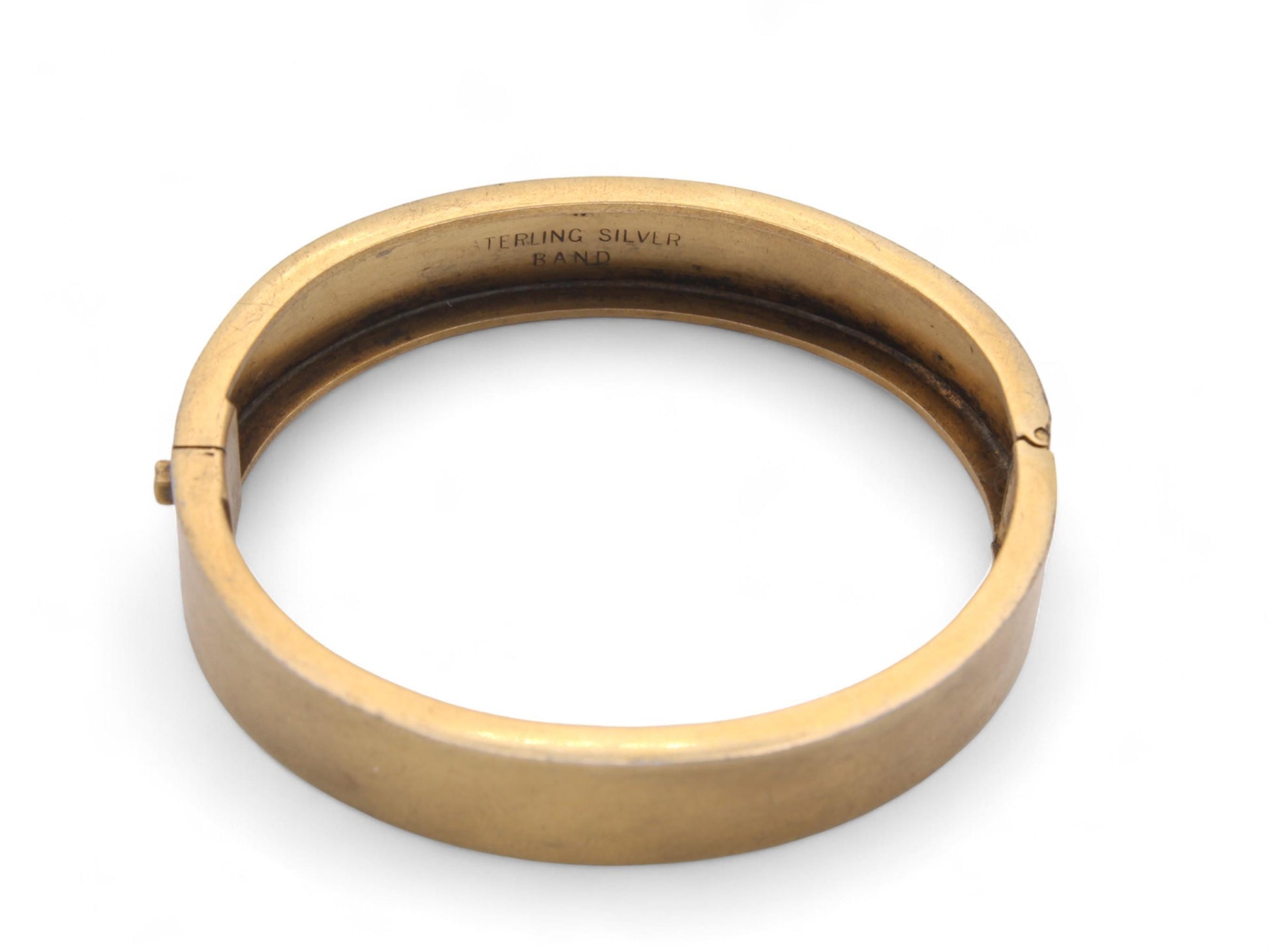 The bangles sterling silver is gently gilded, adding a warm, luxurious glow that enhances the intricate detailing of the carved scene.