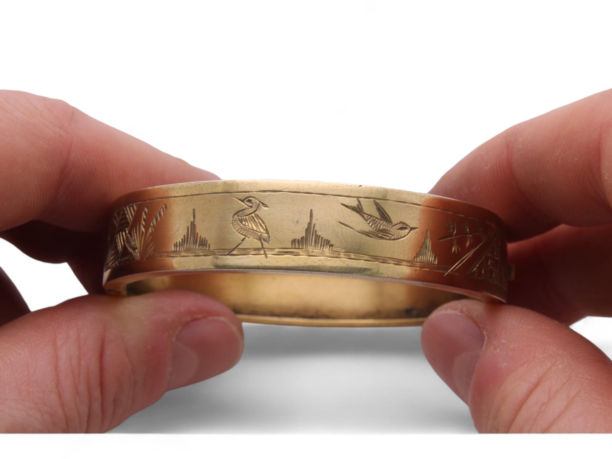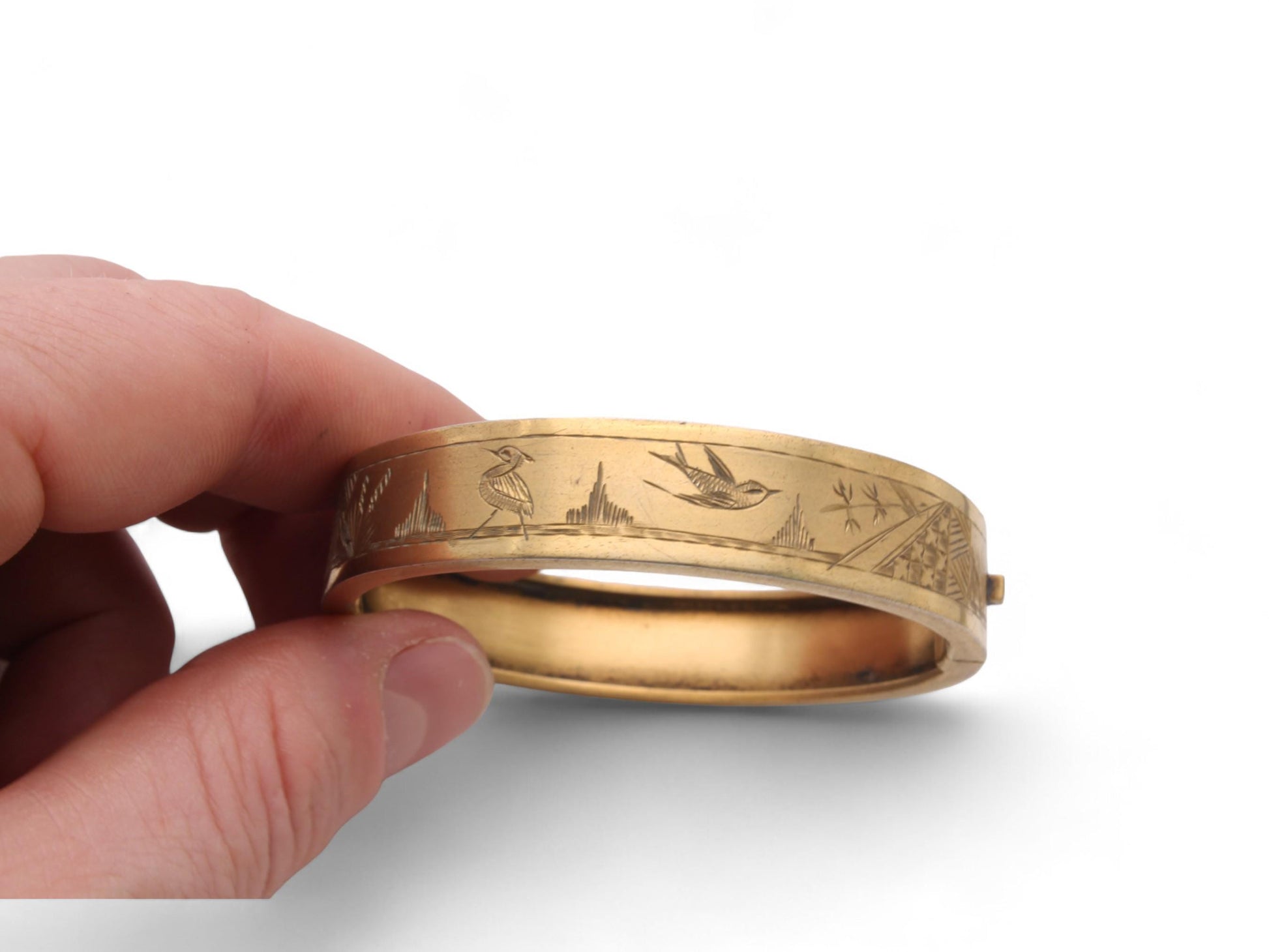 Introducing an exquisite antique sterling silver gilt bangle that showcases remarkable artistry and timeless elegance. This beautiful piece is adorned with a meticulously carved scene depicting two swallows, a symbol of love and freedom. One swallow is captured in graceful flight, while the other stands poised, creating a dynamic and captivating tableau.