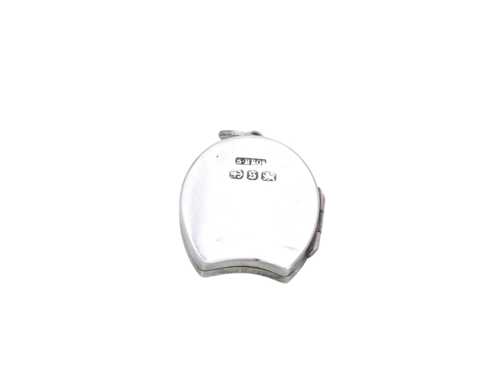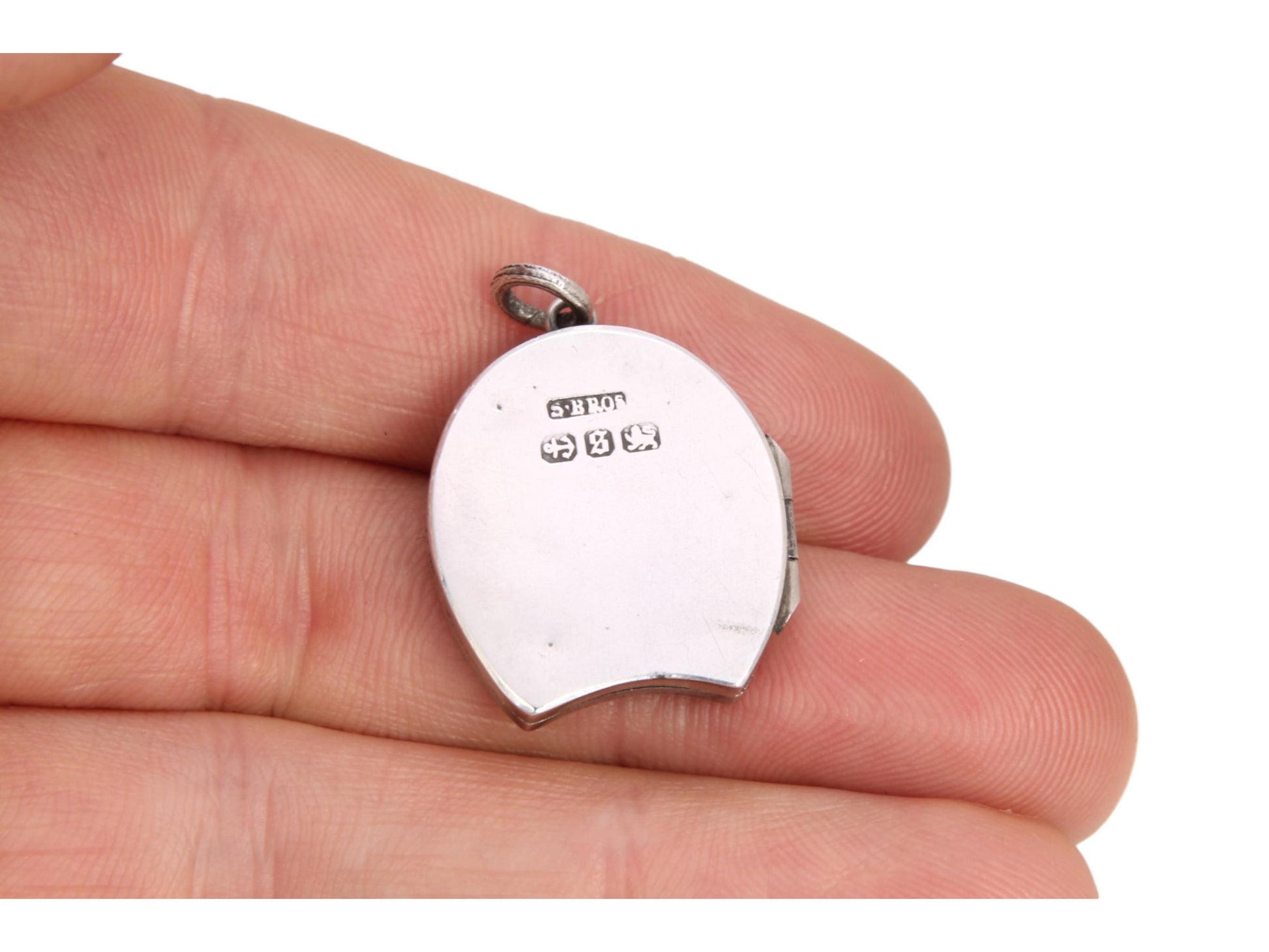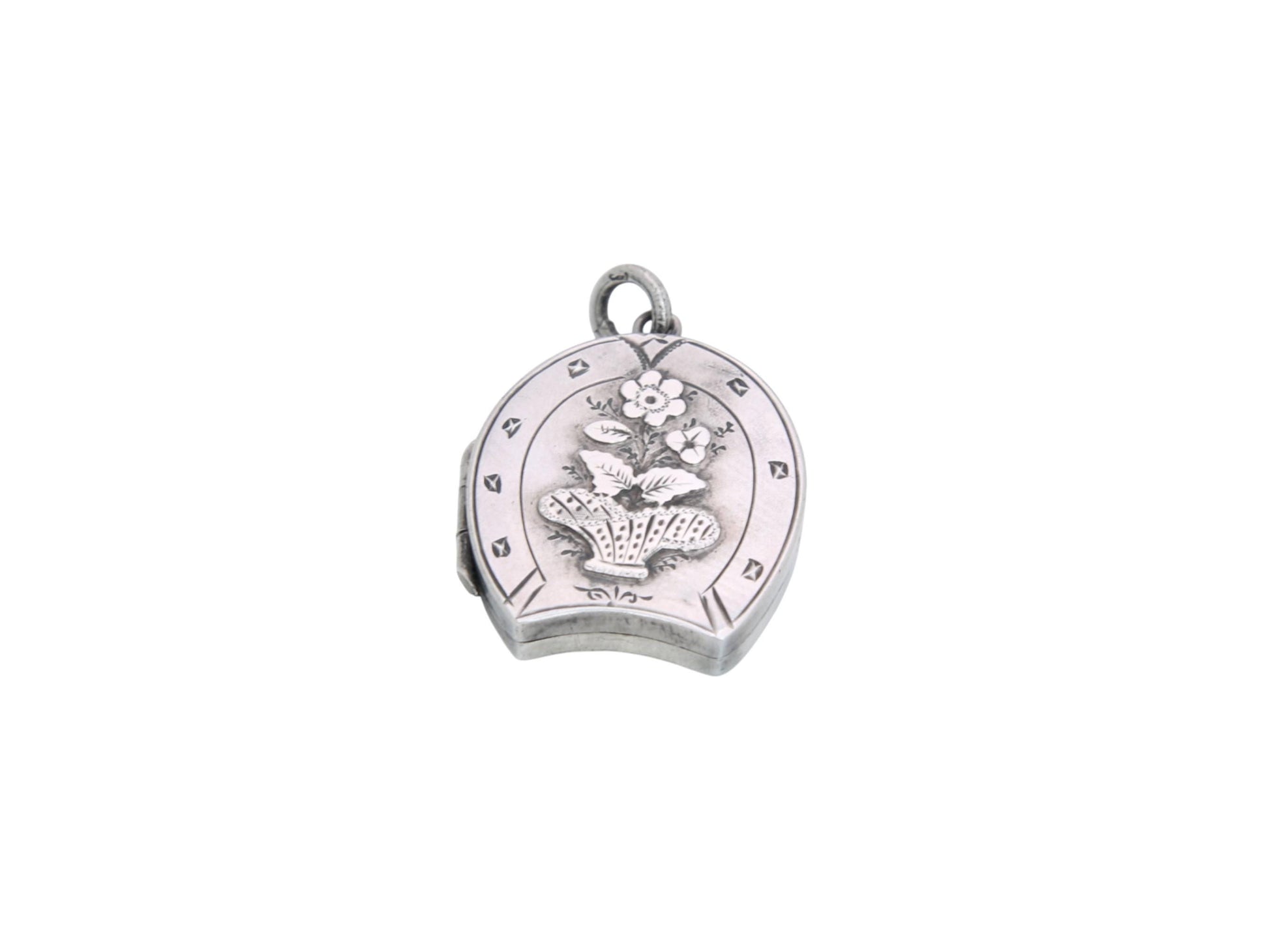 A beautifully sentimental antique sterling silver locket crafted in the shape of a horseshoe, dating to 1892. The front features a raised bouquet of forget-me-not flowers symbolising enduring love and remembrance. This unique locket opens to reveal two glass panels for keepsakes or photographs, making it both decorative and deeply personal.