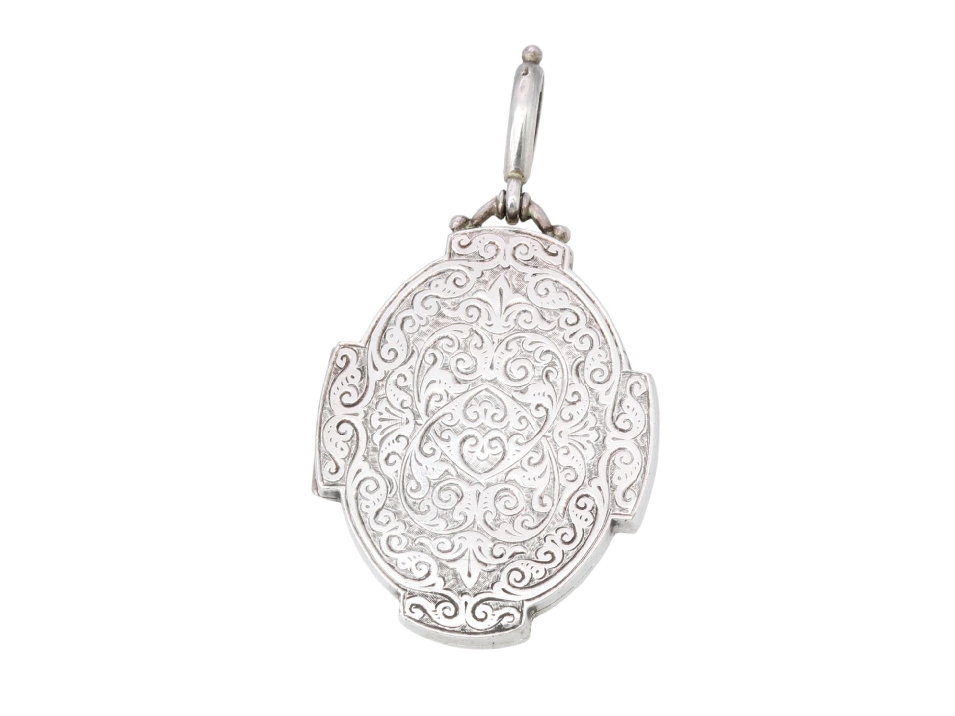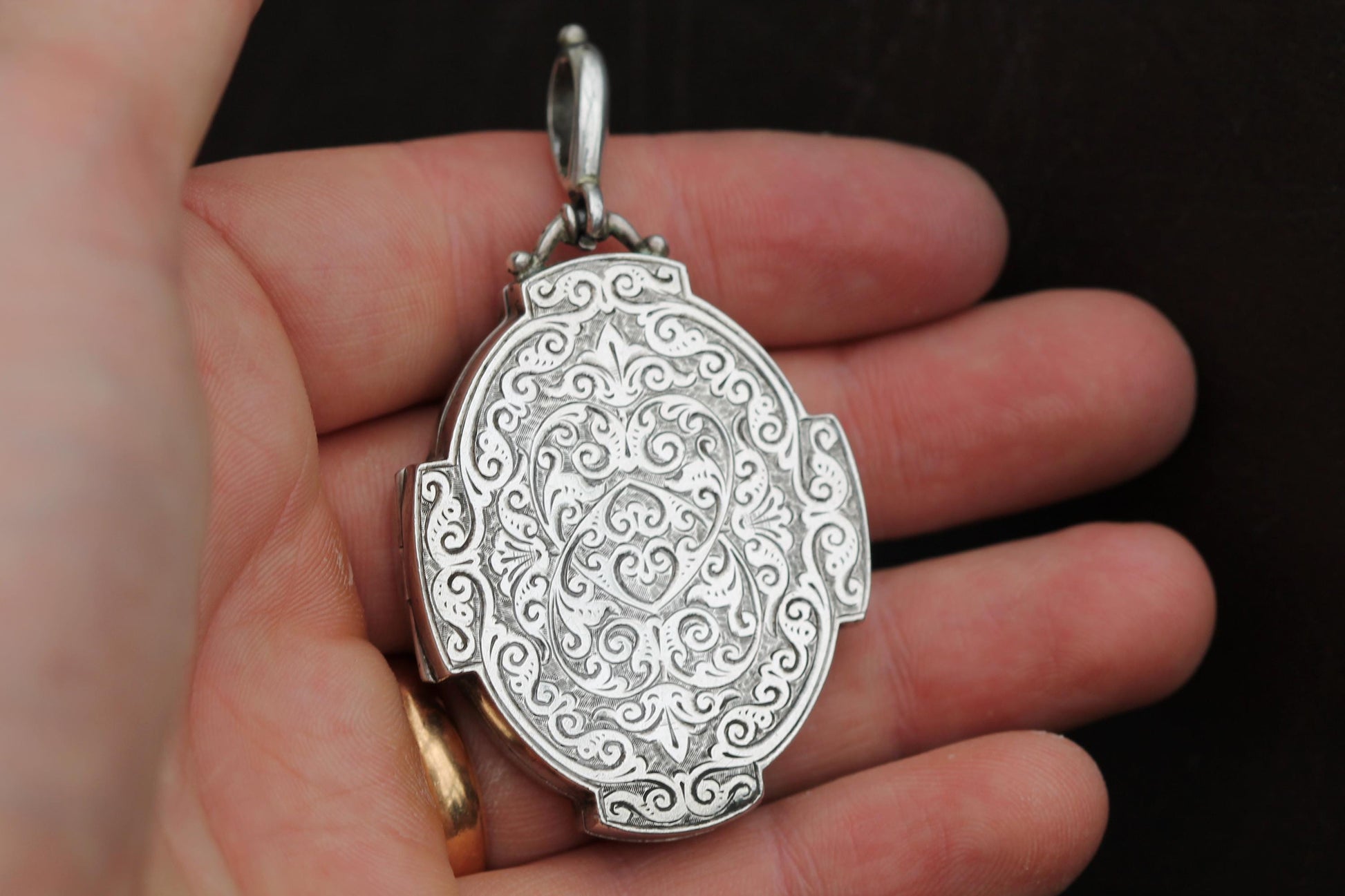 An antique Victorian sterling silver locket, beautifully chased with a rich foliate motif on the front. The intricate engraving seems to breathe with life, as if telling stories of the hands that once held it. Inside, both original inserts and acrylic panels remain, ready to carry a cherished photograph or keepsake, keeping loved ones close to the heart. Large in size and in lovely condition.