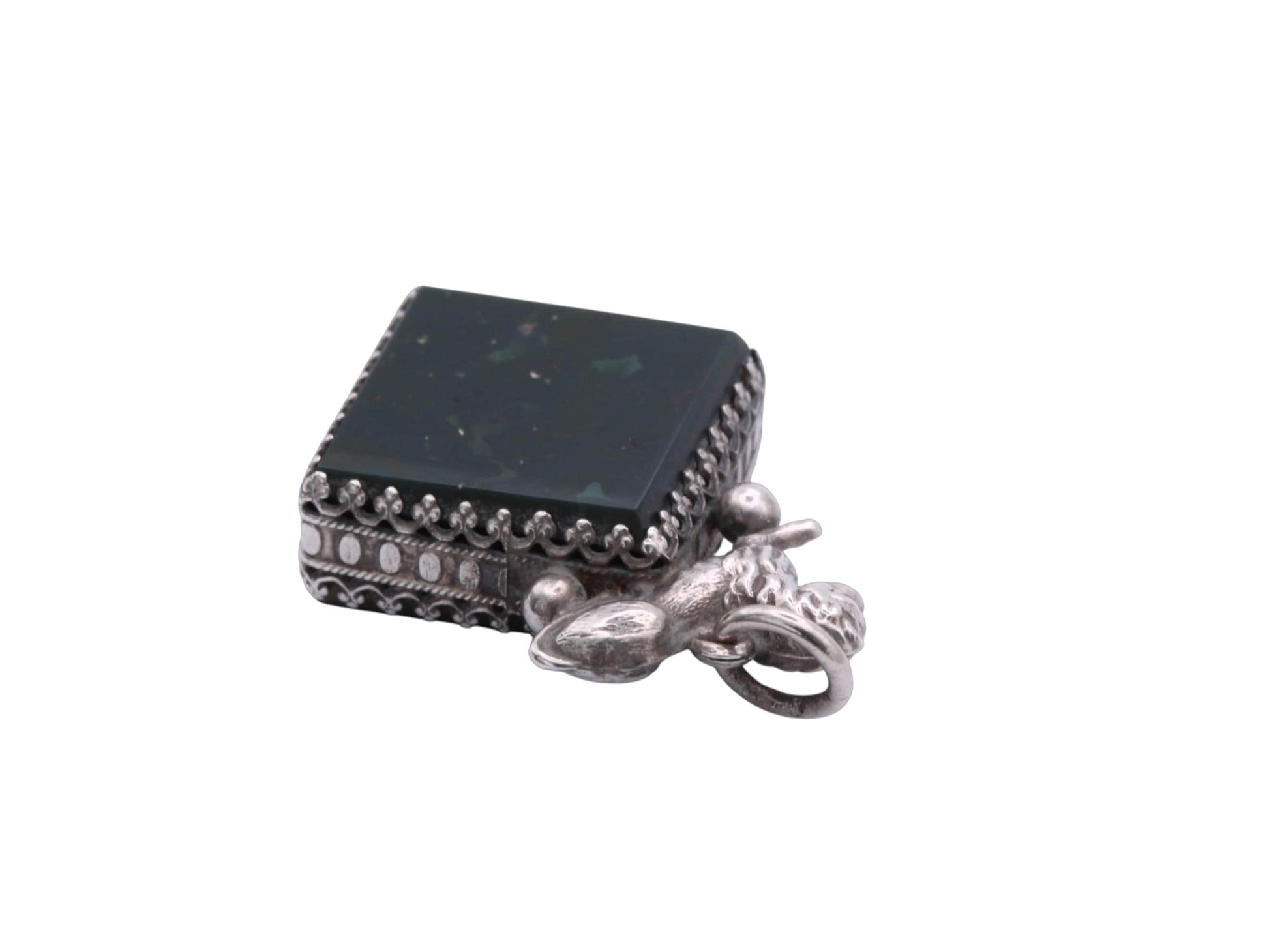 An antique sterling silver pendant, hallmarked for the Birmingham Assay Office and dating to 1912. The piece features a beautifully modelled lion mounted proudly at the top — a symbol of courage, strength, and guardianship. Below, an intricate silver mount holds two stones: a deep green bloodstone on the front, and a rich carnelian on the reverse.