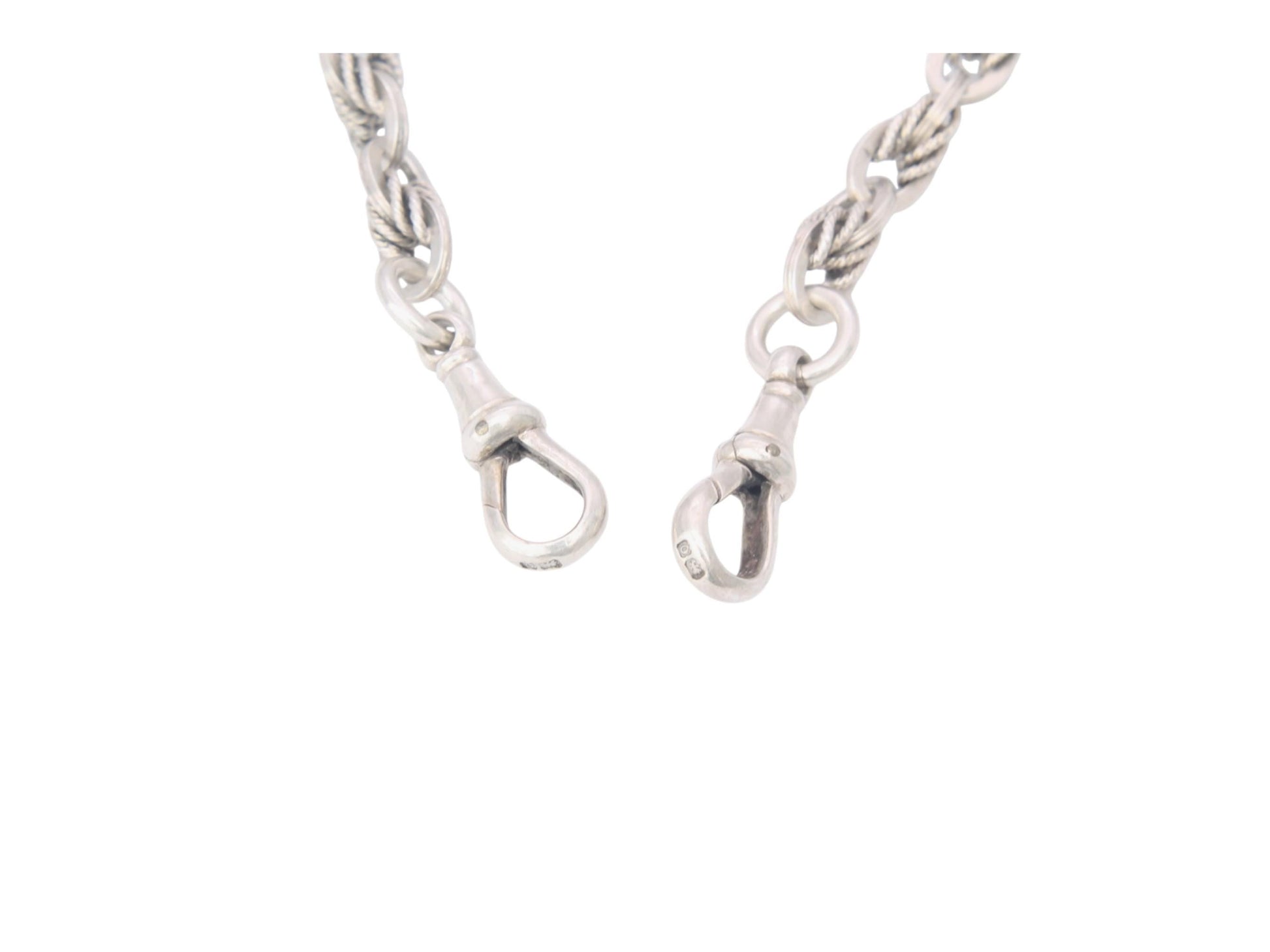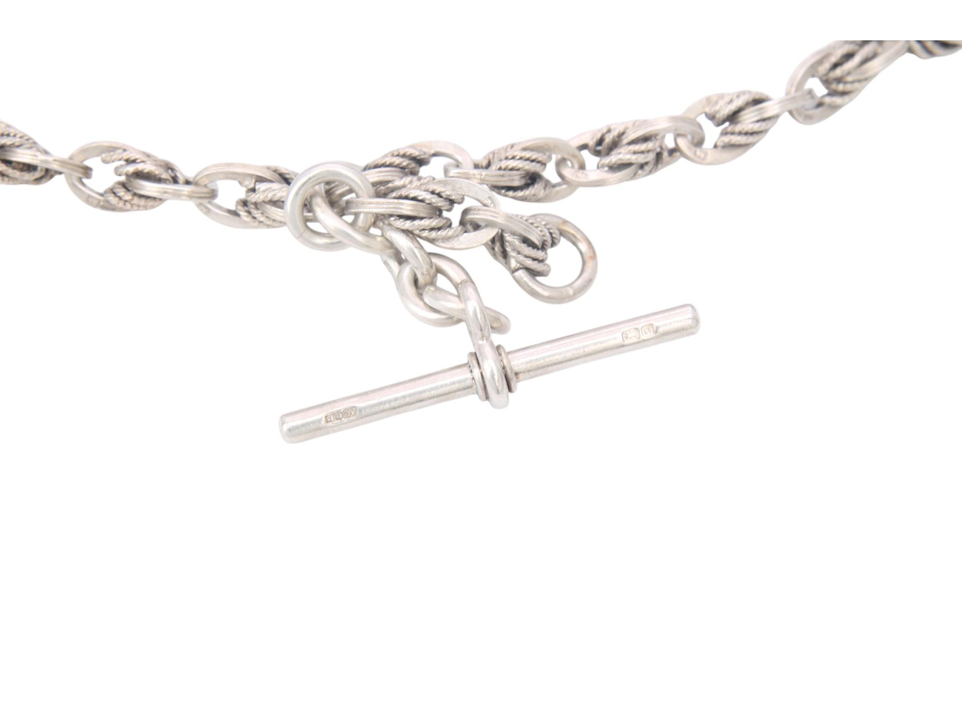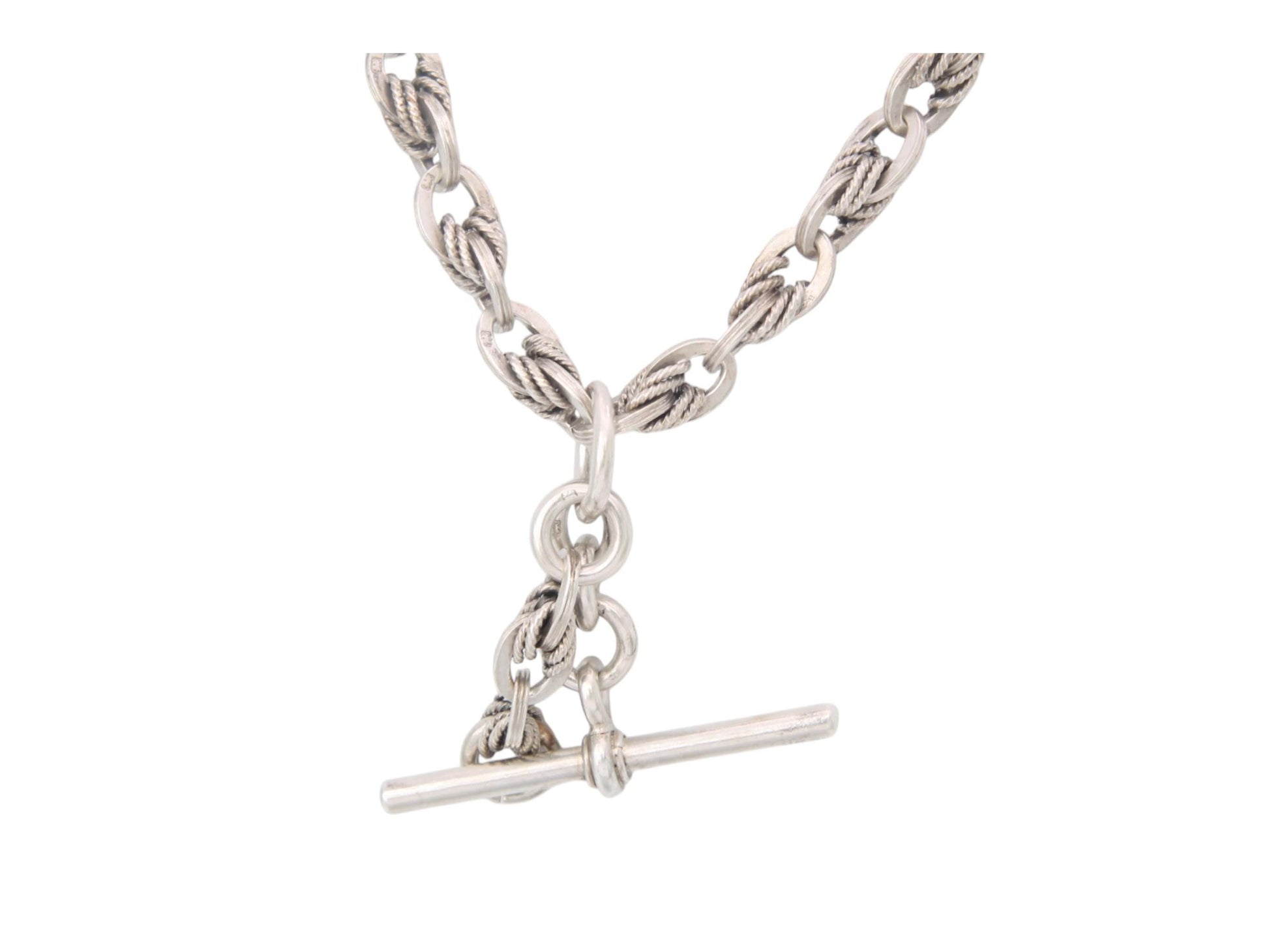 A striking antique sterling silver double Albert necklace chain dating to 1913, featuring a fabulous lover’s knot link with a rope-like design throughout. The chain is complete with a T-bar suspended from a larger jump ring, allowing it to be positioned anywhere along the chain. Measuring 15" in length, this is a bold and elegant piece of early 20th-century craftsmanship, perfect for wear with a pocket watch, charms, or as a statement necklace.