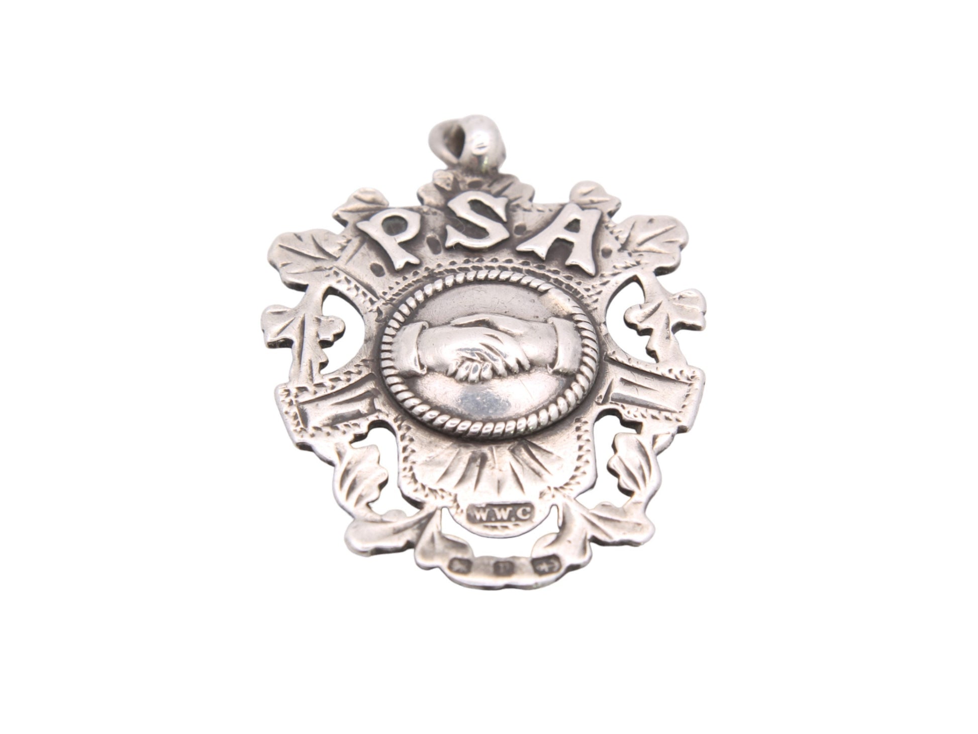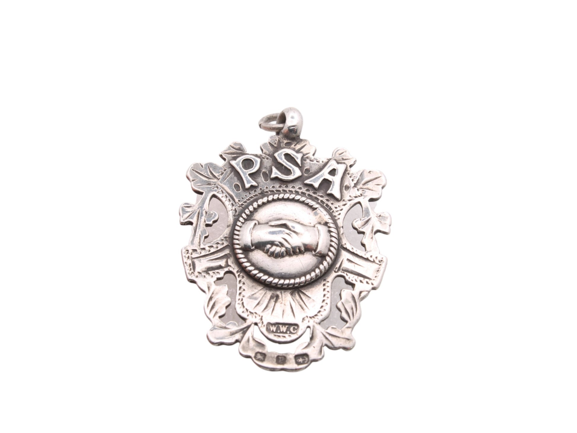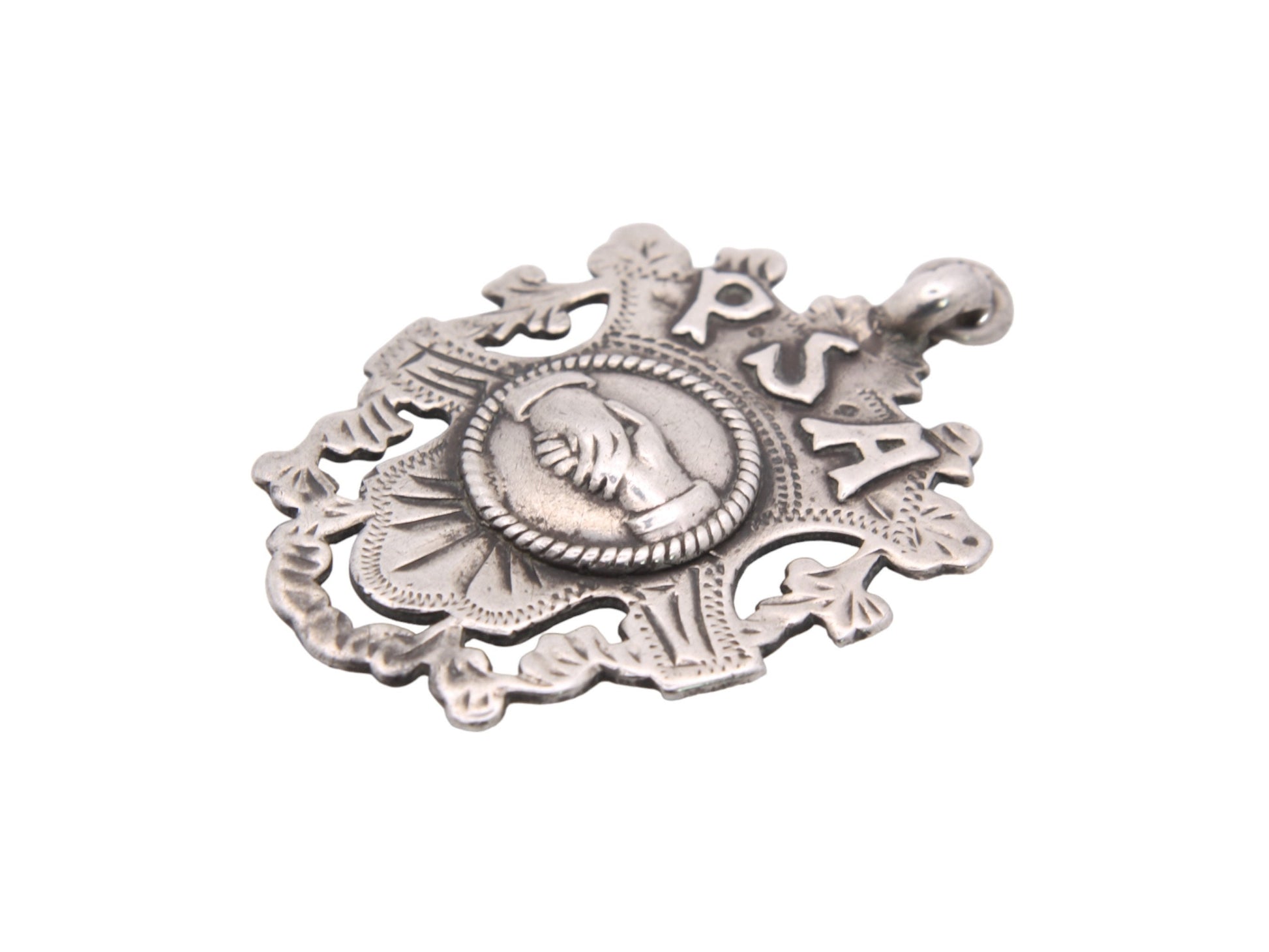 This antique sterling silver pendant is a fascinating piece of history, featuring applied letters "PSA," which stand for "Pleasant Sunday Afternoon." Below the letters is a finely detailed depiction of two hands shaking, symbolizing unity and fellowship.