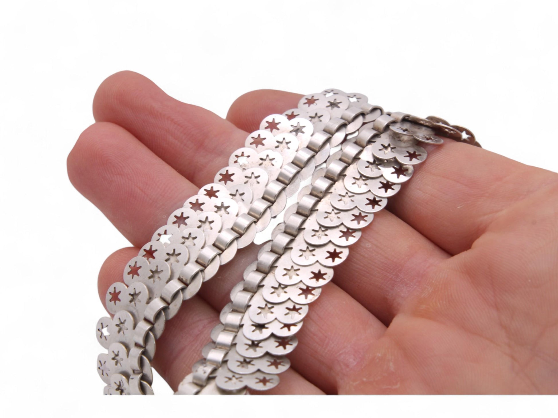 This exquisite antique sterling silver star link collar necklace is a true masterpiece of Victorian craftsmanship. Each link features intricate punched star motifs and suspended from the bolt clasp is a beautifully detailed locket, showcasing an enamel depiction of the beloved Bo Peep. Surrounding the locket are delicate floral carvings of violets, enhancing the romantic and nostalgic feel of this necklace.