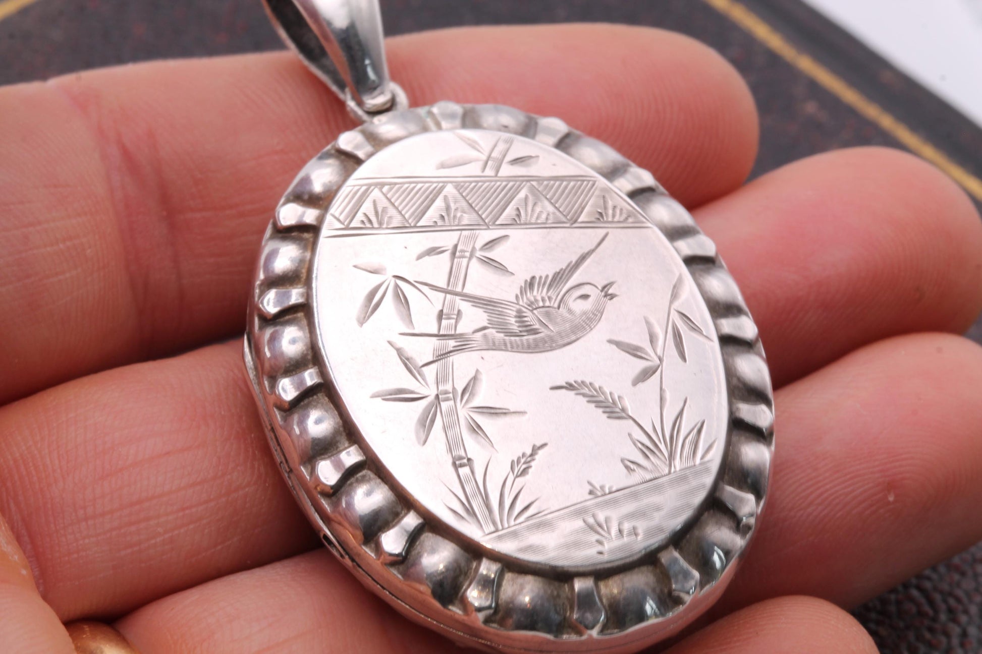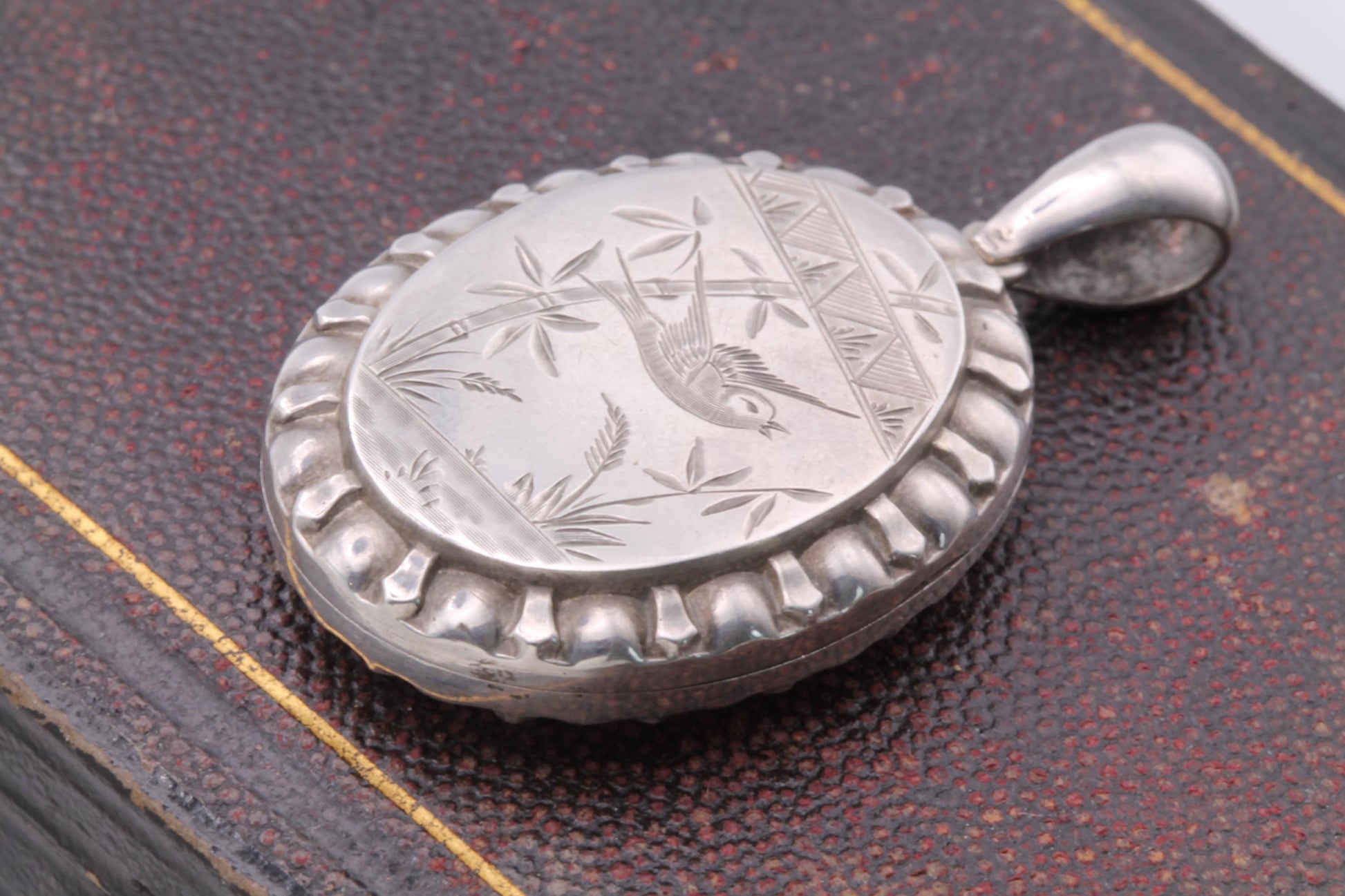 An antique sterling silver locket dated 1881, engraved with a detailed scene of a swallow in flight over water, surrounded by plants and trees. The landscape composition gives depth and movement, typical of late Victorian engraving.