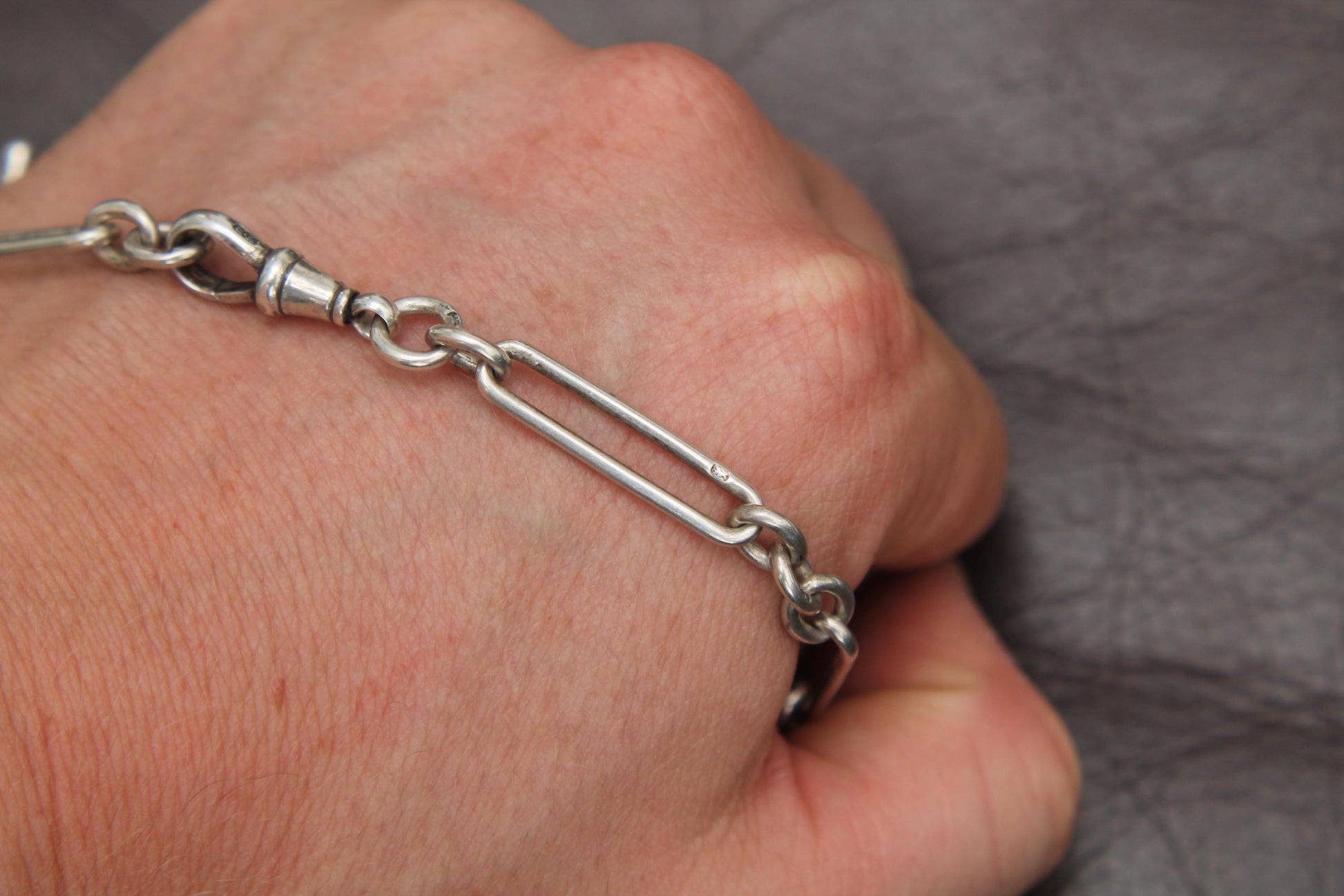 A fine antique sterling silver Albert chain dating to 1901, beautifully crafted with bold trombone links. Measuring 14" in length and weighing 29 grams, this solid piece is both stylish and practical. It features a dog clip at one end, with a classic T-bar and drop link at the other, making it ideal for attaching a pocket watch, charms, or wearing as a statement necklace. A substantial and high-quality example of Edwardian silver craftsmanship.