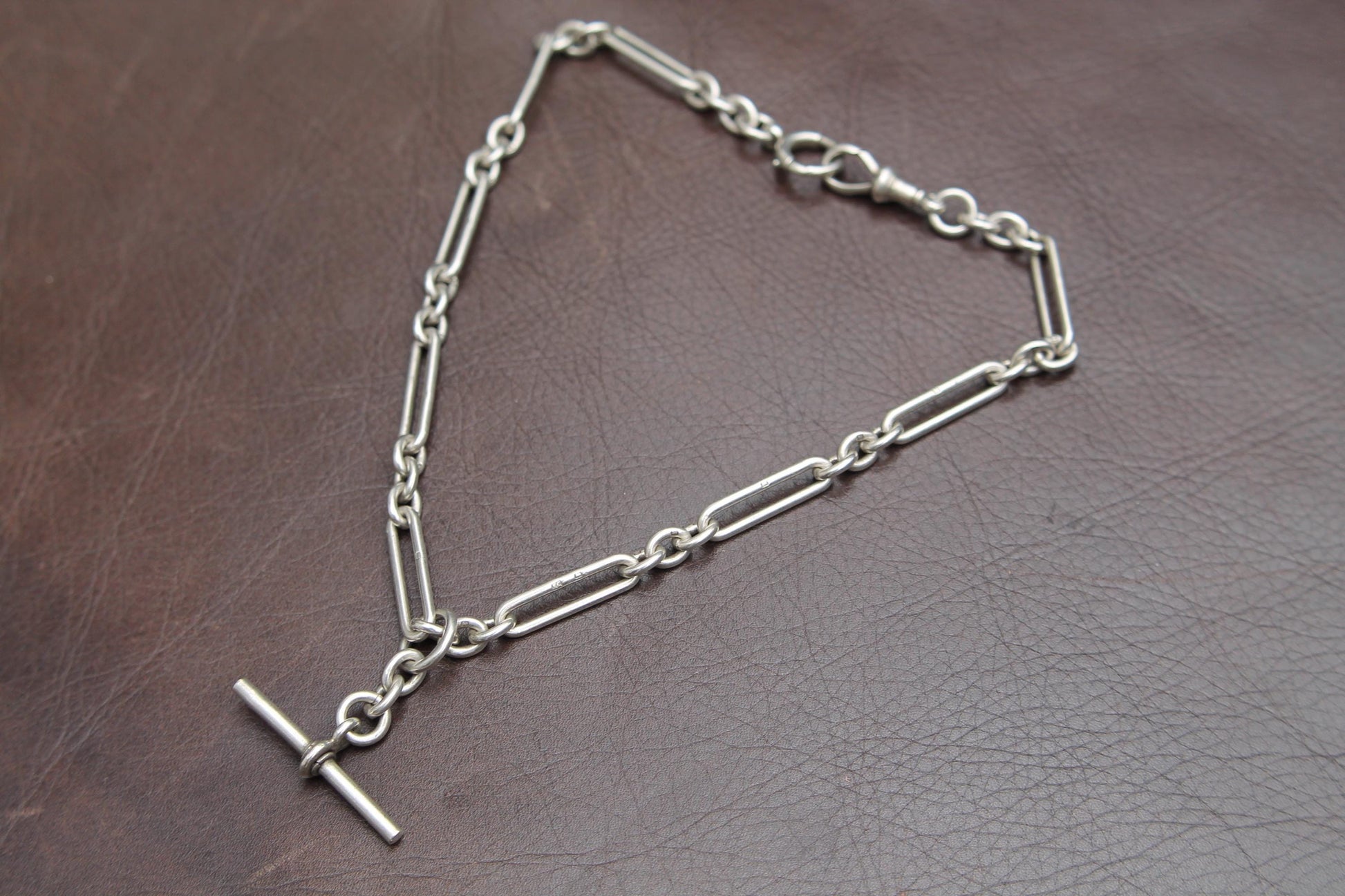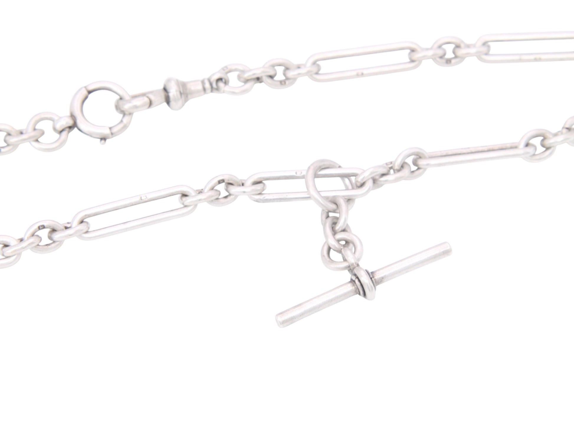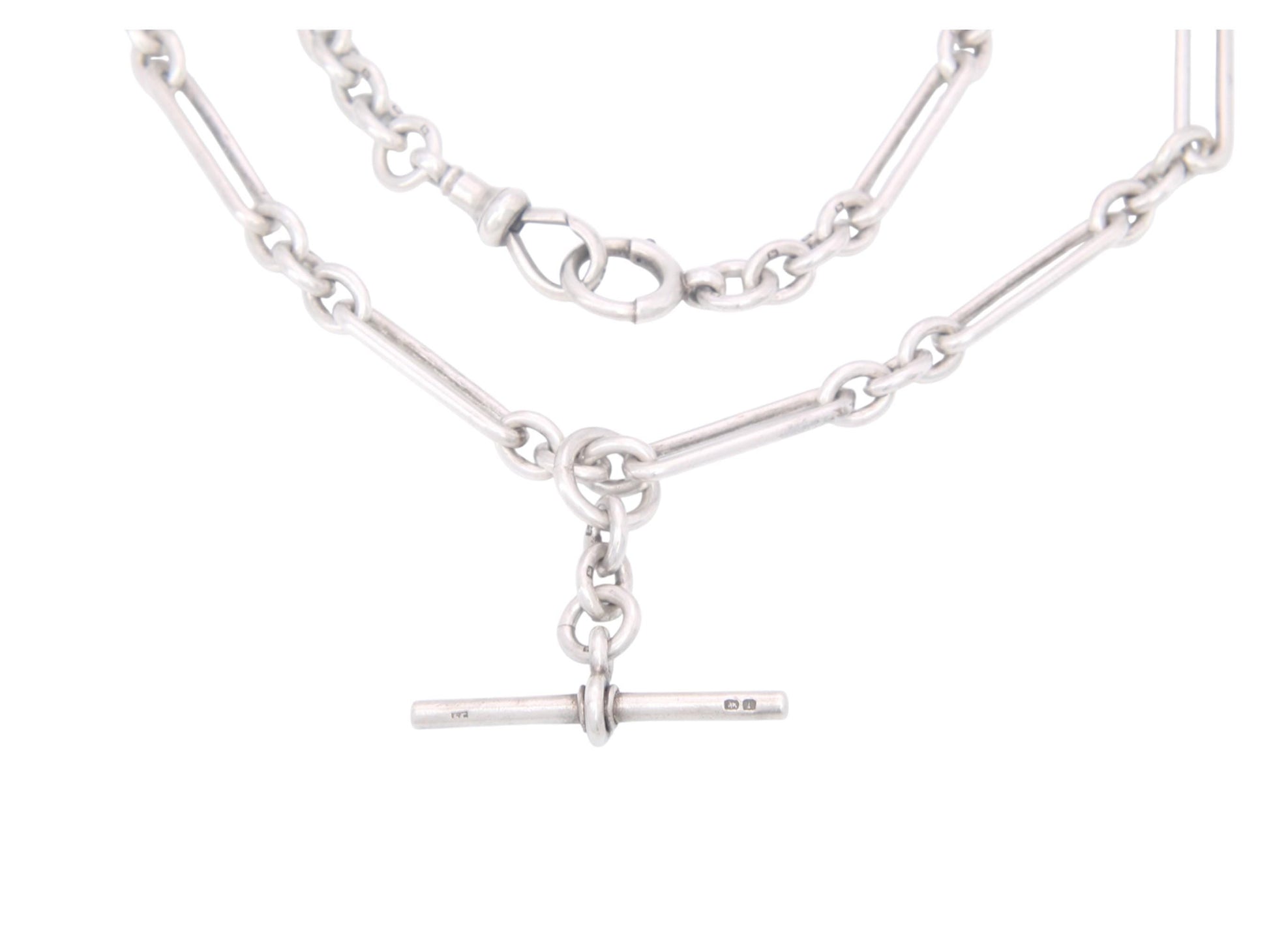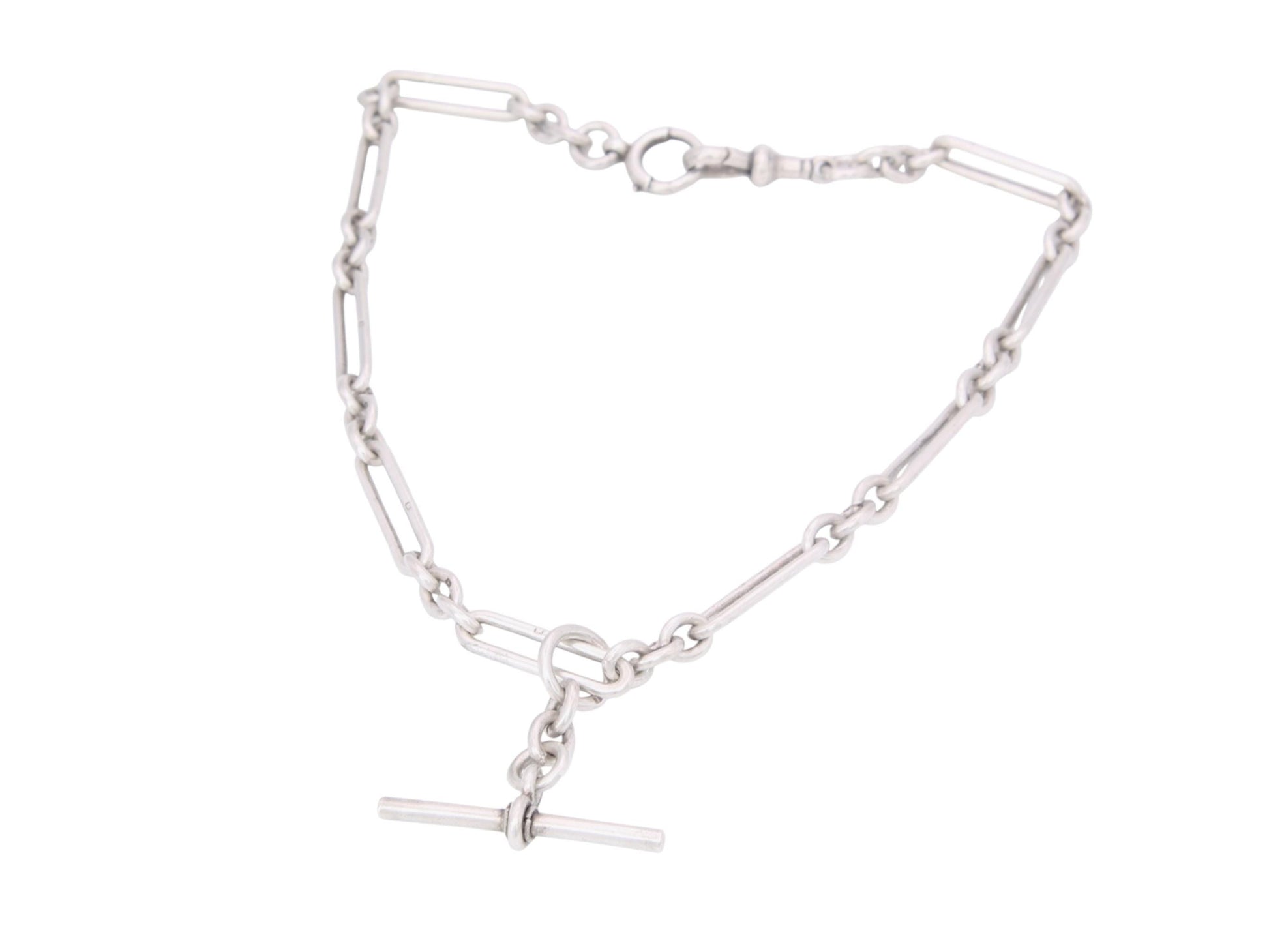 The T-bar is fitted on a larger jump ring, allowing it to be positioned anywhere along the chain. A classic piece of Edwardian jewellery.