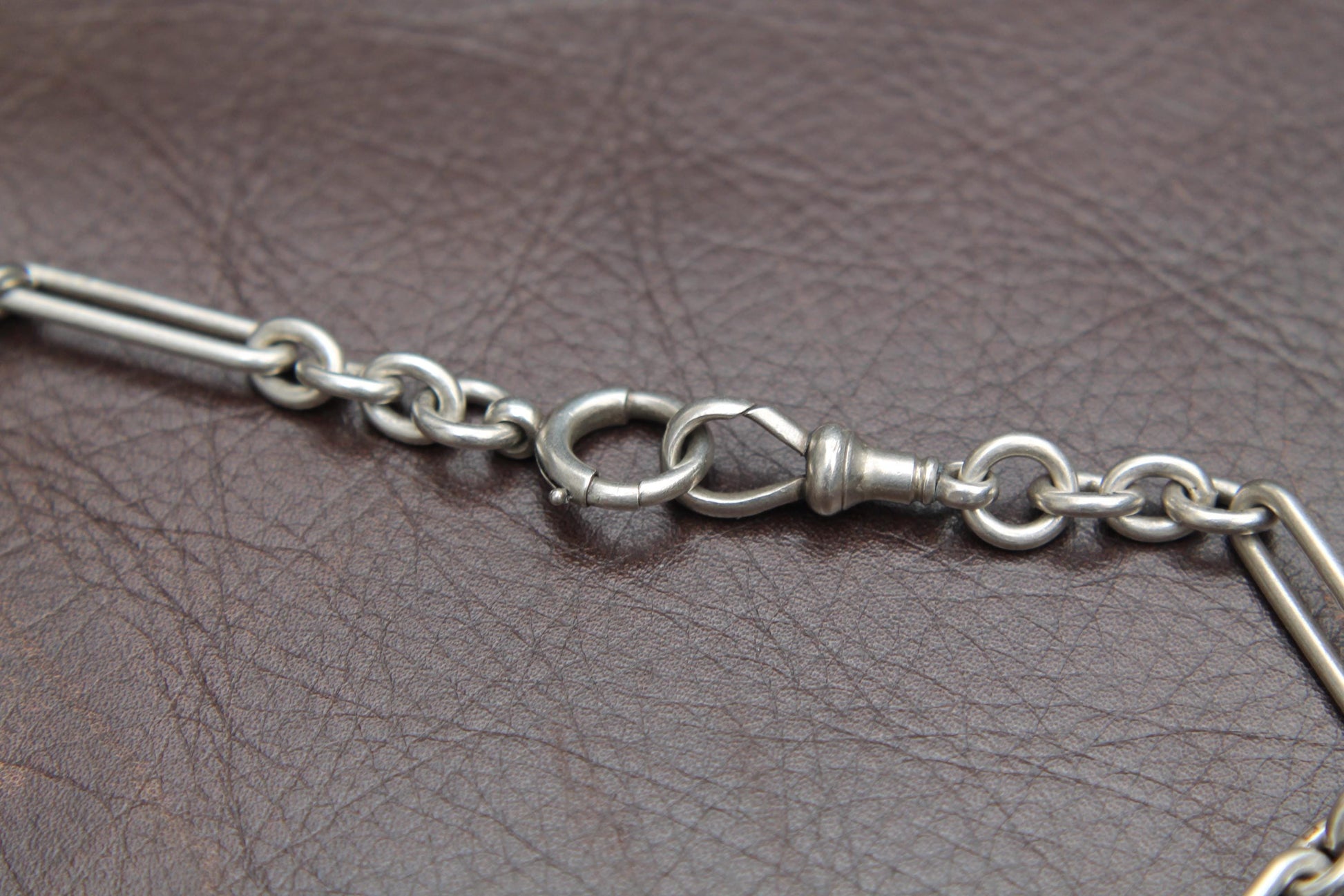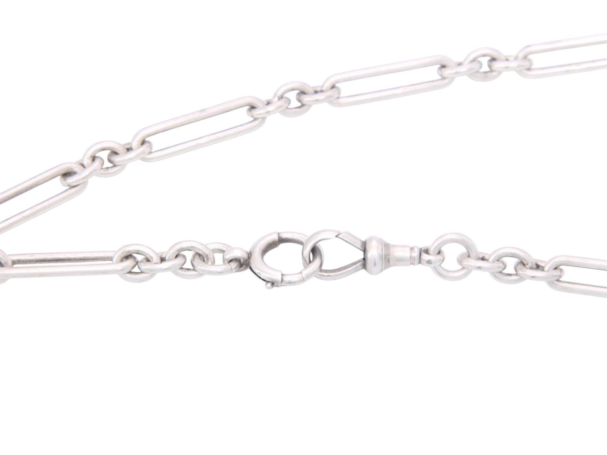A fine antique sterling silver trombone link double Albert chain necklace, dating to 1910. The solid links are each stamped with the lion passant, confirming sterling silver quality. The chain measures 15 inches in length and features a dog clip at one end and a bolt clasp at the other, making it both secure and versatile.