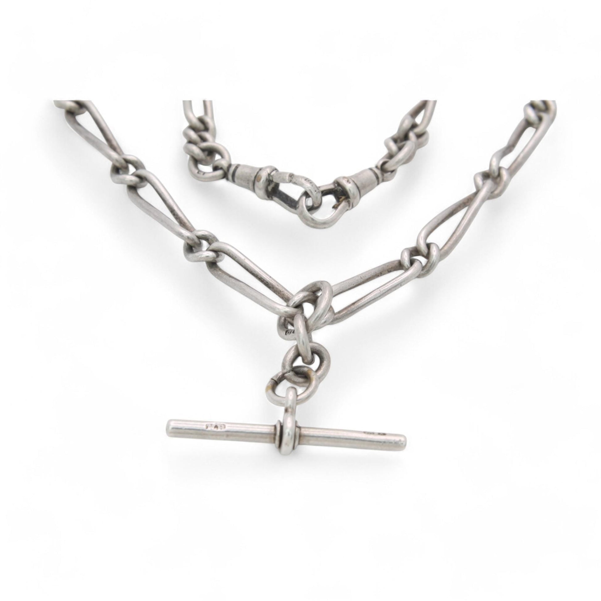 This antique sterling silver Double Albert chain, dating to 1897, is a finely crafted piece of Victorian craftsmanship. Measuring 14.75 inches, it features beautifully made twisted trombone links, each individually stamped with the lion passant to indicate sterling silver quality.