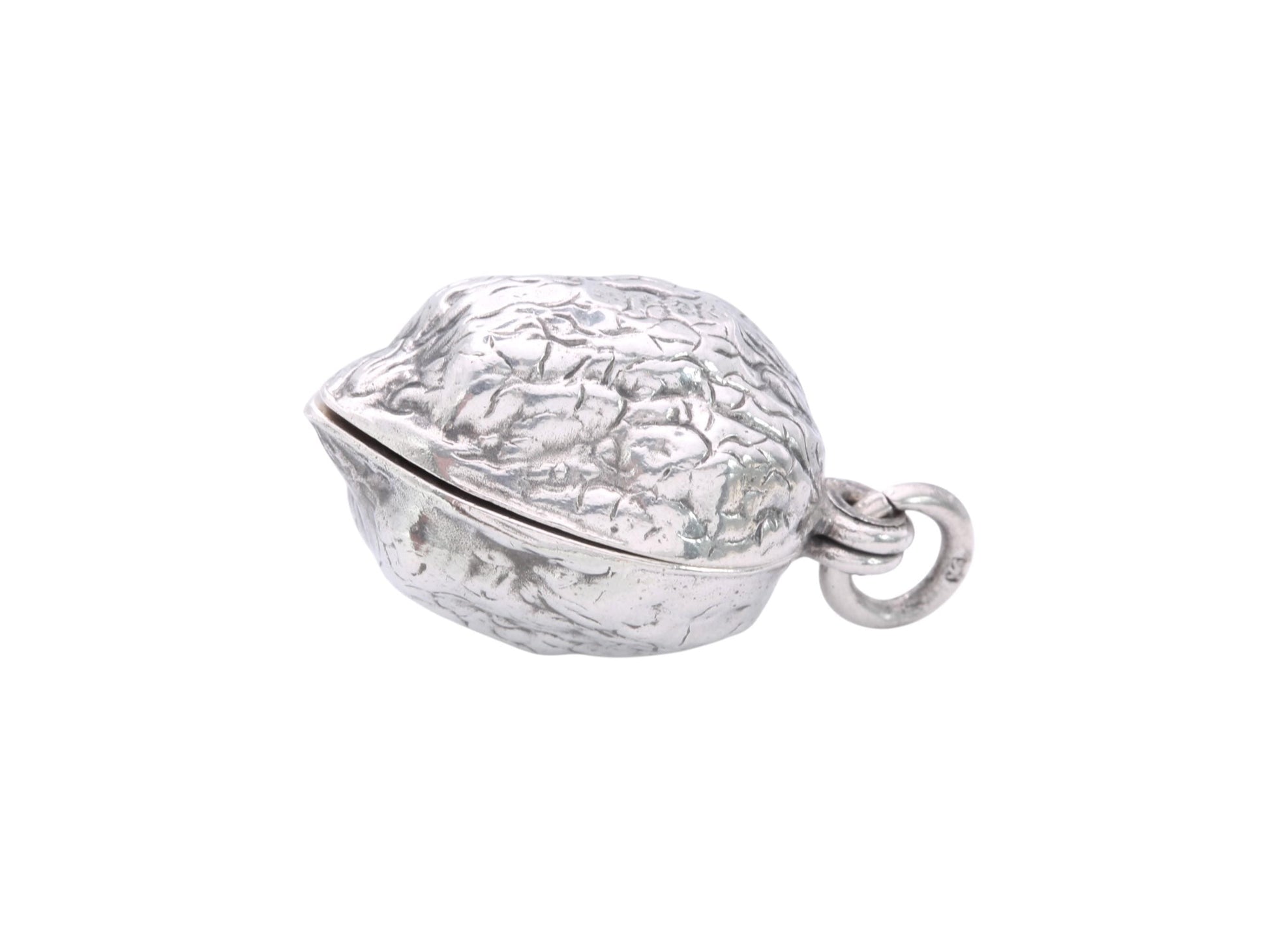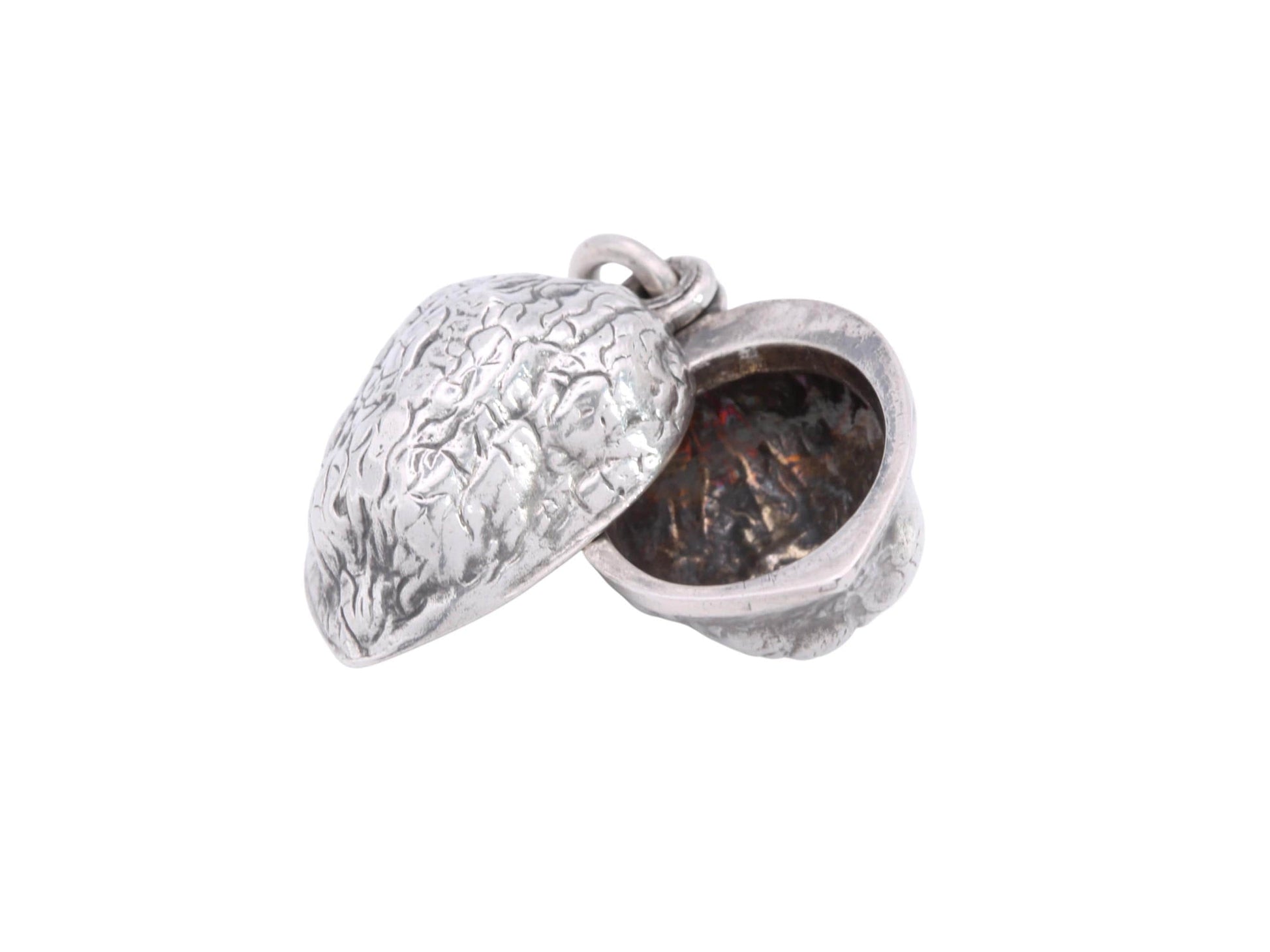 An antique sterling silver pendant crafted in the shape of a lifelike walnut, with exquisite detailing that captures the natural texture and form of the nut. The pendant is hinged at the top, allowing the two halves to separate, making it suitable as a locket for small keepsakes or simply as a decorative pendant.