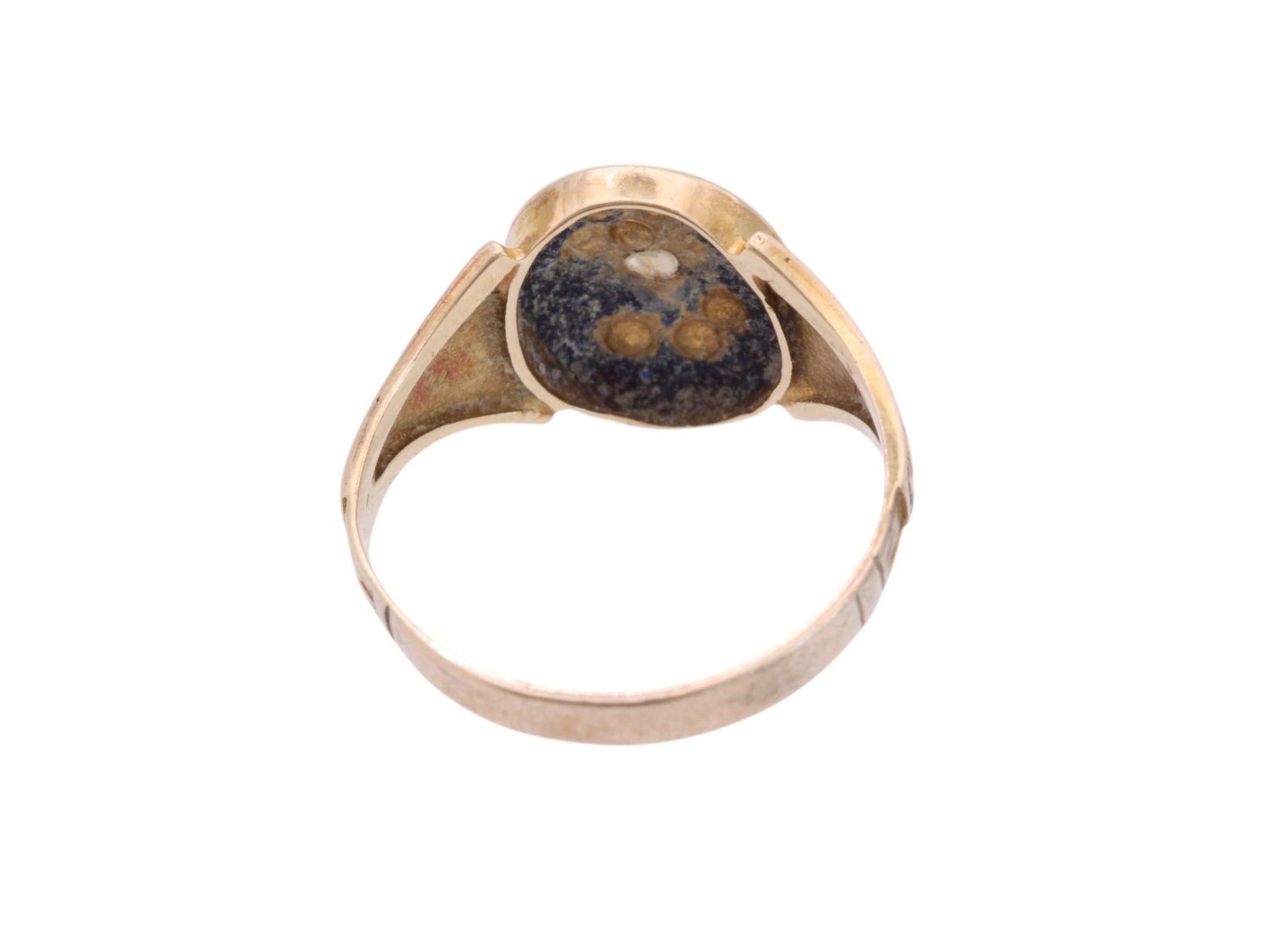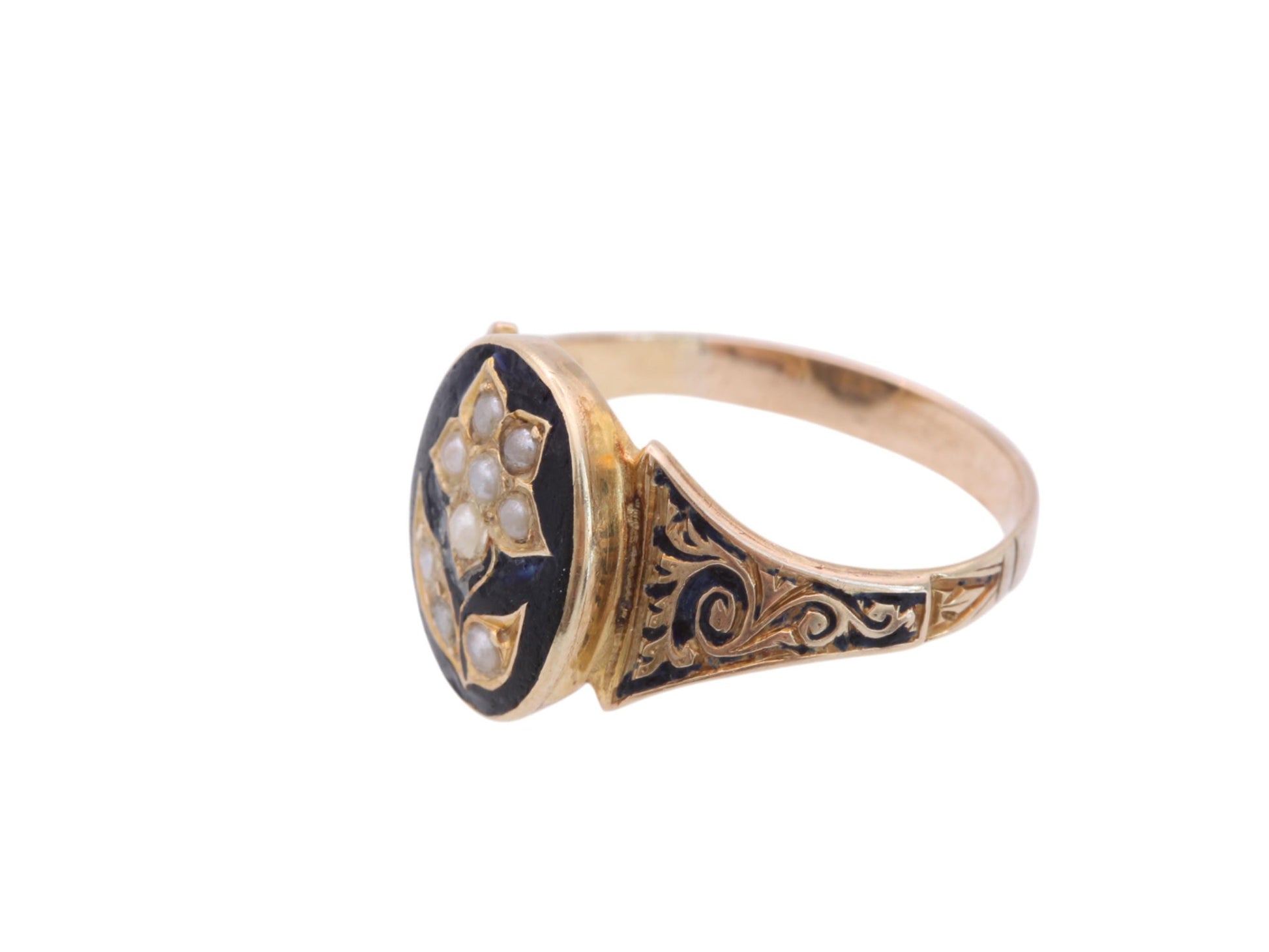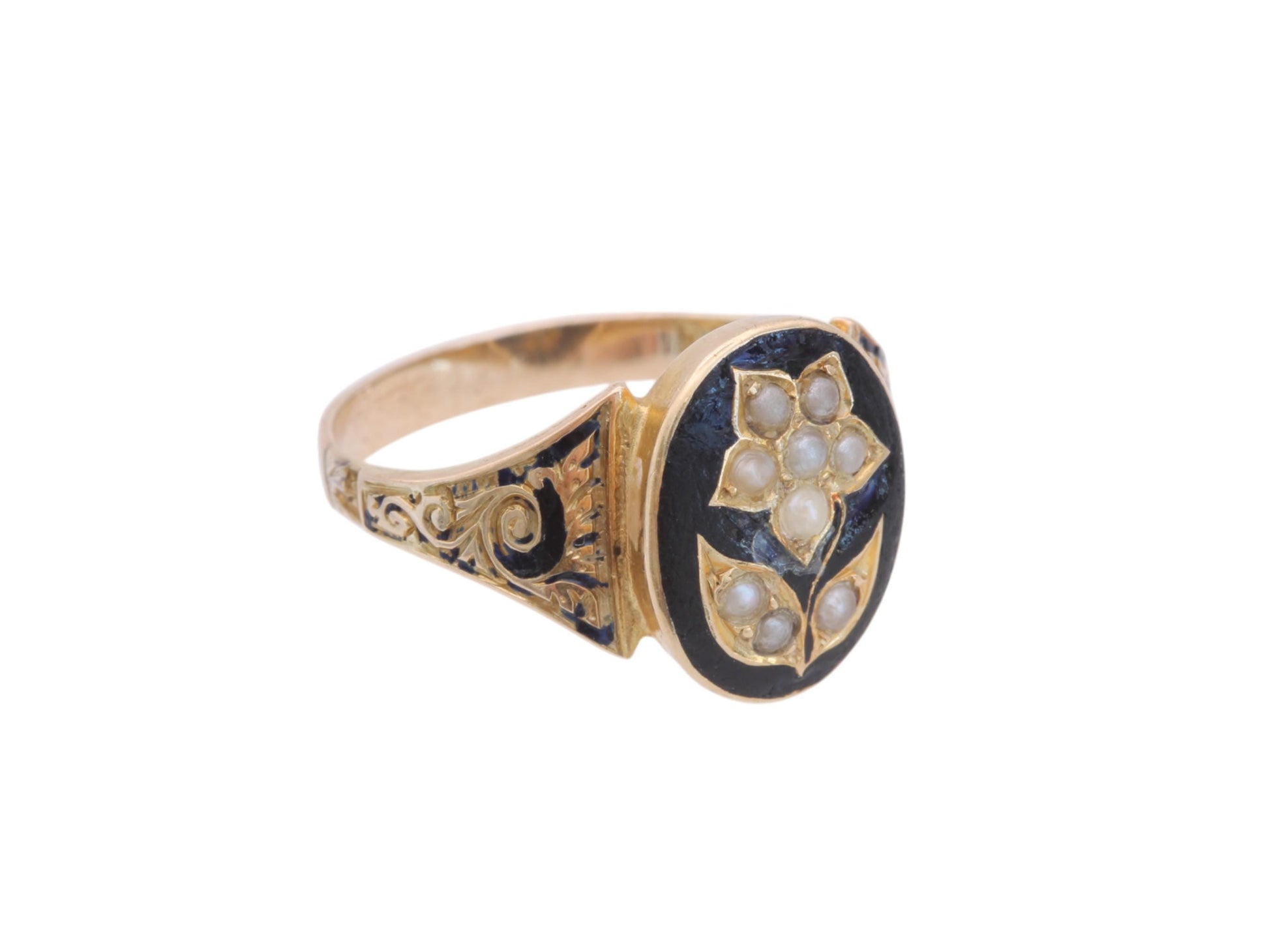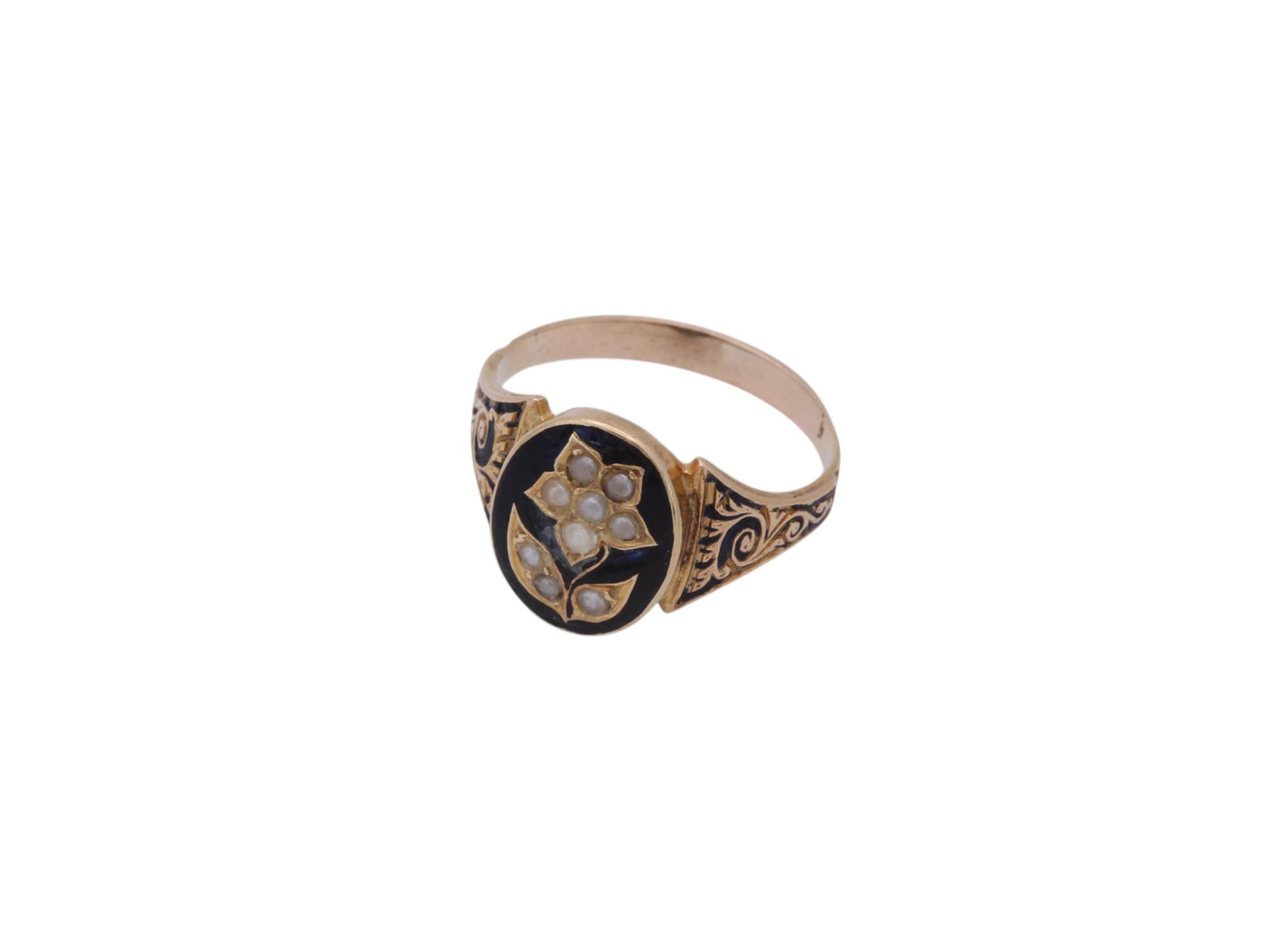 An evocative antique Victorian ring crafted in 15ct yellow gold, dating to the 19th century. The front is adorned with rich black enamel, framing a delicate forget-me-not flower set with lustrous seed pearls as petals and leaves — a symbol of enduring love and remembrance. The chased shoulders add texture and charm, with subtle enamel loss in keeping with its age. A beautiful example of sentimental Victorian mourning jewellery, full of meaning and elegance.