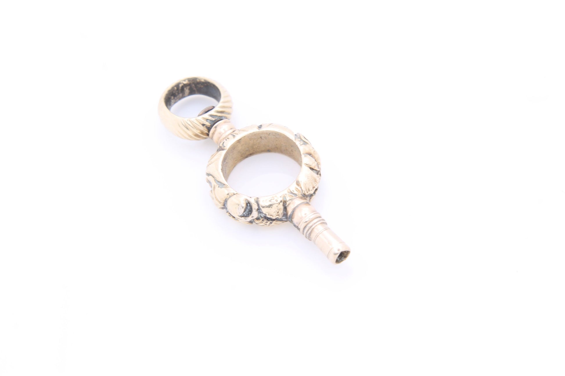 The key is unmarked however tested for 15ct gold. The end of the key where it once would have wound a pocket watch, is made of a base metal so it would have been more hard wearing when winding the watch.