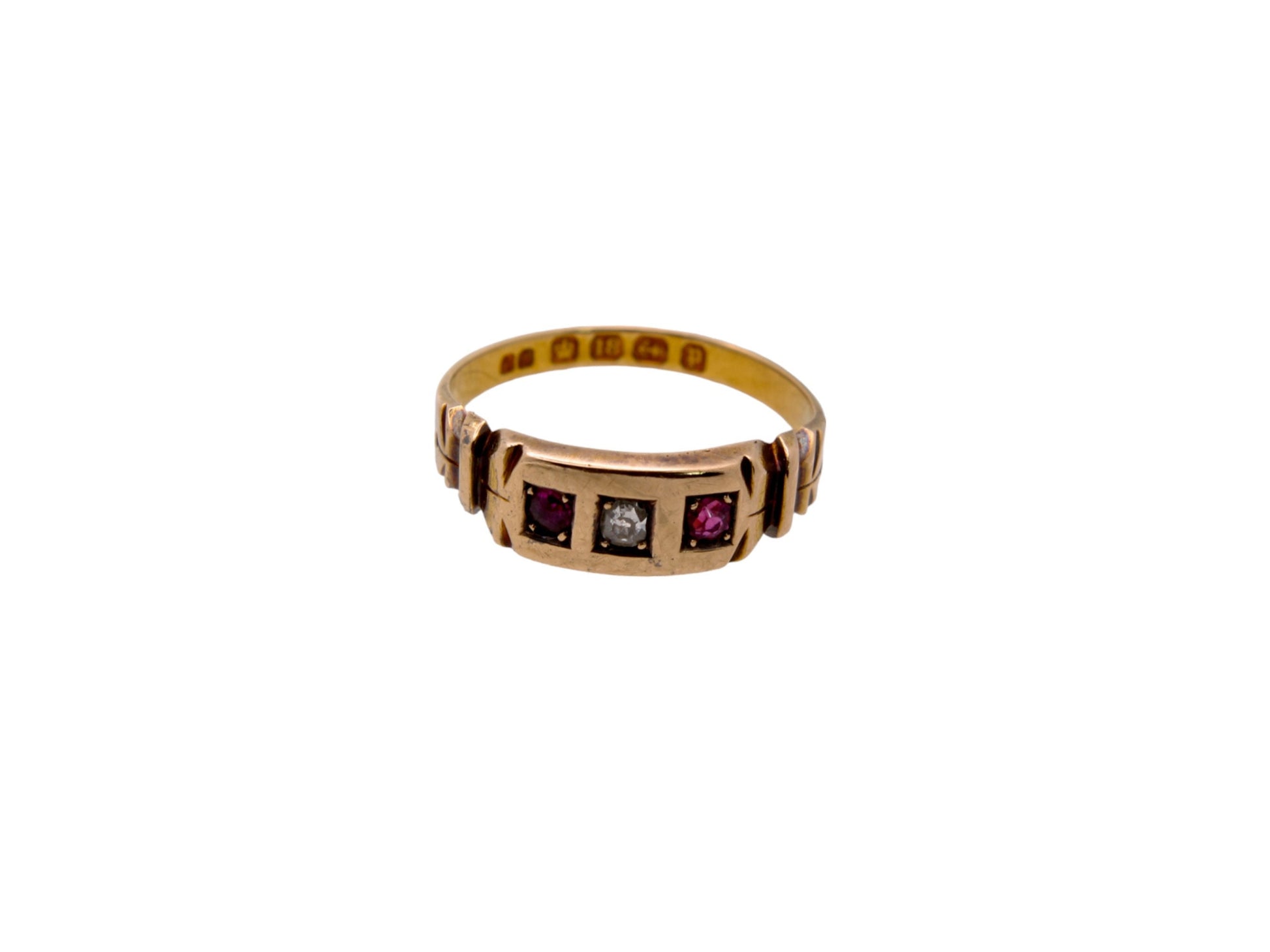 An exquisite antique 18ct gold gypsy ring, adorned with a captivating old mine cut diamond and two radiant rubies. This delightful ring captures the essence of Victorian beauty, combining the allure of precious gemstones with meticulous craftsmanship.