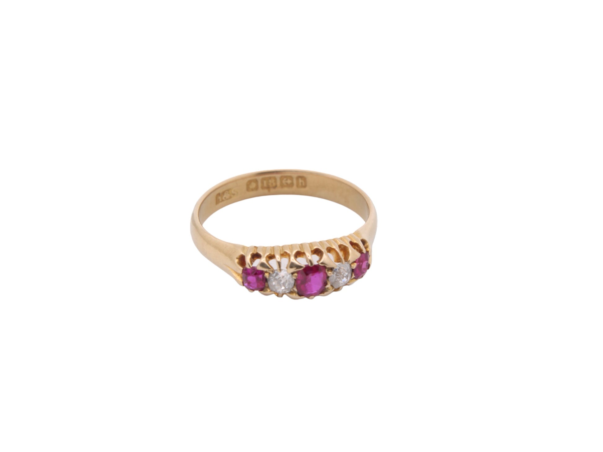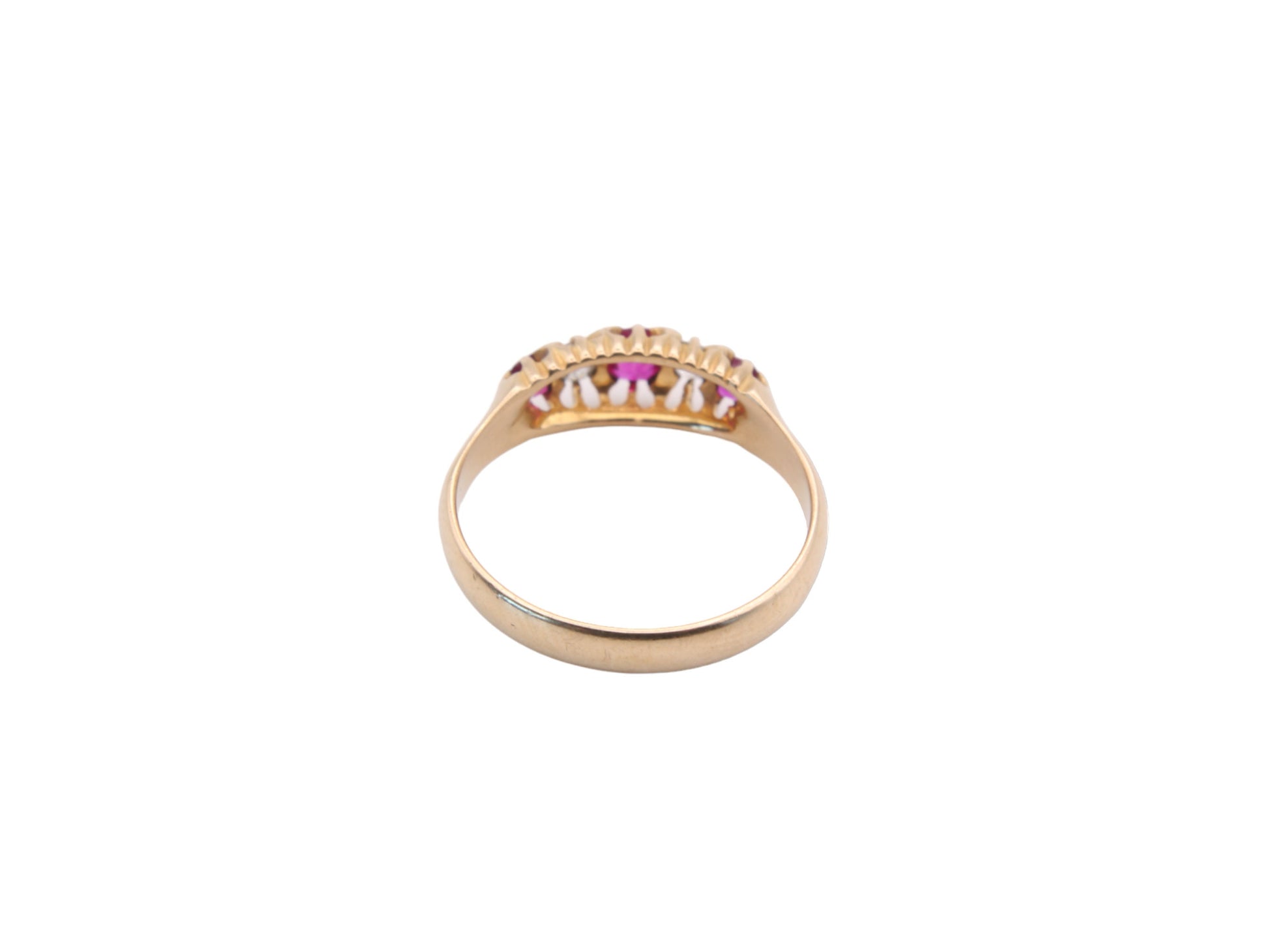 Adding to the allure, two outer cushion-cut rubies, each weighing 0.1ct, complete the composition, creating a harmonious balance of color and sophistication. The meticulous craftsmanship of the 18ct gold gypsy setting enhances the unity of these precious stones, showcasing a style that was distinctive to the Edwardian era.