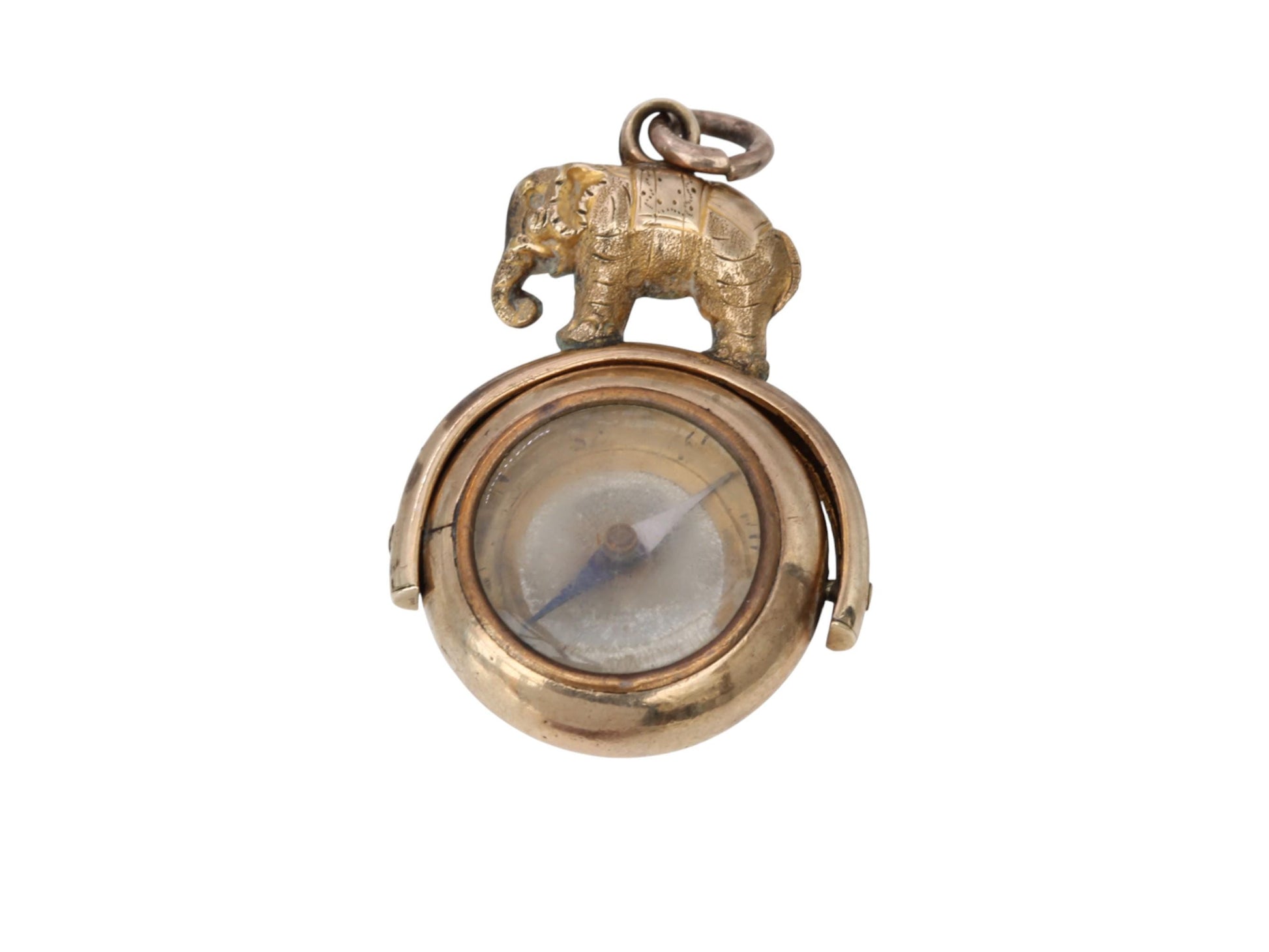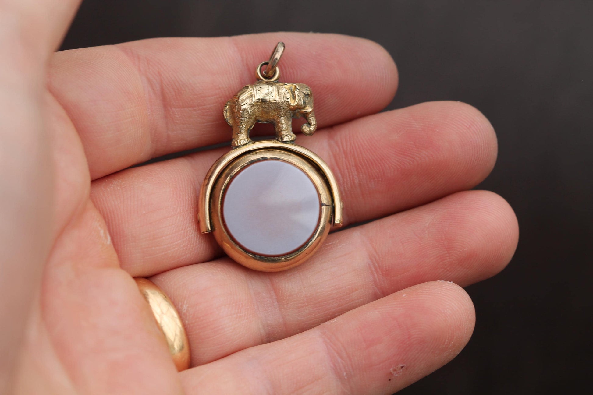An antique late Victorian 9ct rolled gold spinner pendant, featuring a compass on one side and a polished sardonyx on the reverse. Crowning the top is a finely detailed elephant motif, a Victorian symbol of strength, wisdom, and good fortune. The pendant turns freely within its mount. In nice condition, this piece is both a fascinating curiosity of its era and a meaningful charm to carry close.