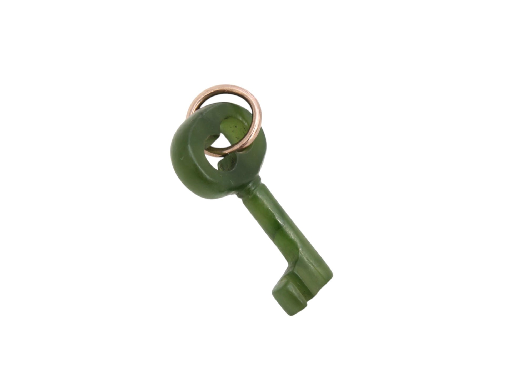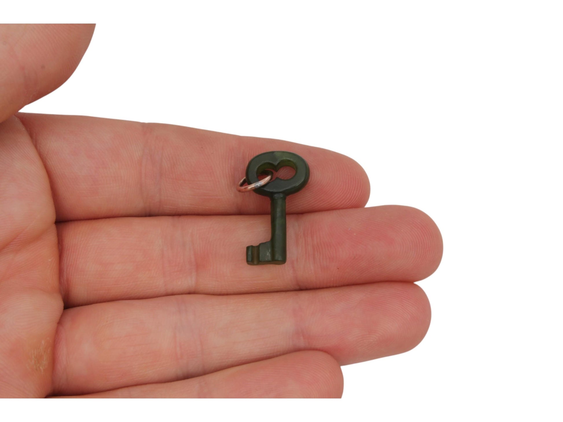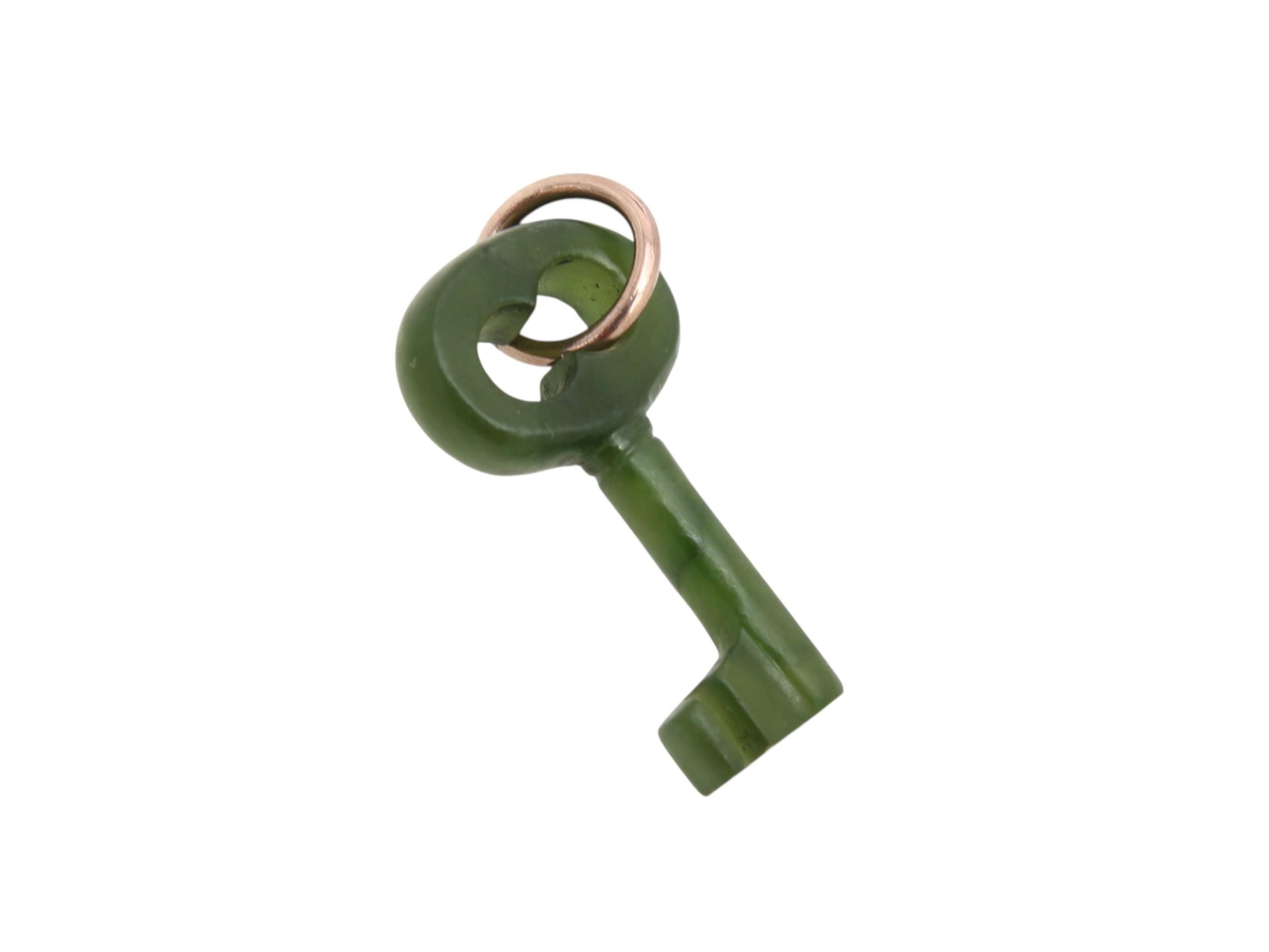 An antique New Zealand nephrite jade key pendant, beautifully carved with intricate detailing and timeless craftsmanship. Dating to around 1890, this piece showcases the rich green tones and smooth finish characteristic of high-quality nephrite.