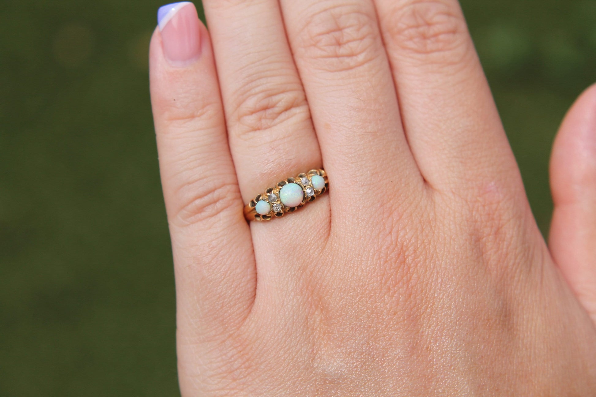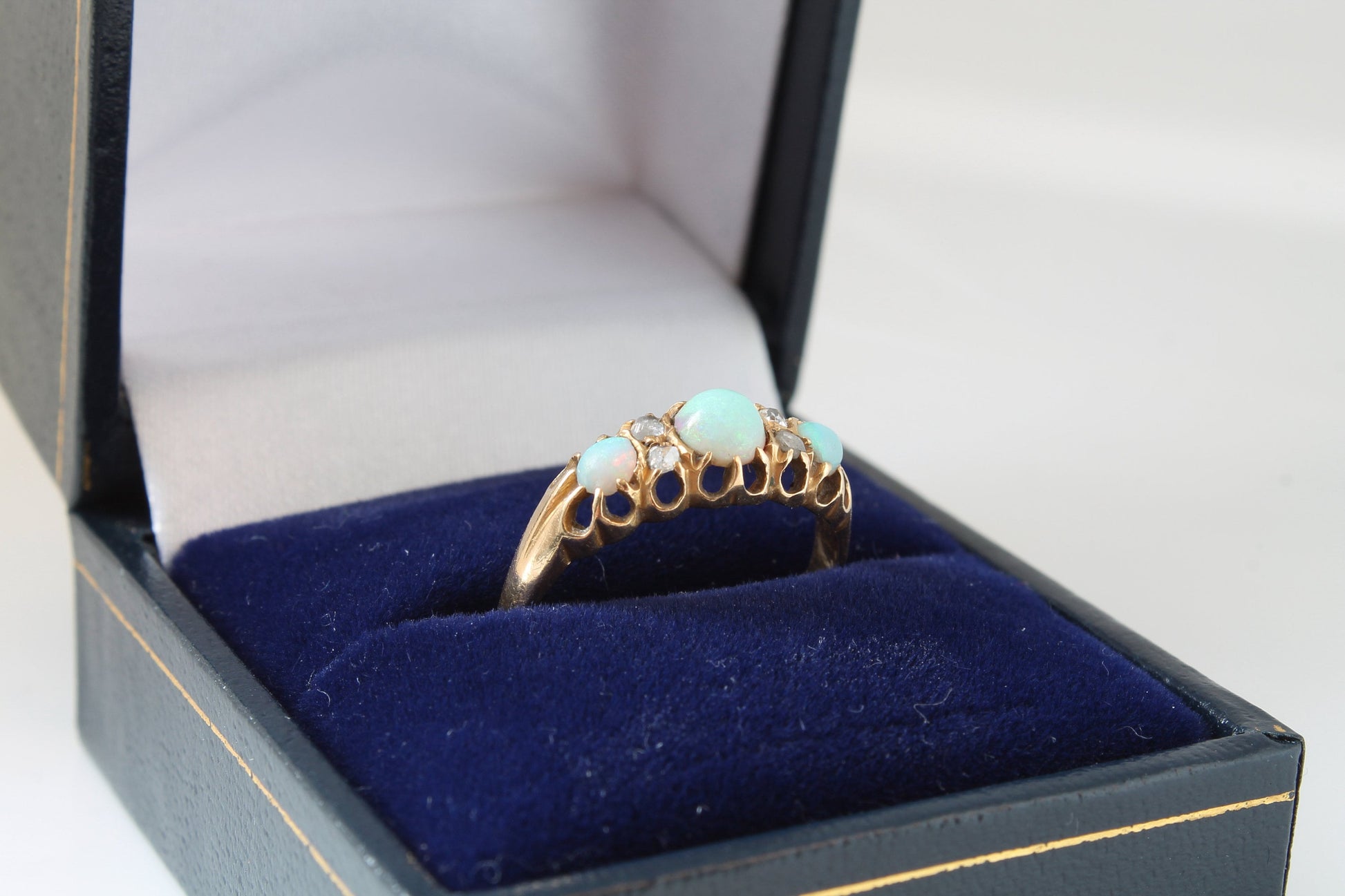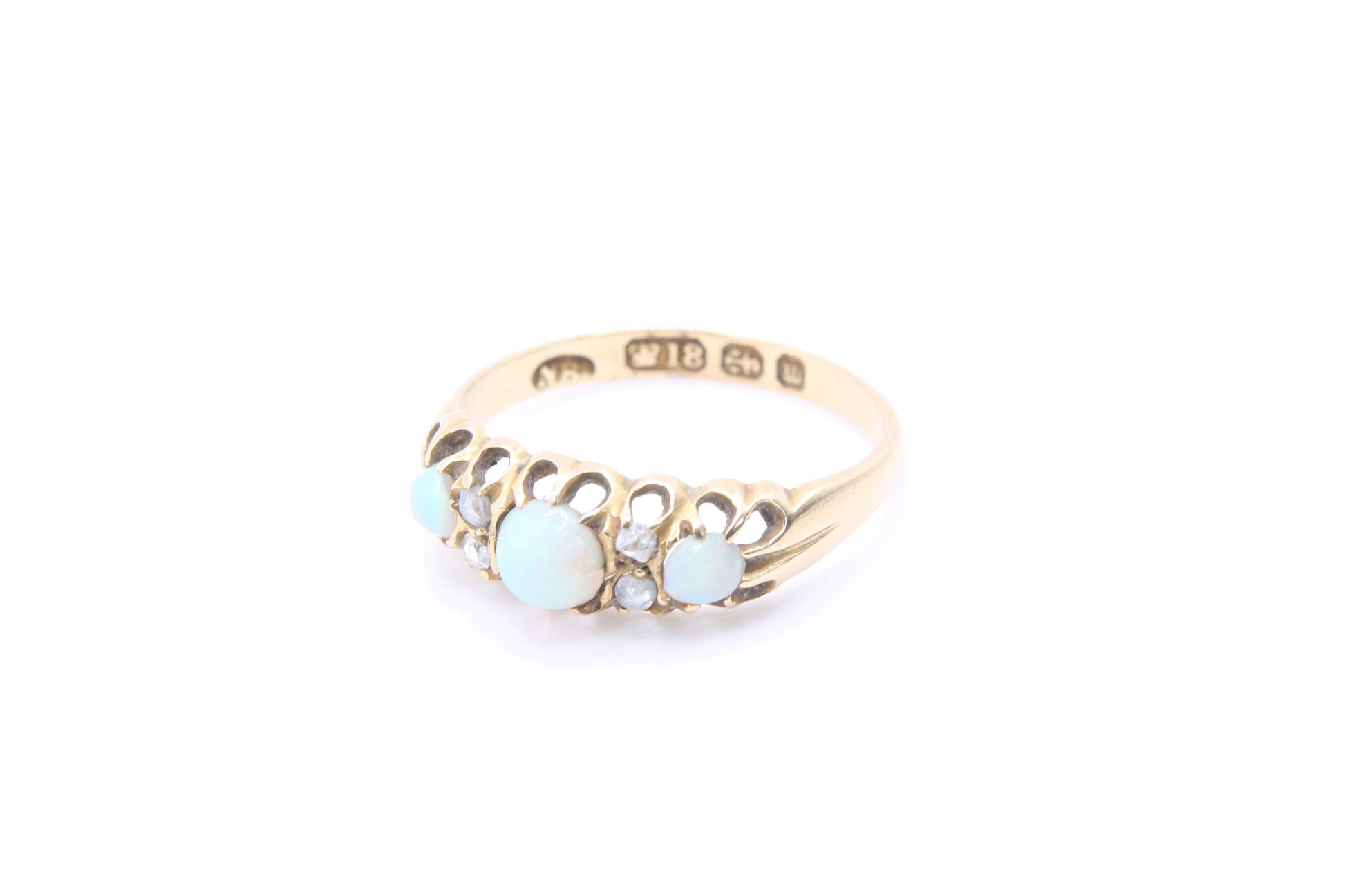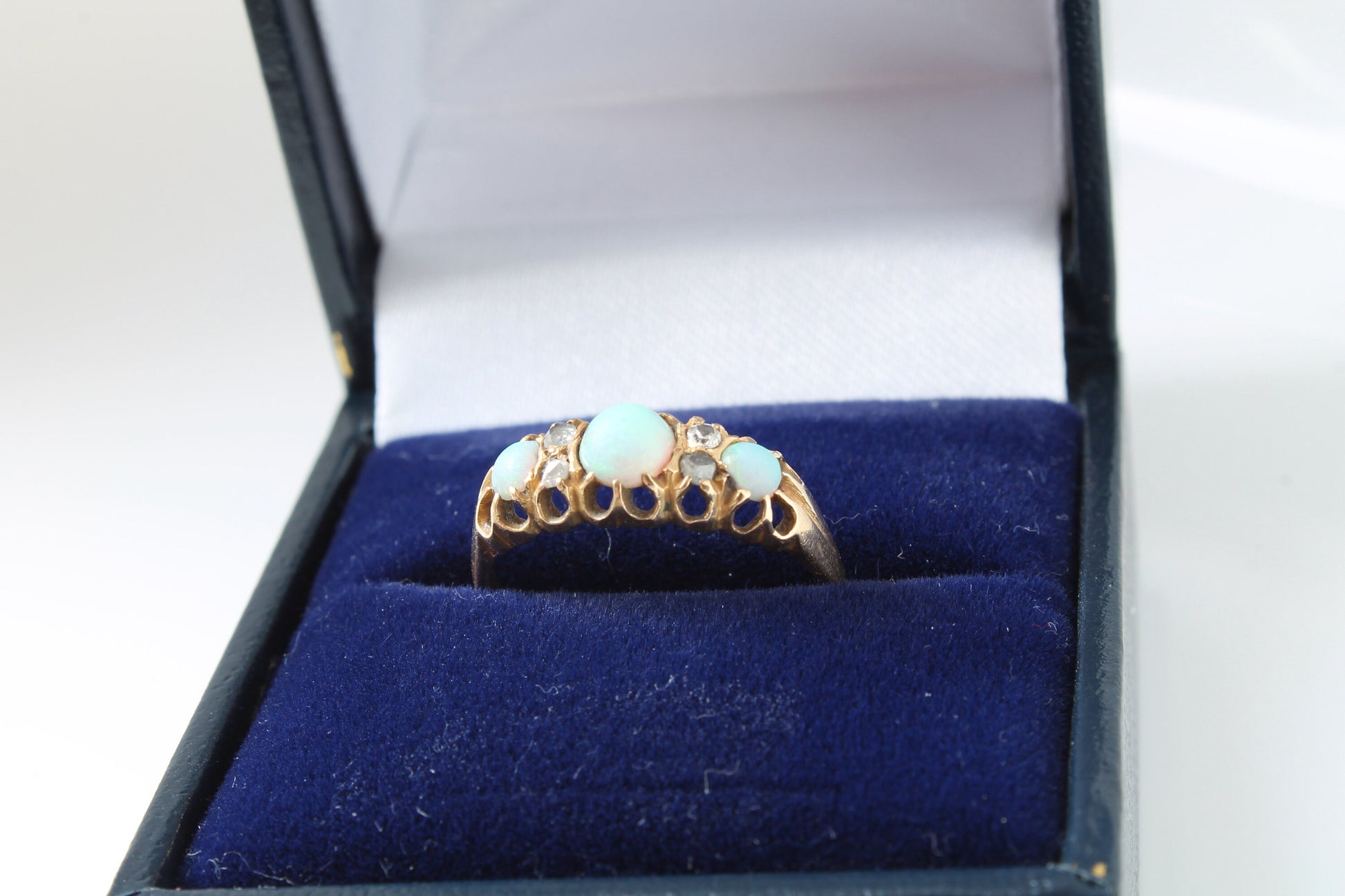It features three pretty cabochon opals with a green, blue and orange mixture, set between four sparkling rose cut diamonds. The gems are set in 18ct gold with the traditional victorian setting along with nicely carved shoulders.