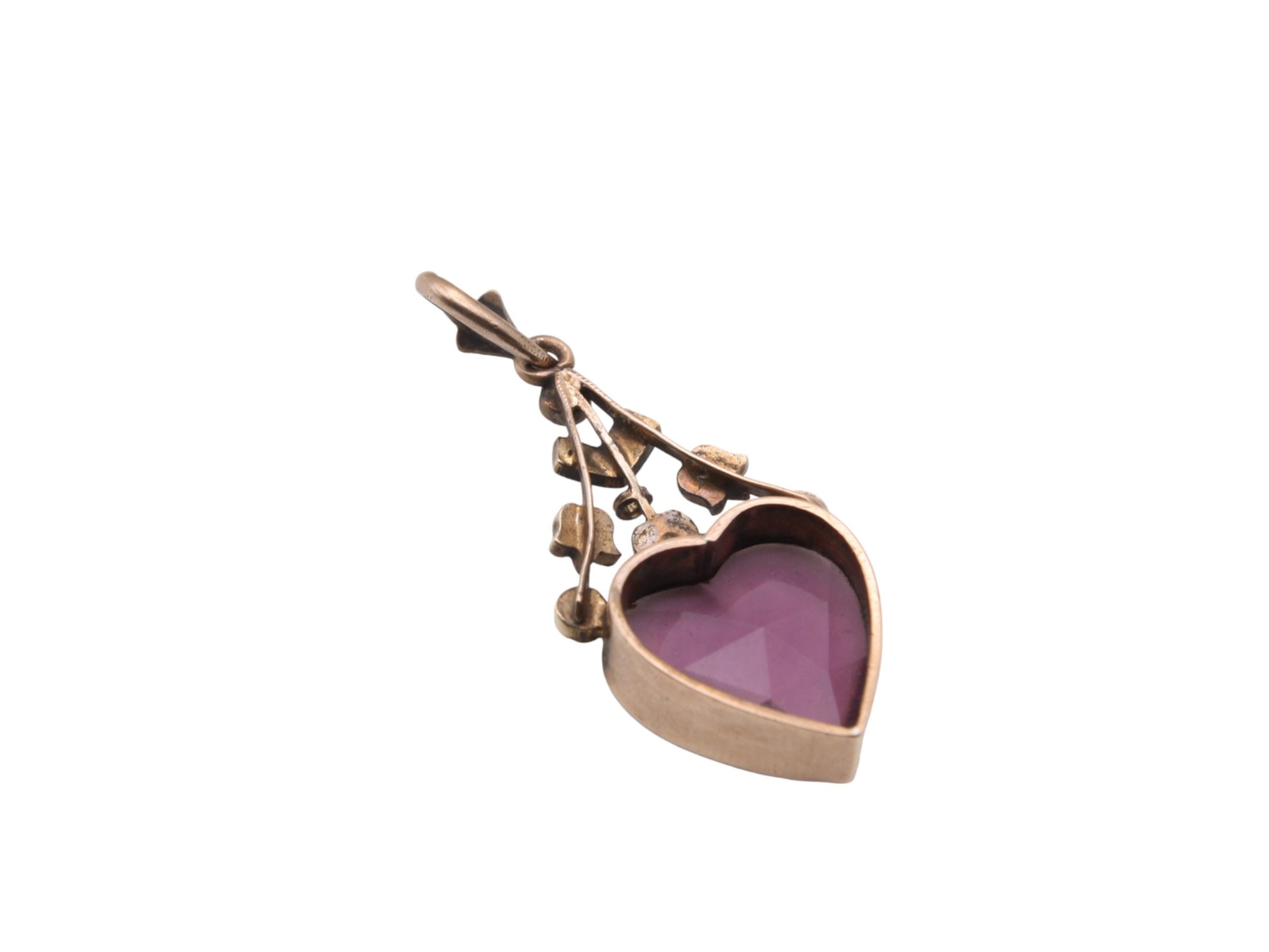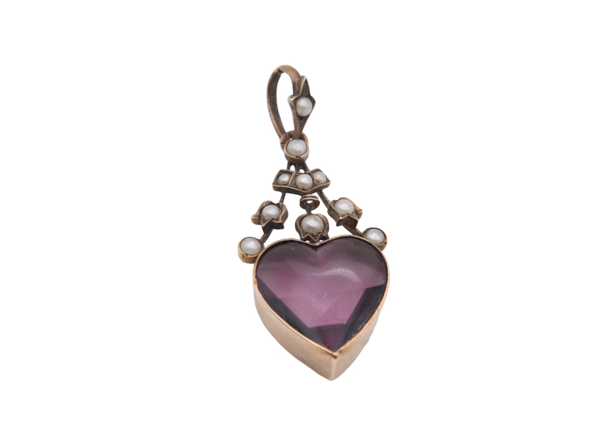 An exquisite antique pinchbeck pendant, adorned with a faceted amethyst colour glass heart and delicate seed pearls. This captivating piece exudes Victorian charm and elegance, making it a perfect addition to any jewellery collection.