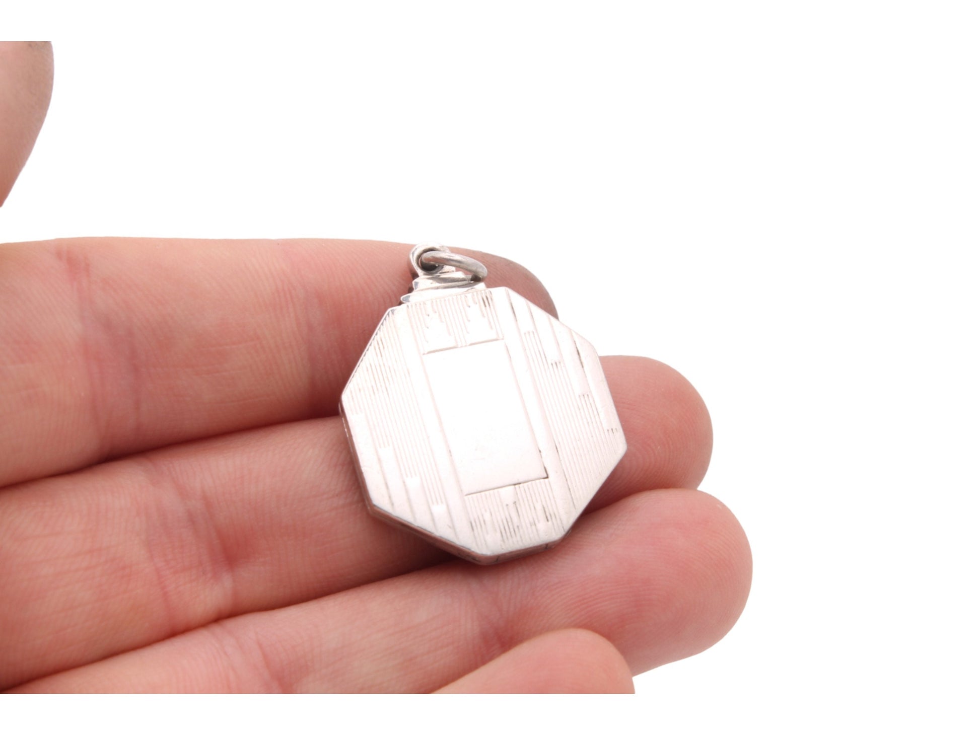A nicely designed vintage sterling silver locket pendant, a charming piece that exudes both elegance and simplicity. With its art deco design adorning the front, this locket carries a timeless appeal that effortlessly complements any style.