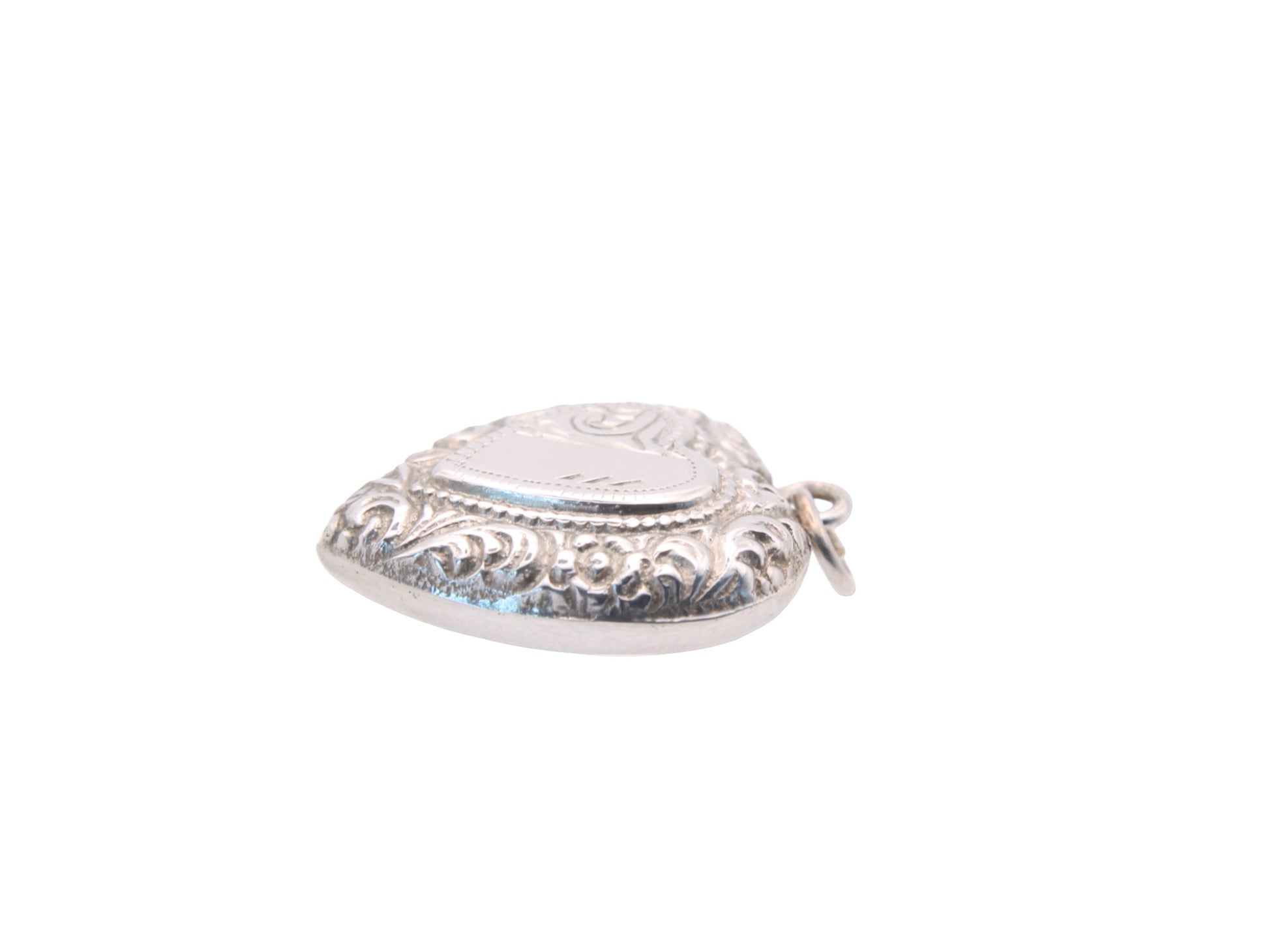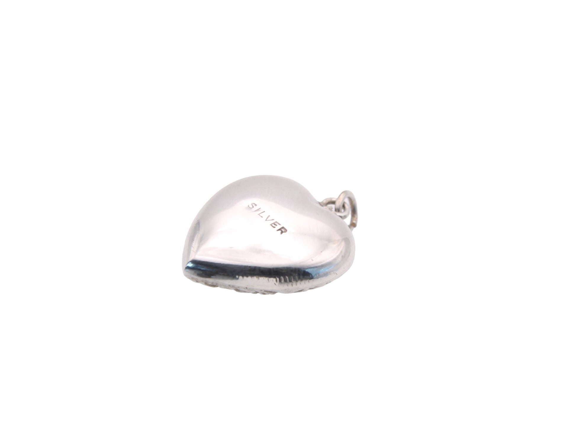 An antique sterling silver puffy heart pendant with beautiful detailing and character.