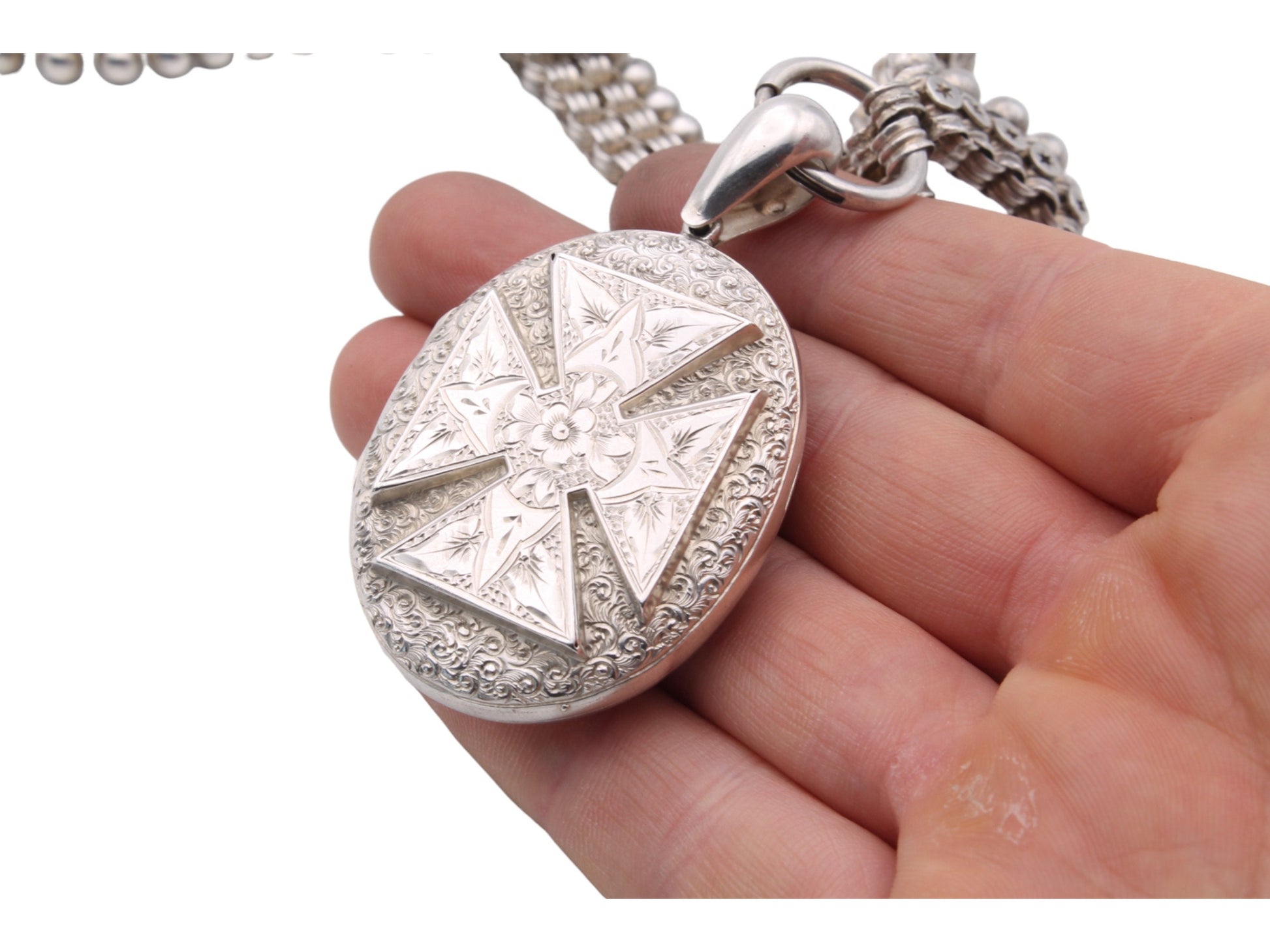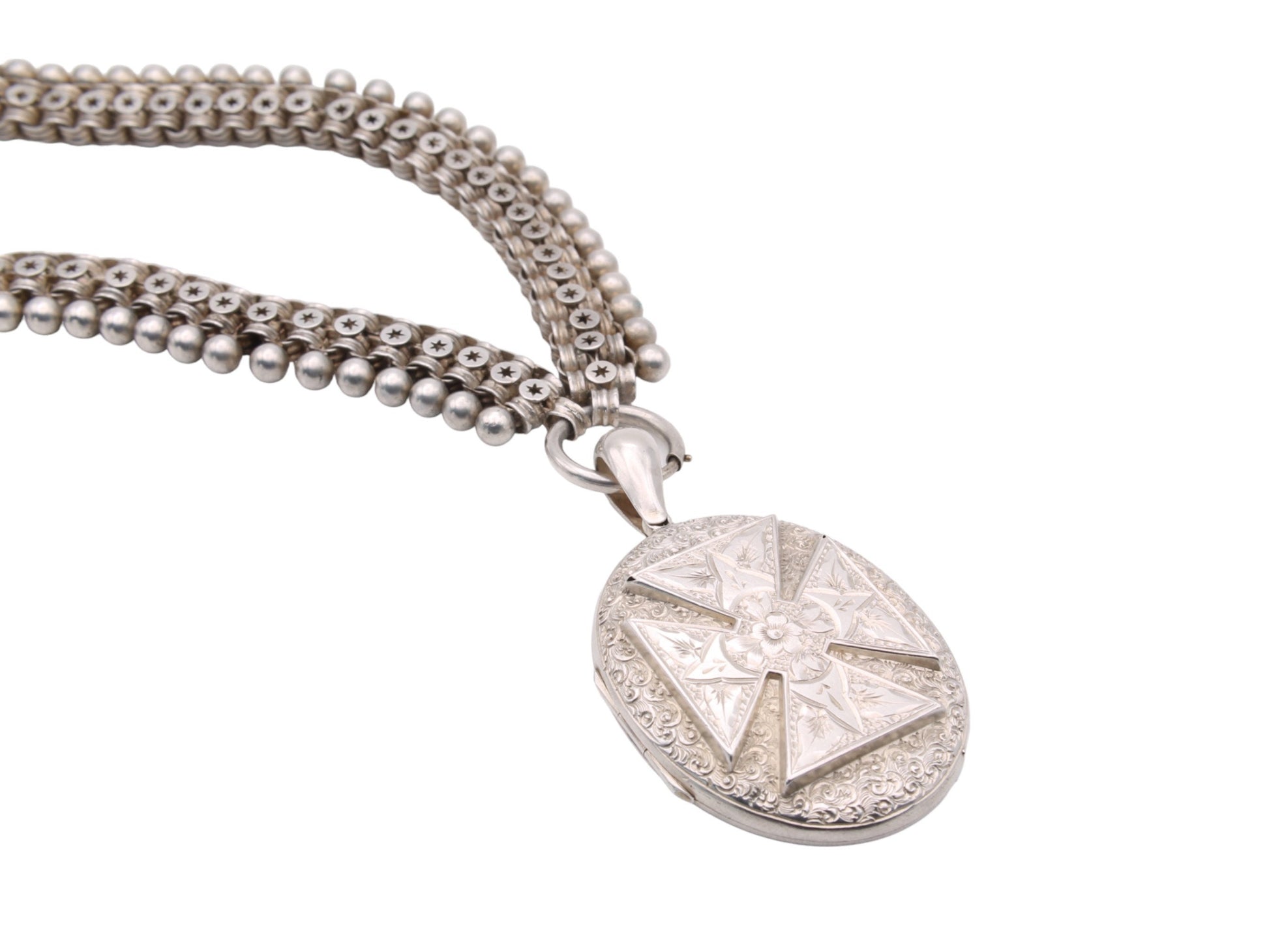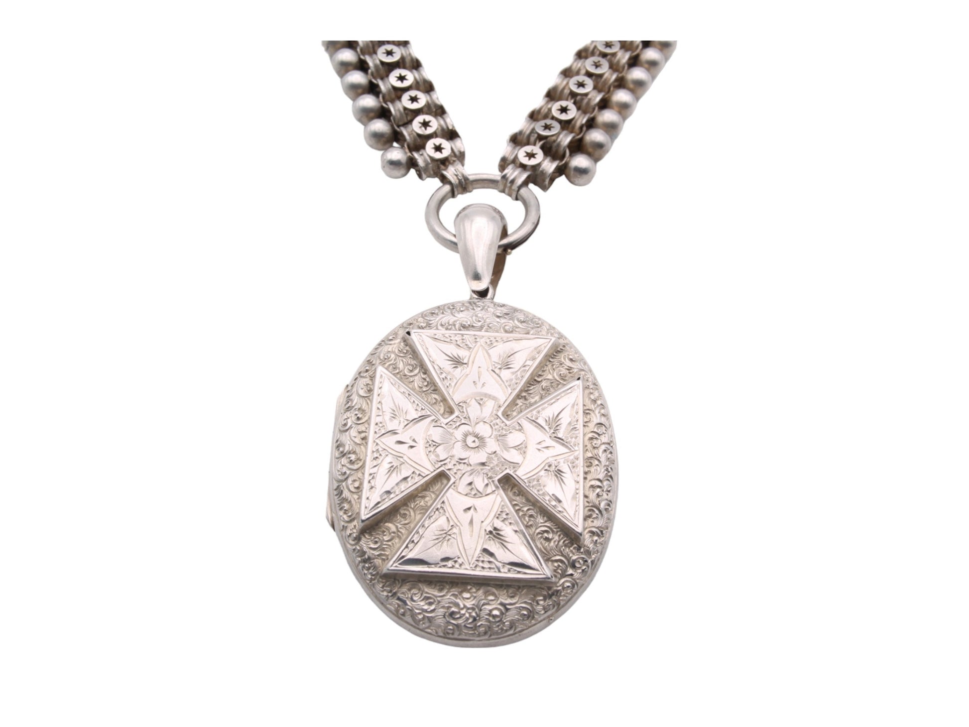 Victorian Sterling Silver Book Chain Locket Necklace: Maltese Cross, Forget-Me-Not