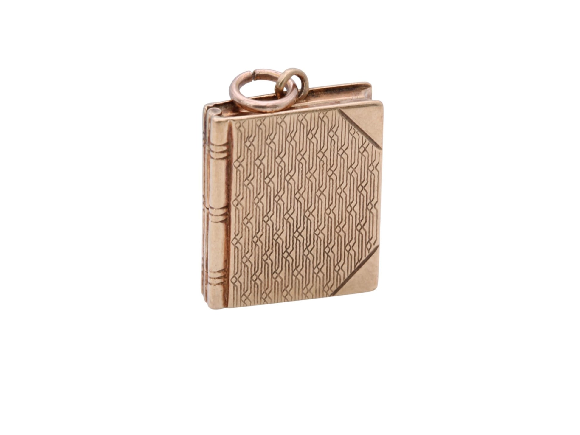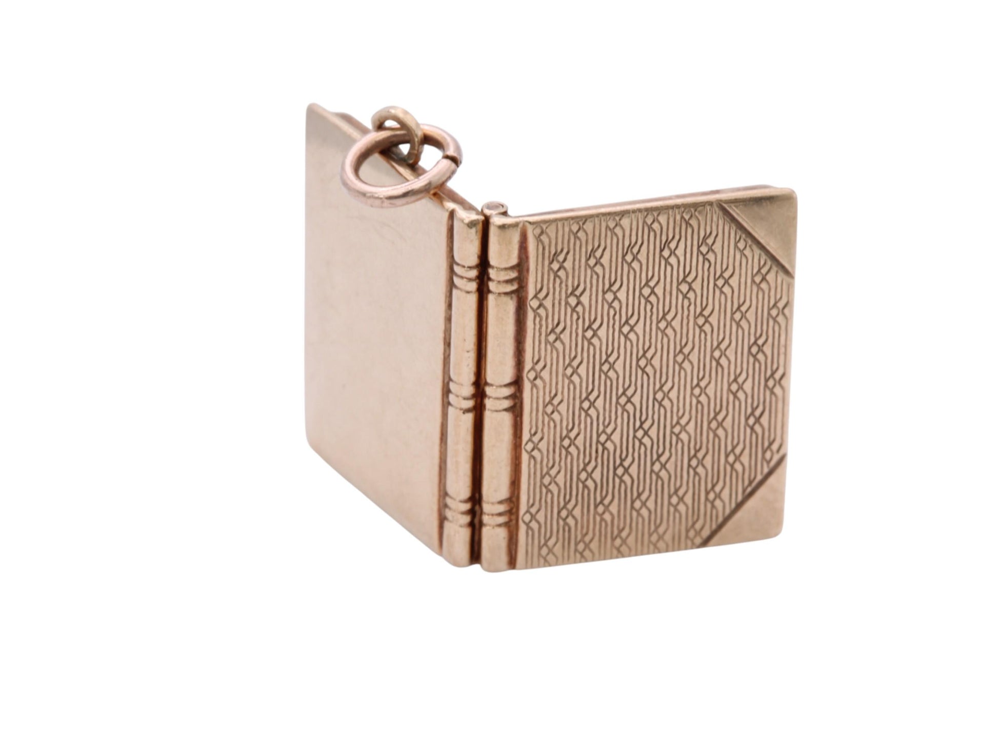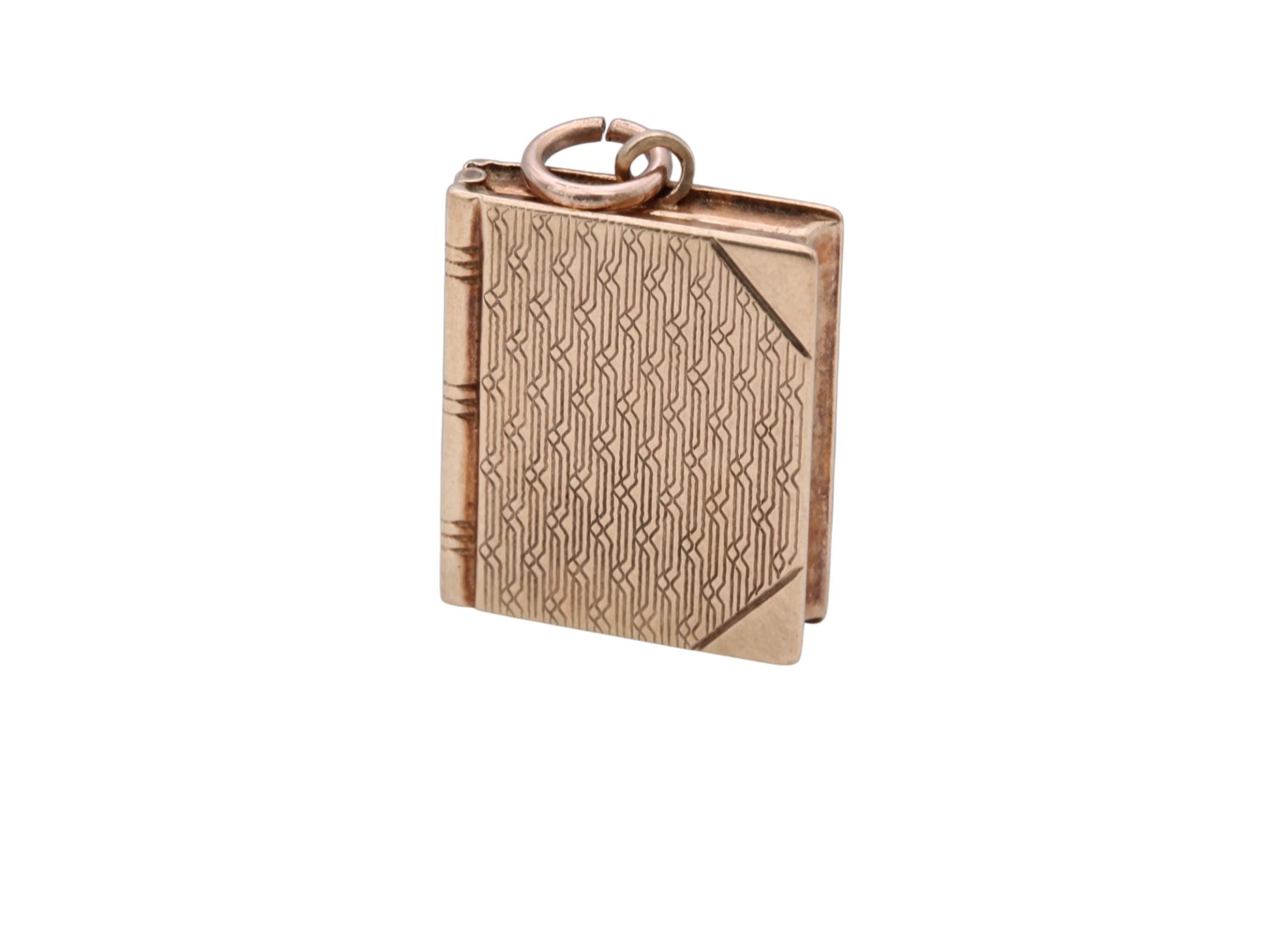 A charming vintage 10ct gold book-shaped locket, dating to circa 1950. Beautifully crafted with intricate detail, the locket is designed in the form of a miniature book, complete with a textured spine and cover detailing that captures the warmth and sentiment of mid-century jewellery design.