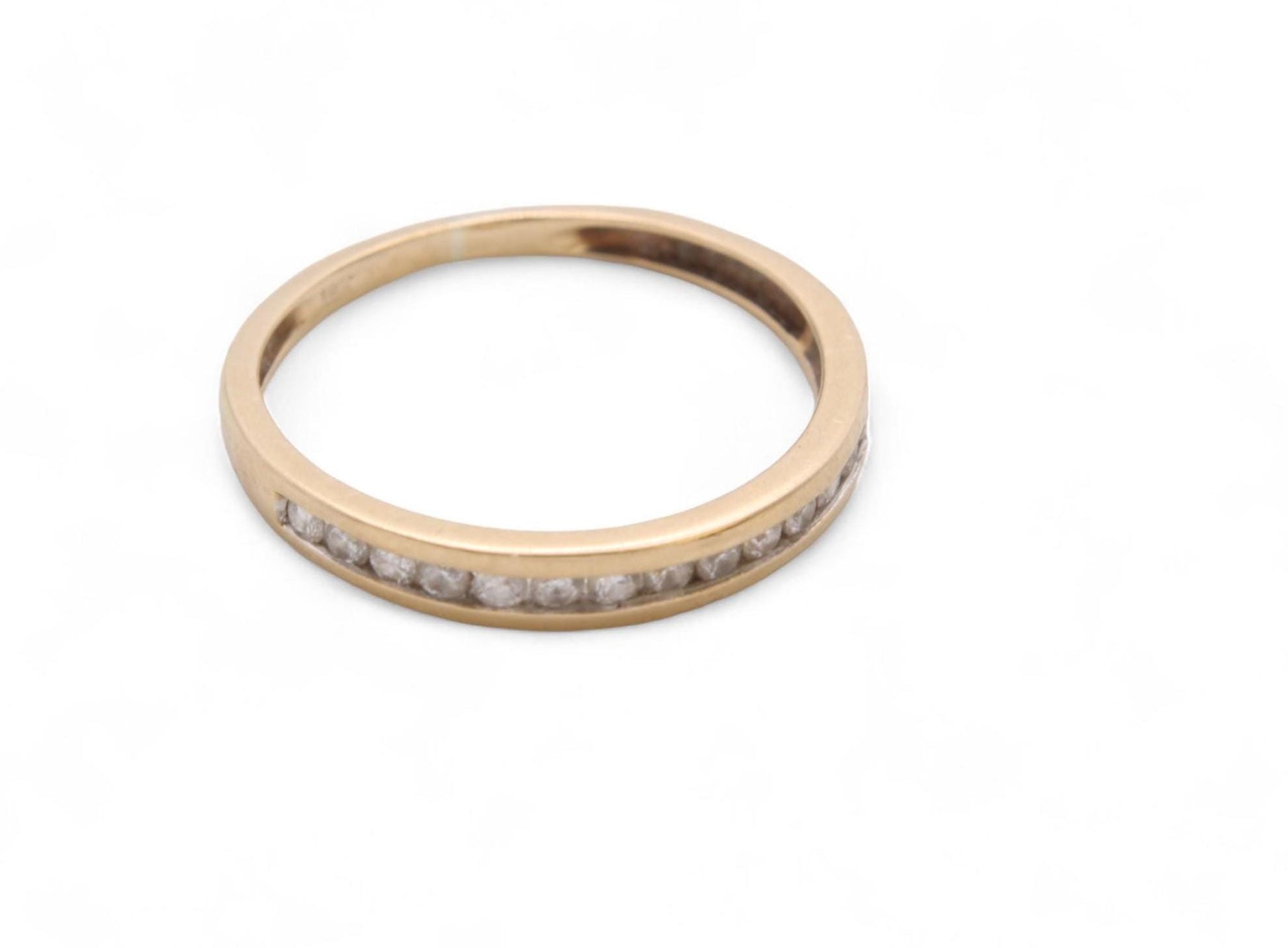 A vintage 18ct gold half eternity diamond band. This exquisite ring features a continuous row of sparkling diamonds set in a rich 18ct gold band, symbolizing enduring love and commitment. Each diamond is meticulously placed, capturing the light beautifully and adding a touch of brilliance to this classic design.