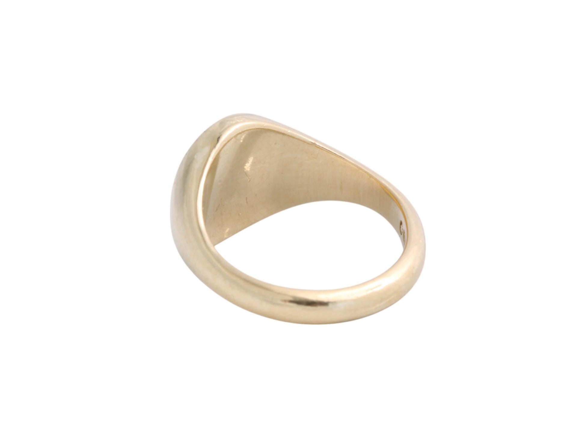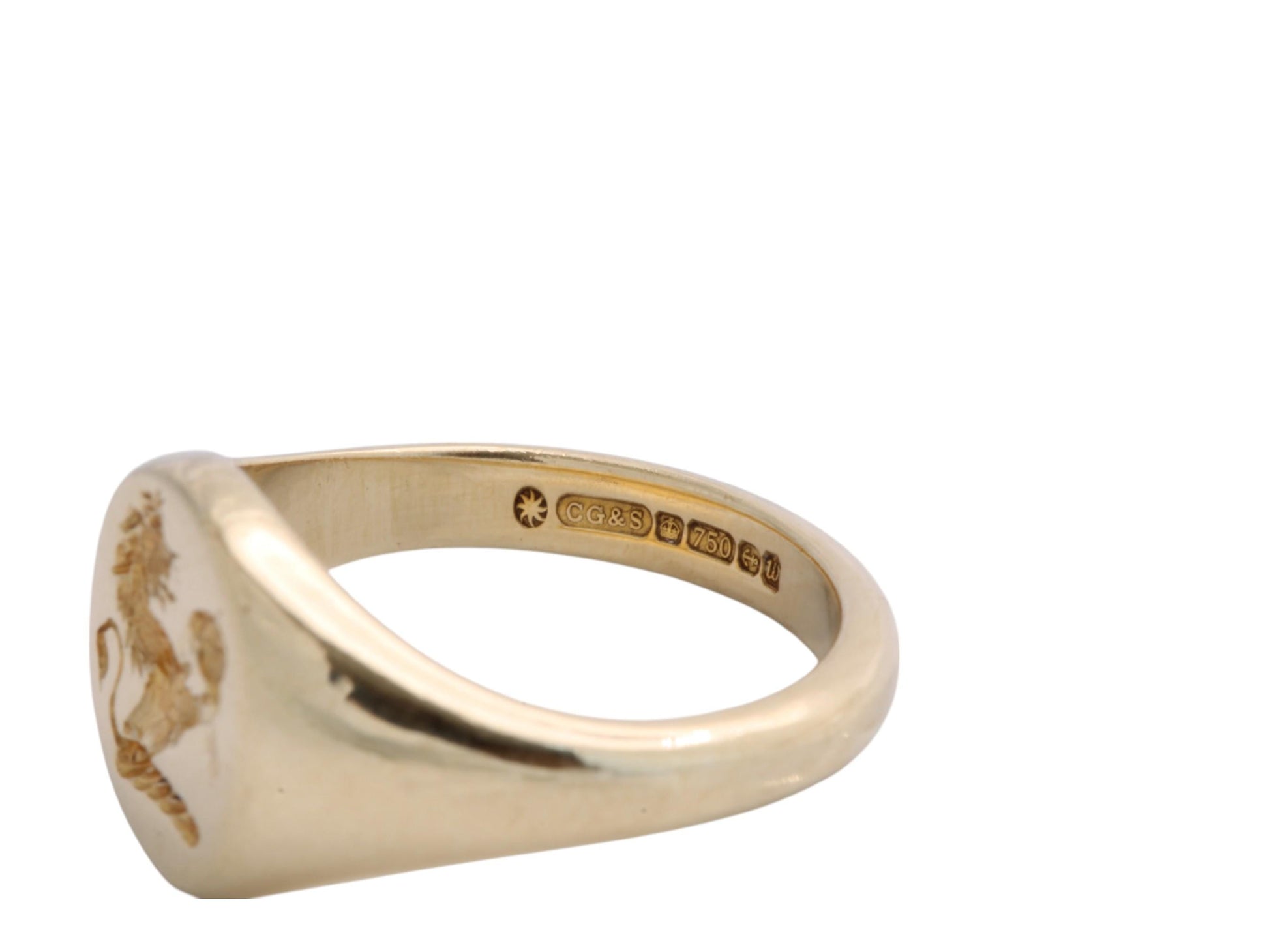 A striking vintage 18ct yellow gold intaglio signet ring featuring a powerful image of a roaring lion holding a globe. Beautifully hand-carved into solid gold, the intaglio captures the bold symbolism of strength and authority. The solid gold setting has a bold, classic profile and carries full hallmarks for the Birmingham Assay Office, with a date letter ‘w’ confirming it was made in 1996. A unique and impressive piece, perfect for daily wear or as a symbolic gift.