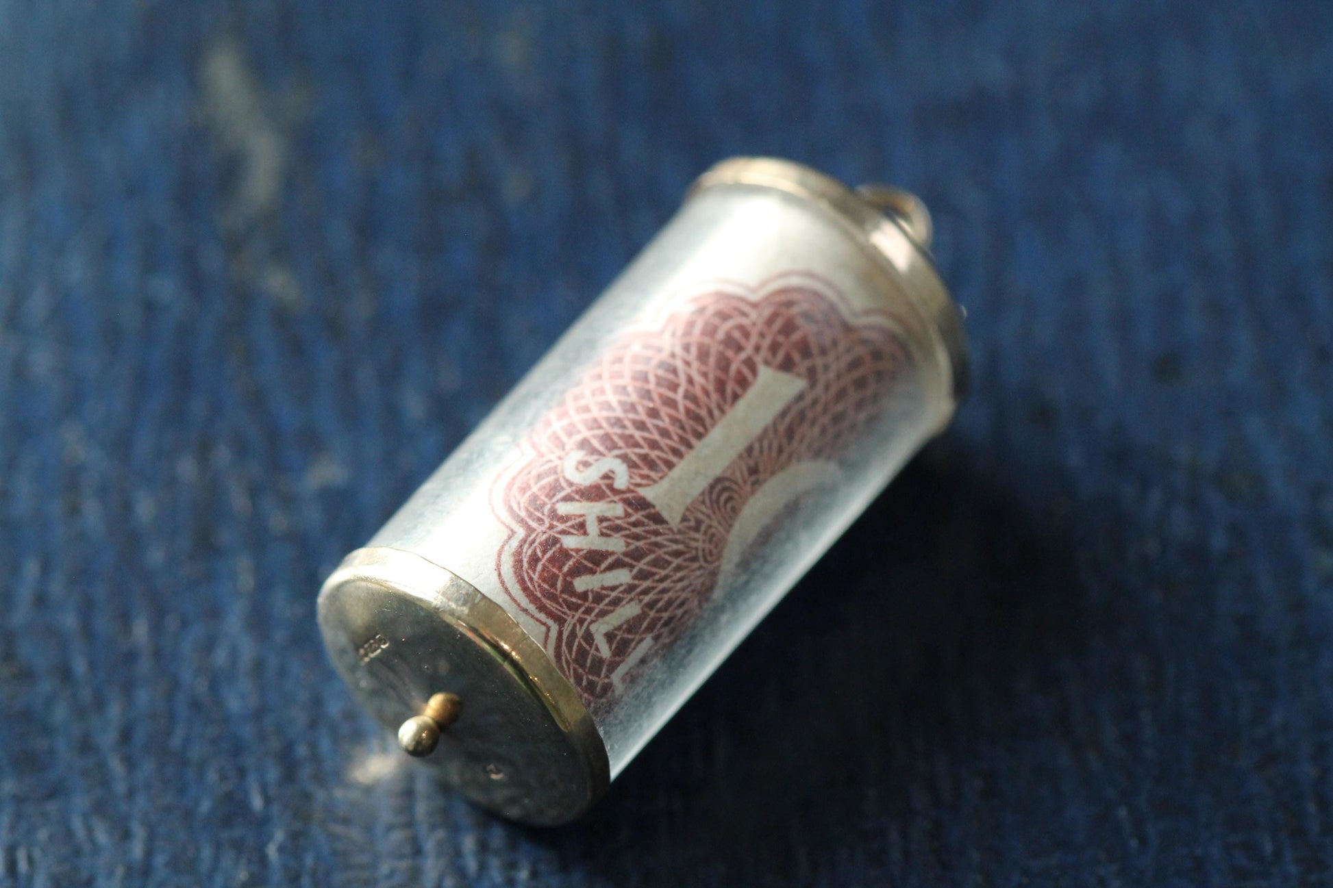 A wonderfully quirky vintage charm crafted in 9ct gold and fitted with a cylindrical glass container housing a rolled 10 shilling note. The piece is topped and bottomed with 9ct gold mounts, and the glass tube is etched with “Emergency – Break Glass” giving it that perfect novelty appeal. An unusual and highly collectible charm, full of mid-century character and a brilliant talking piece for any bracelet or pendant chain.