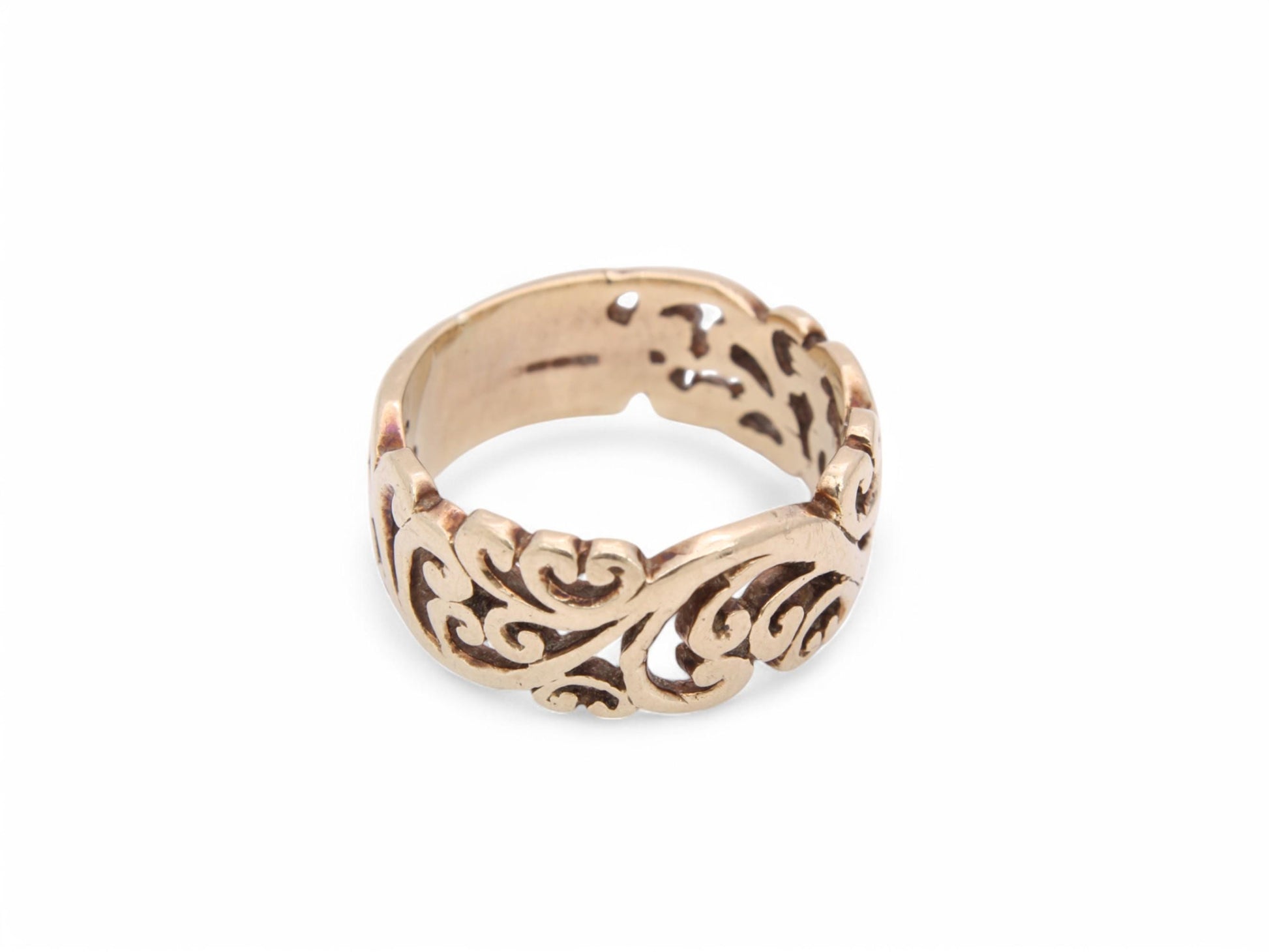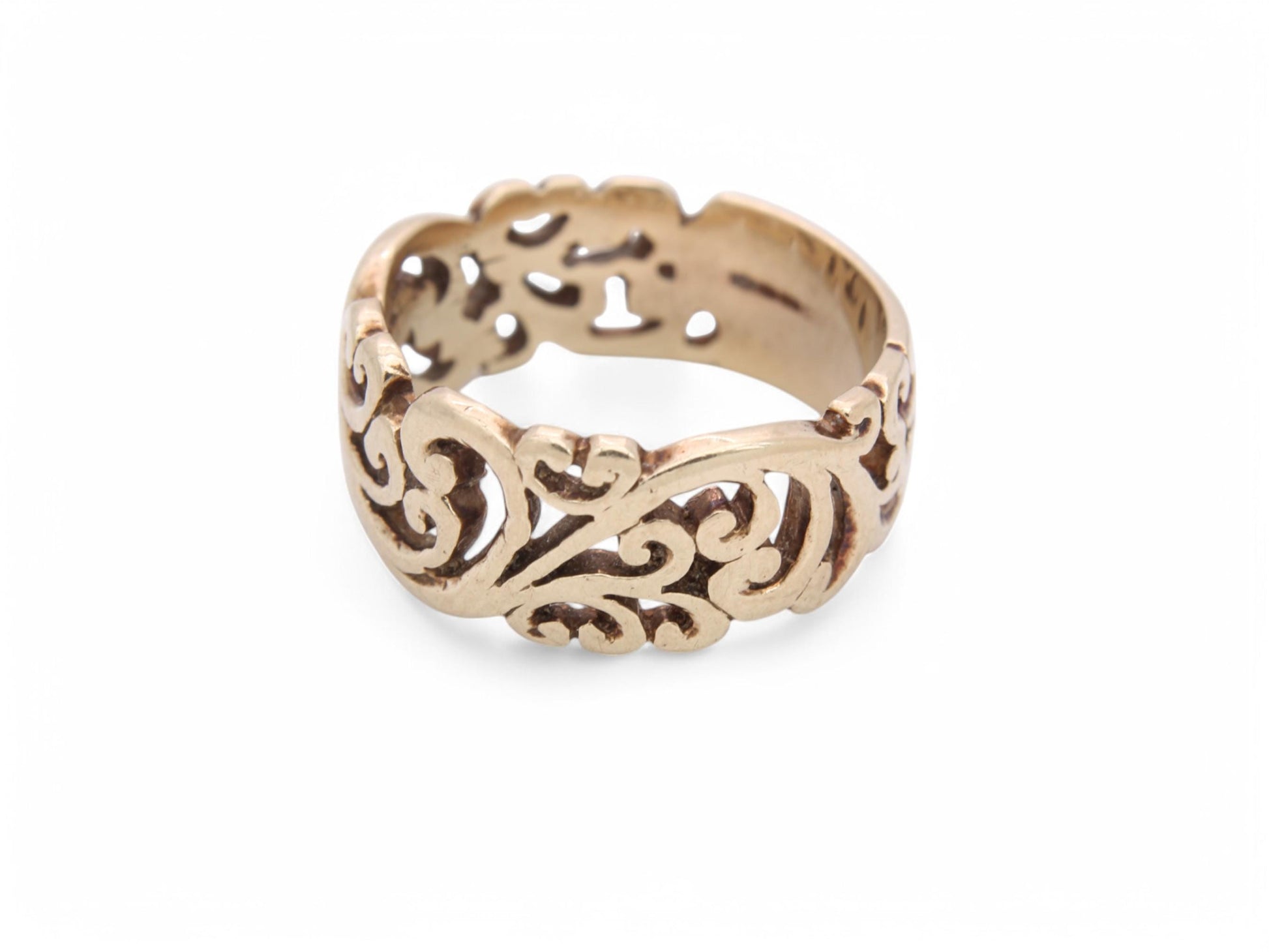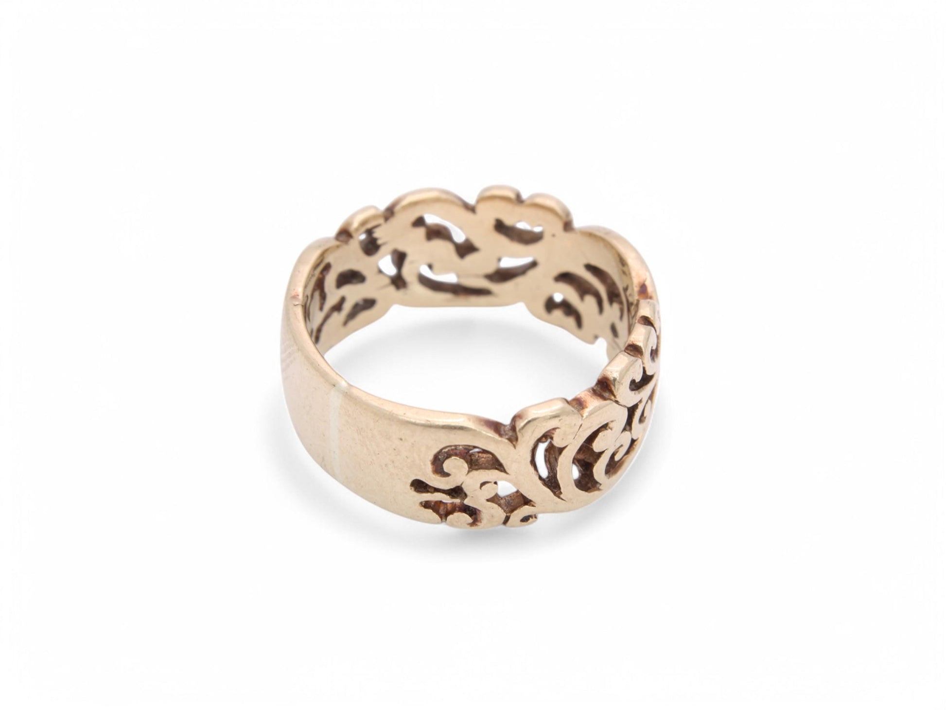 This vintage 9ct gold ring is a bold and beautifully crafted piece, featuring a chunky design with an intricate cut-out floral decoration within the band. The openwork floral motif adds a delicate contrast to the solid gold structure, creating a unique blend of elegance and statement style.