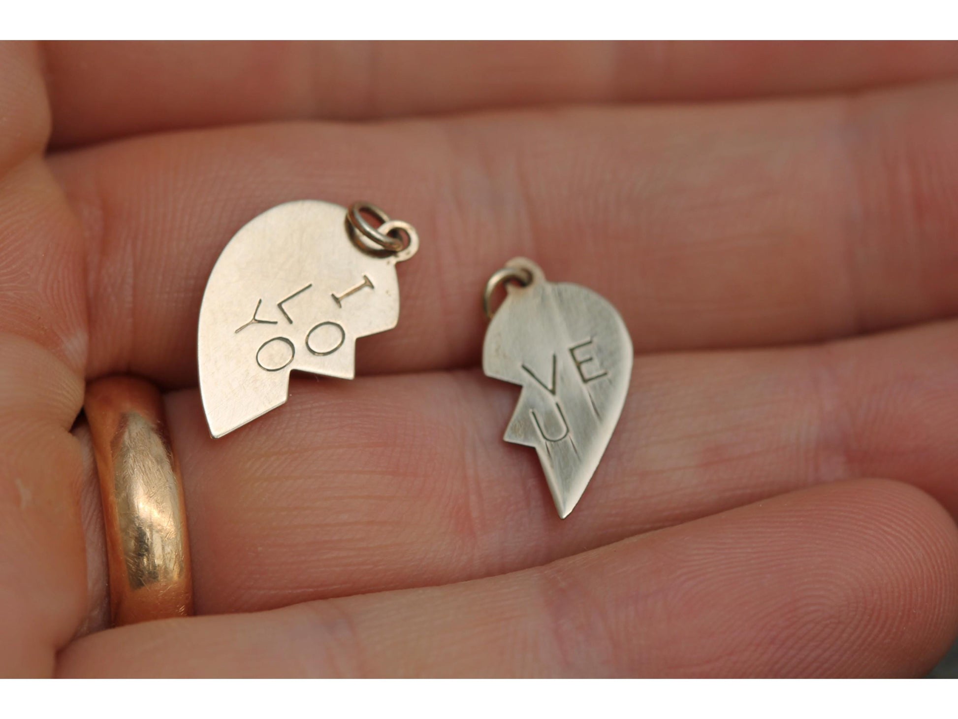 A charming vintage 9ct yellow gold heart-shaped pendant dating to circa 1960. This sentimental piece is engraved with the words "I LOVE YOU" across the front and is cleverly designed to split into two separate halves—perfect for sharing between two people. Each half features a jump ring for easy wear as individual pendants, symbolising love, connection, and togetherness even when apart.