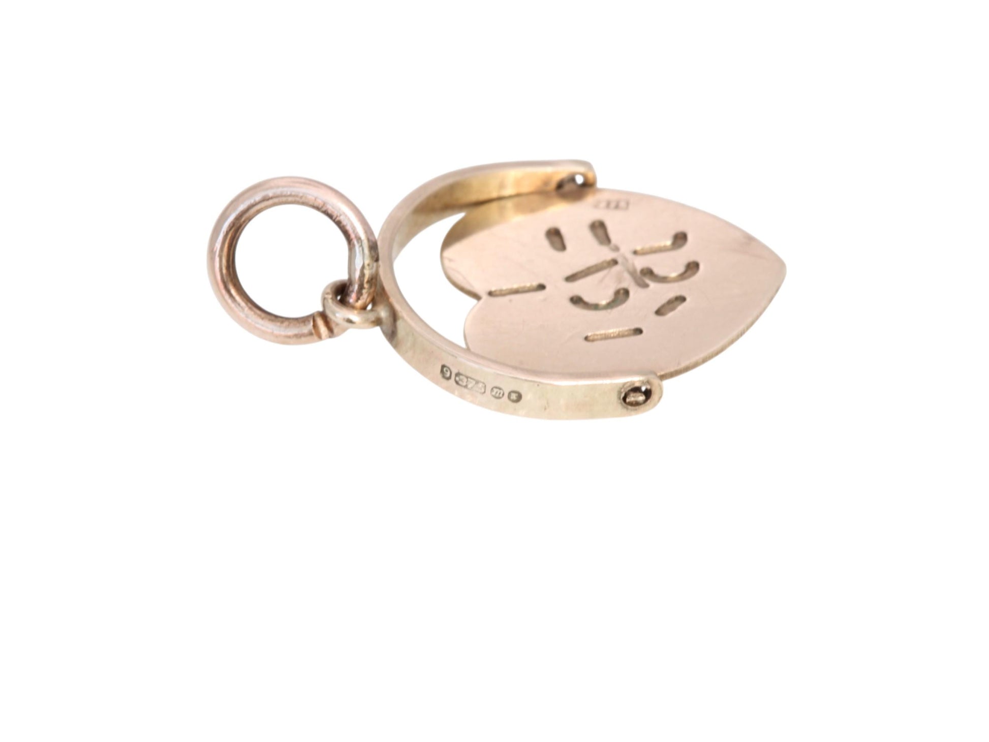 A delightful vintage 9ct gold heart shaped spinning charm that appears unreadable—until it spins! With a playful twist, it reveals a sweet hidden message, making it both quirky and endearing.